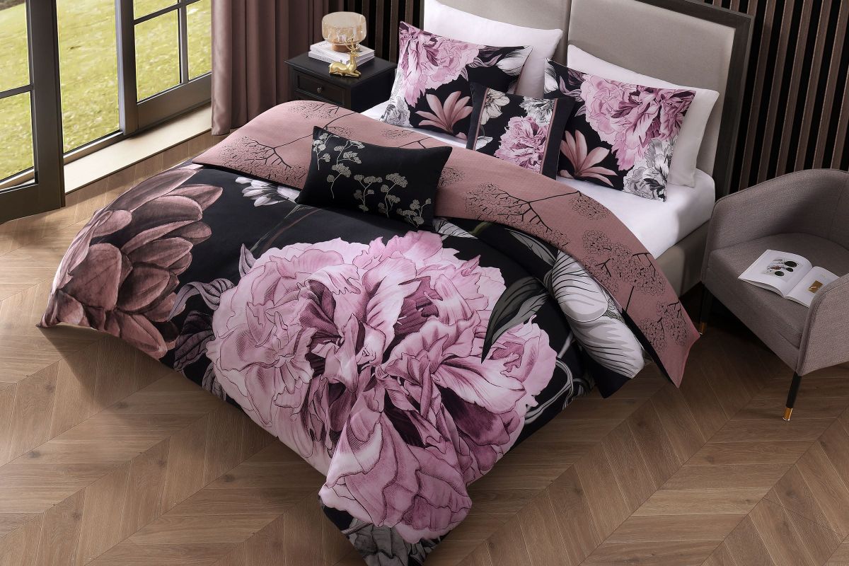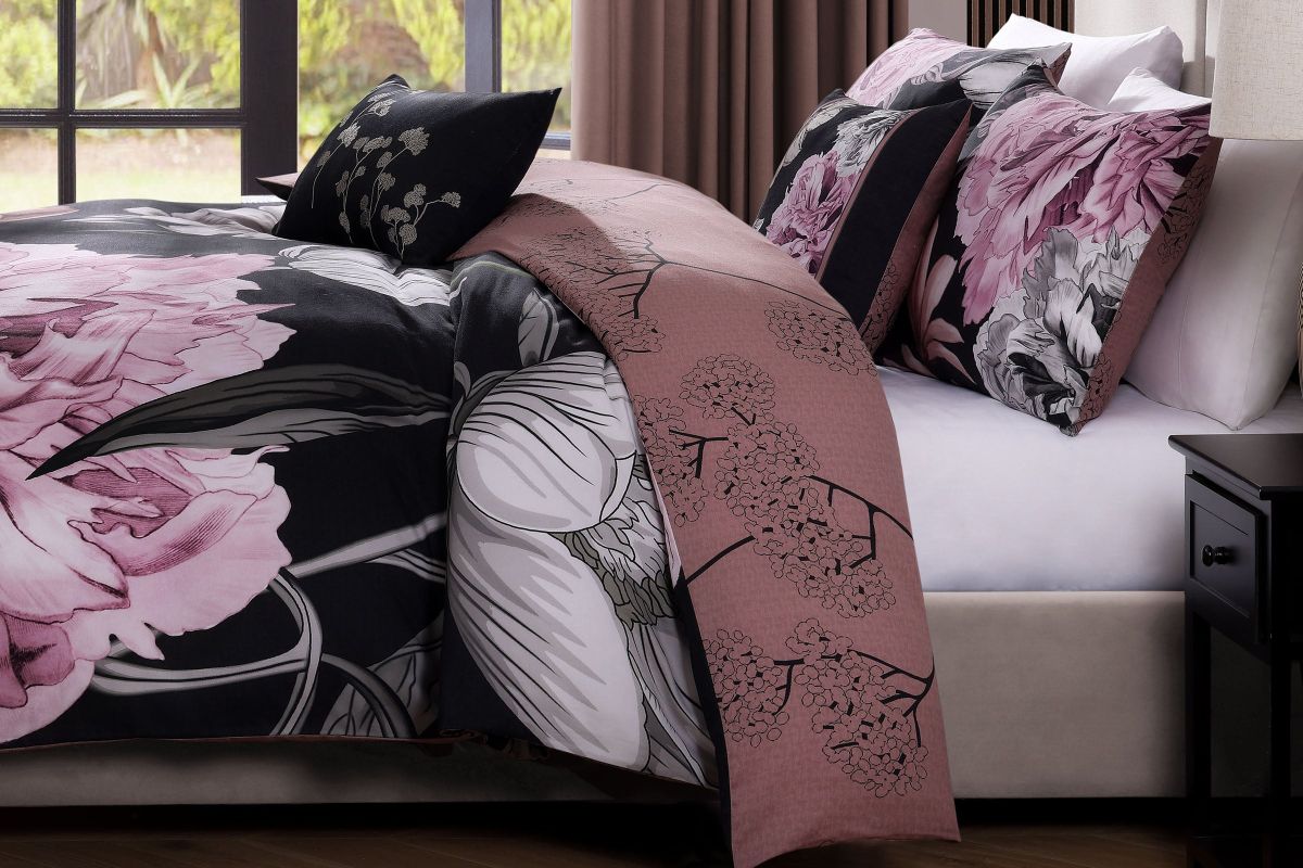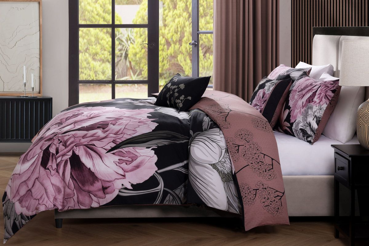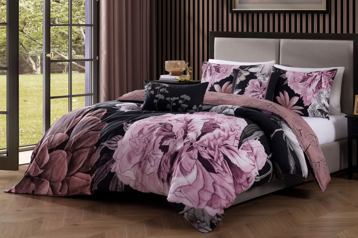 - Comforter Front- Pink and grey floral print over dark printed textured black background