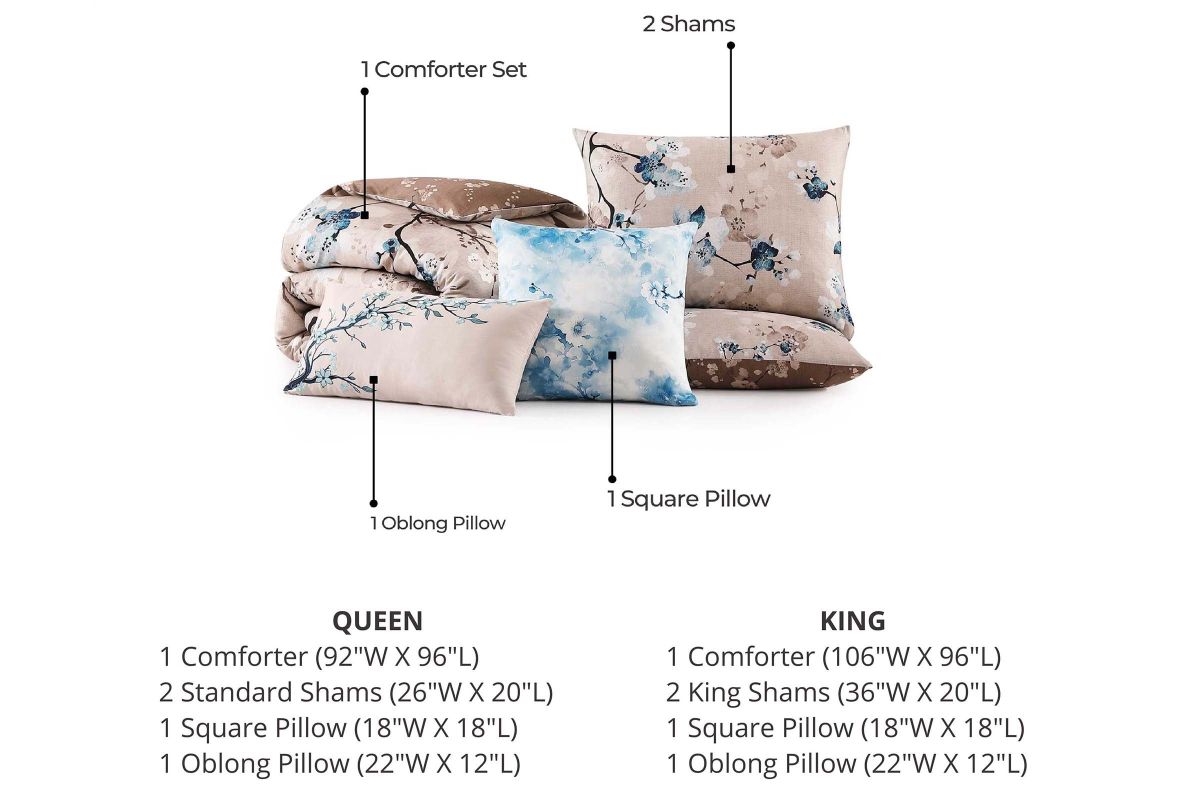 - Set Includes- 1 Comforter (92"W x 96"L), 2 Standard Shams (26"W x 20"L), 1 Printed Square Pillow (18"W x 18"L), 1 Embroidered Oblong Pillow (22"W x 12"L).