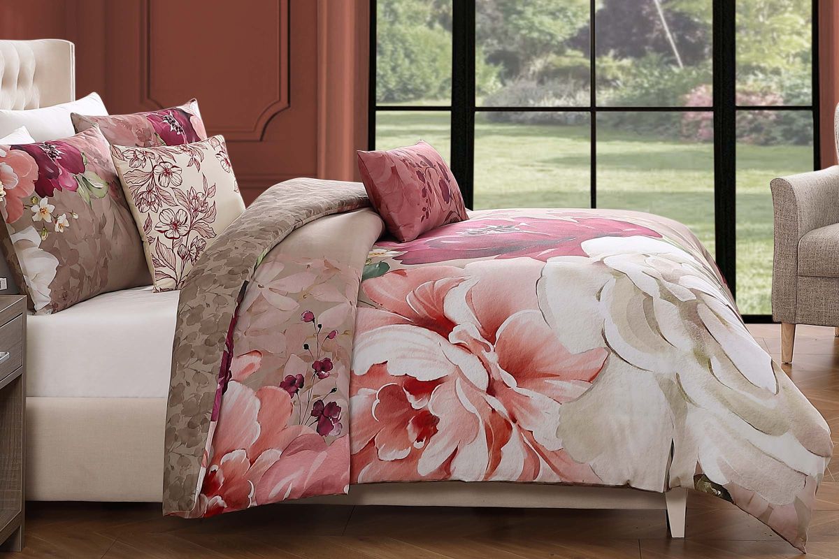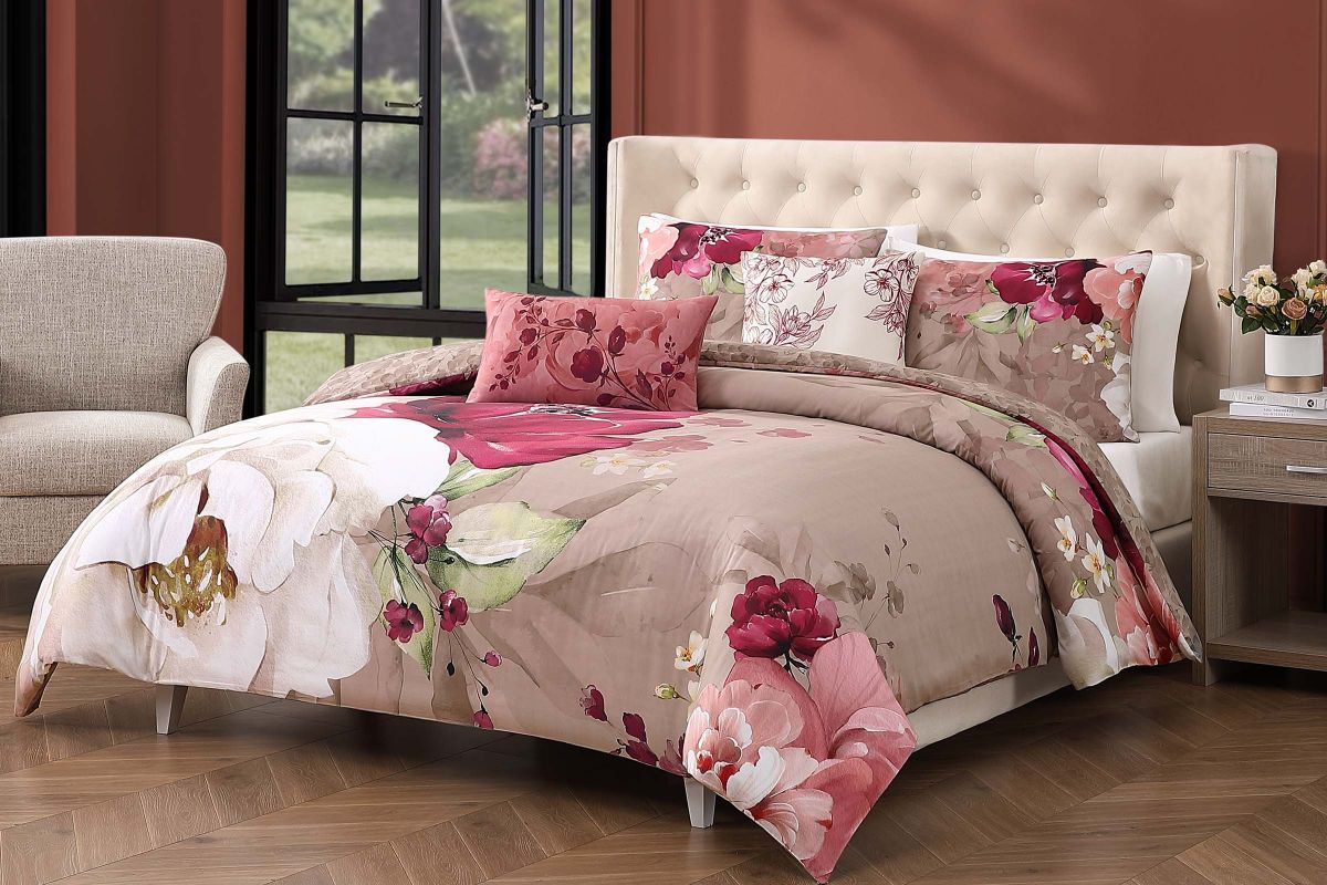 Grand flowers in calming, warm tones of wine, blush and ivory sit on a printed linen texture, the color of sand dunes, for the Bebejan Florence 5 Piece Reversible Comforter Set. The reverse print has a subtle tonal leaf print that coordinates beautifully with the front, but can be used as a second look for your bedroom. The comfy 100% cotton sateen comforter set also includes 2 shams, a gorgeous cinnamon toned floral 22" x 12" oblong pillow, and an 18" x 18" square pillow with stunning, wine colored, embroidered flowers on an ivory background.