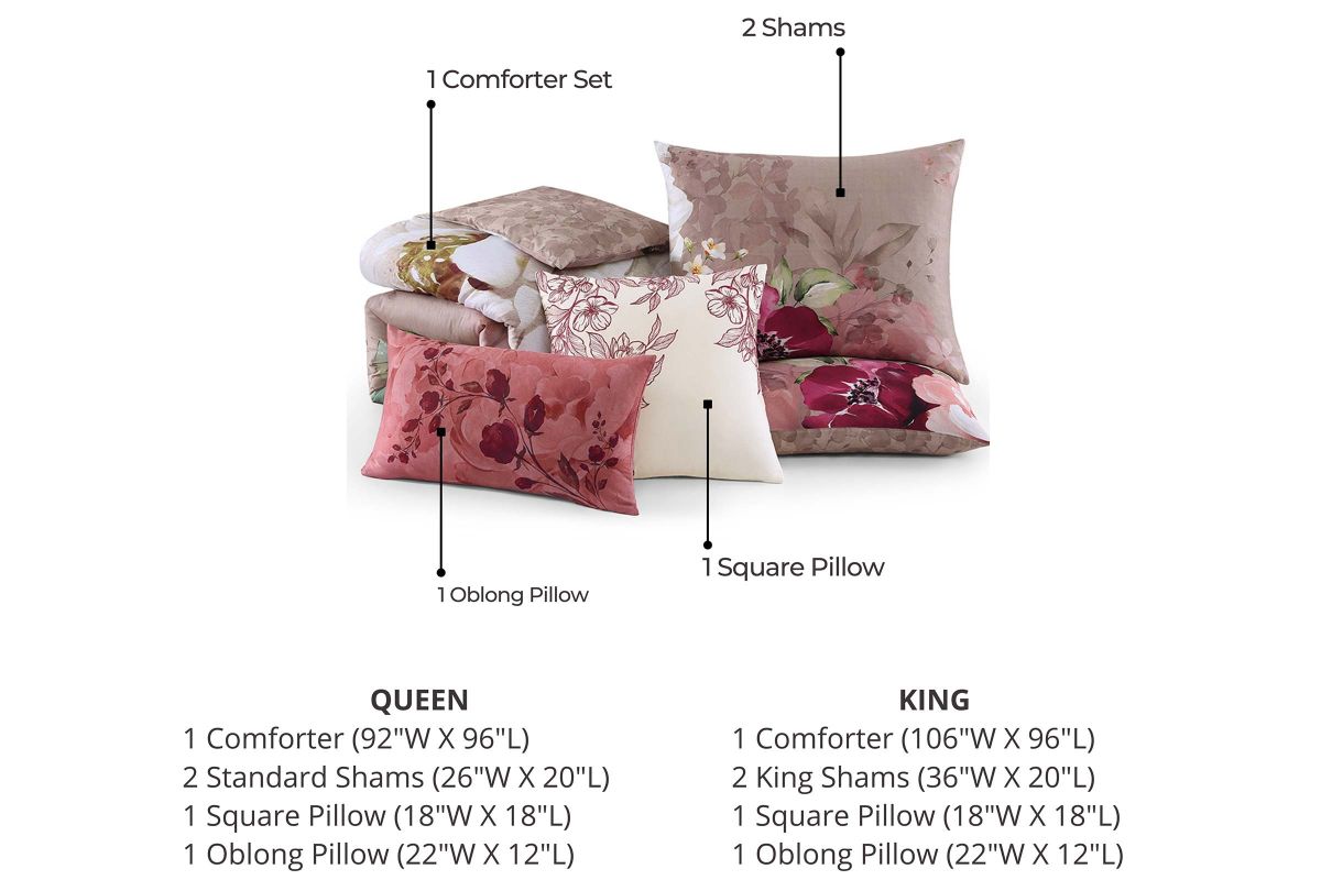 - Set Includes- 1 Comforter (106"W x 96"L), 2 King Shams (36"W x 20"L), 1 Embroidered Square Pillow (18"W x 18"L), 1 Printed Oblong Pillow (22"W x 12"L).