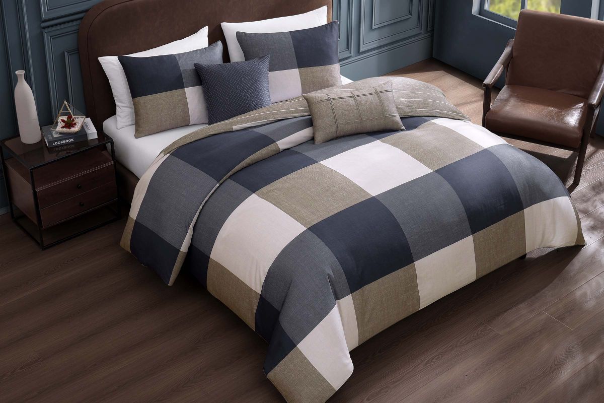 - Comforter Front- Masculine tones of navy and tan weave in and out of this printed plaid pattern