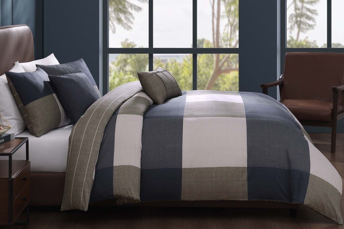 - Comforter Front- Masculine tones of navy and tan weave in and out of this printed plaid pattern
