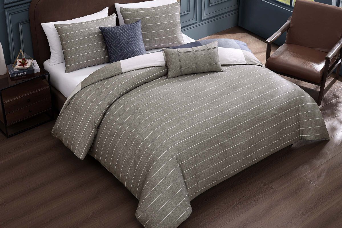 - Comforter Reverse- Classic printed pinstripe in fabric-textured tan on the reverse