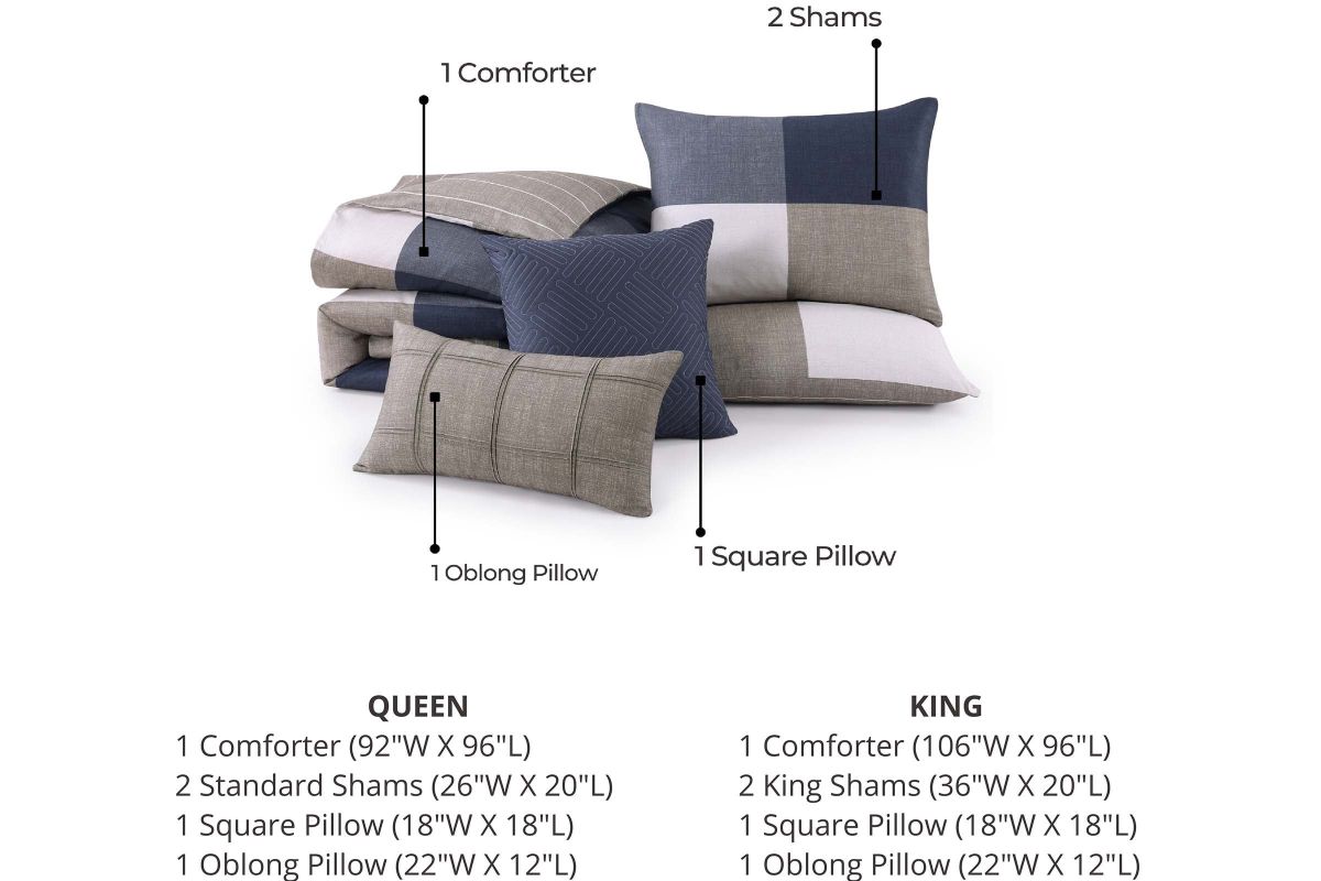 - Set Includes- 1 Comforter (106"W x 96"L), 2 King Shams (36"W x 20"L), 1 Quilted Square Pillow (18"W x 18"L), 1 Pintucked Oblong Pillow (22"W x 12"L).
