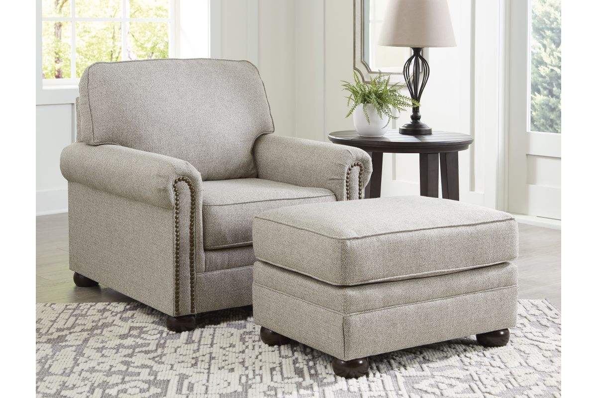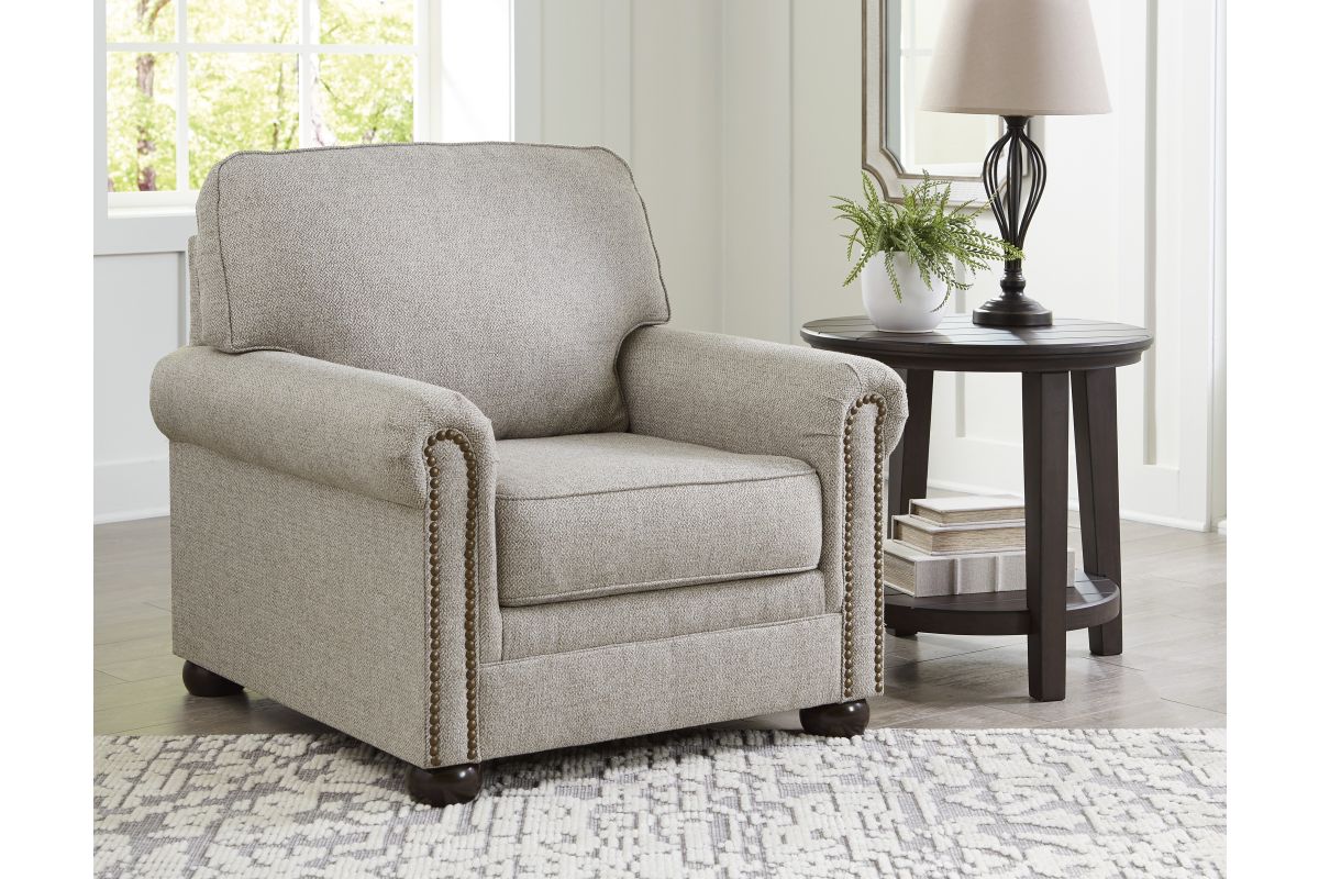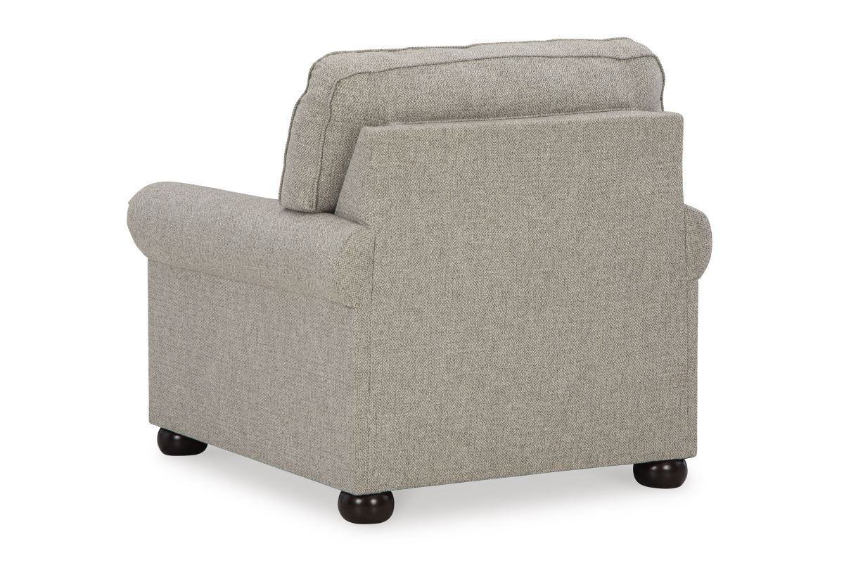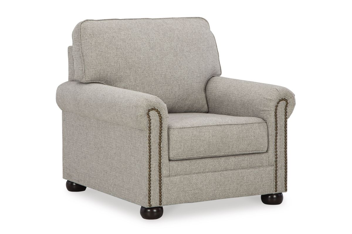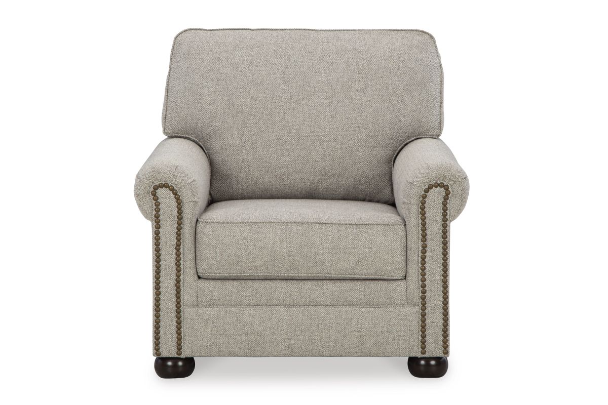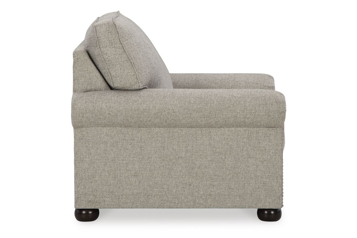 Inspired by the past but rooted firmly in the present, this chair complements your transitional seating area. Its versatile upholstery is delightfully detailed for a subtle herringbone effect. Designer touches like decorative nailhead trim and bun legs add traditional character. With this chair's reliable style and comfort, all you need to do is sit back and relax.
