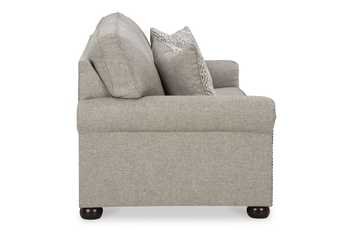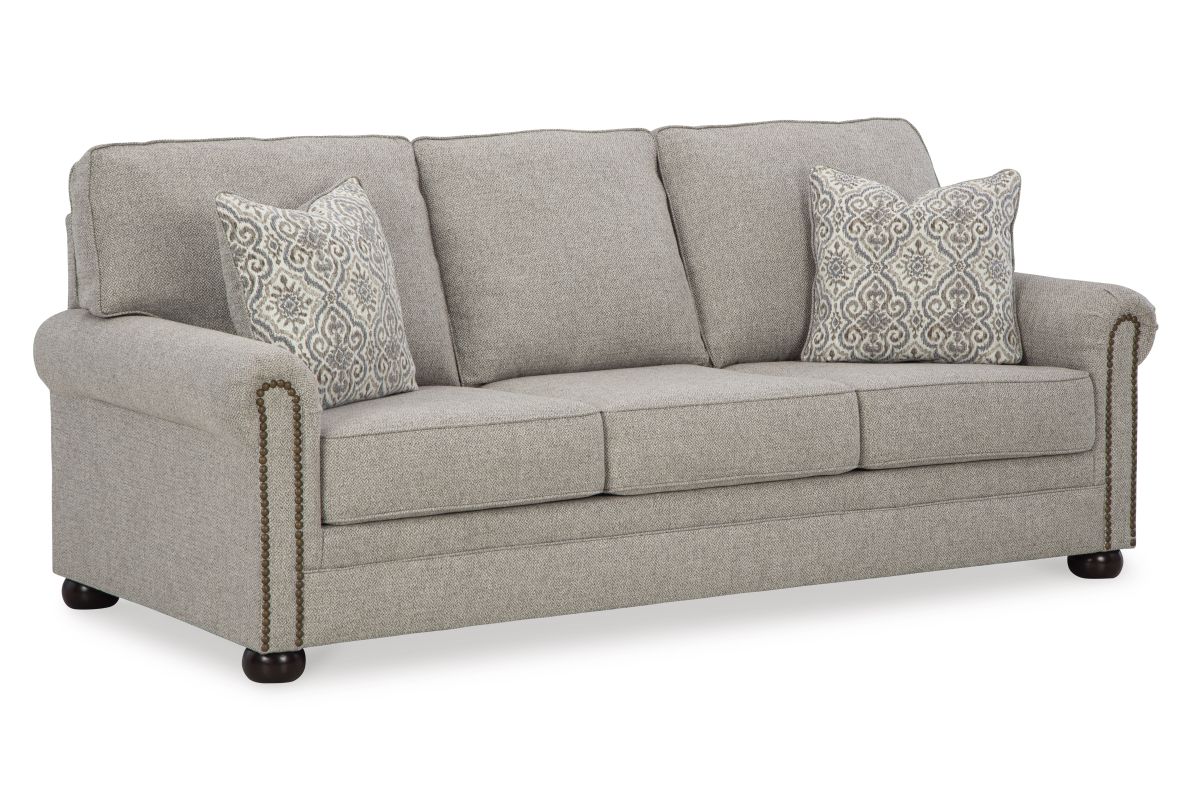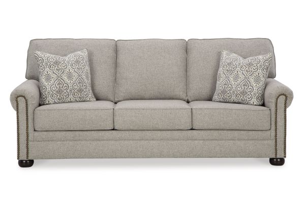 Inspired by the past but rooted firmly in the present, this queen sofa sleeper complements your transitional seating area. Its versatile upholstery is delightfully detailed for a subtle herringbone effect. Designer touches like decorative nailhead trim and bun legs add traditional character. A handy pull-out mattress brings must-have function. With this sofa sleeper's reliable style and comfort, all you need to do is sit back and relax.