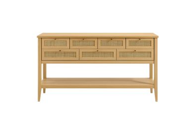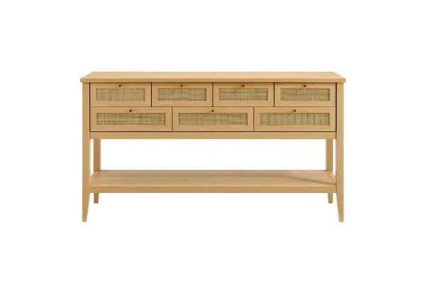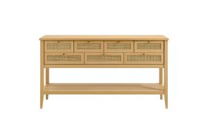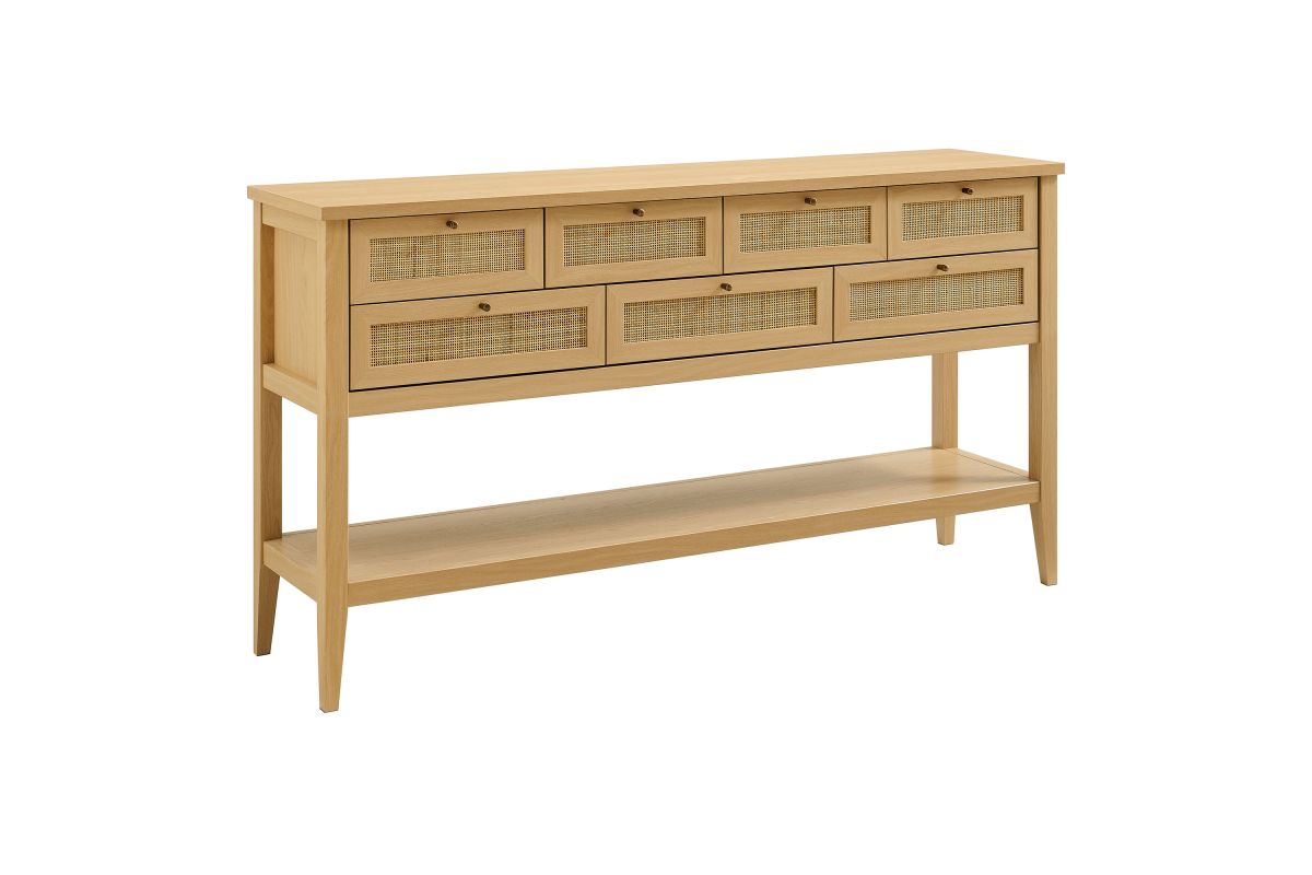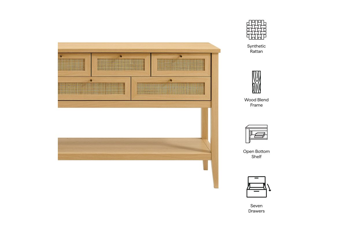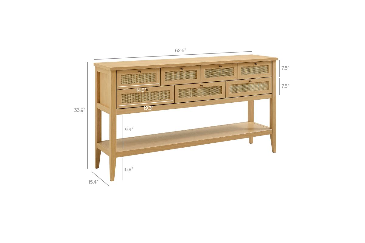 Introduce refreshing style to your living space with the Soma 62 inch Console Table. Showcasing a beautiful synthetic rattan weave on the drawer fronts, this narrow console works well as an entry console table, a console table behind the couch, or a small hallway table. Made from a laminated wood blend with a natural wood grain design, Soma features seven drawers—four across the top row and three across the bottom—great for tucking everyday items away. Meanwhile, the open lower shelf offers a place for baskets, shoes, or a few favorite accents. Includes non-marking foot pads to help protect flooring. Weight Capacity: Distributed: 194lbs, Upper Drawer : 11lbs x 4, Lower Drawer : 11lbs x 3, Bottom : 154lbs.