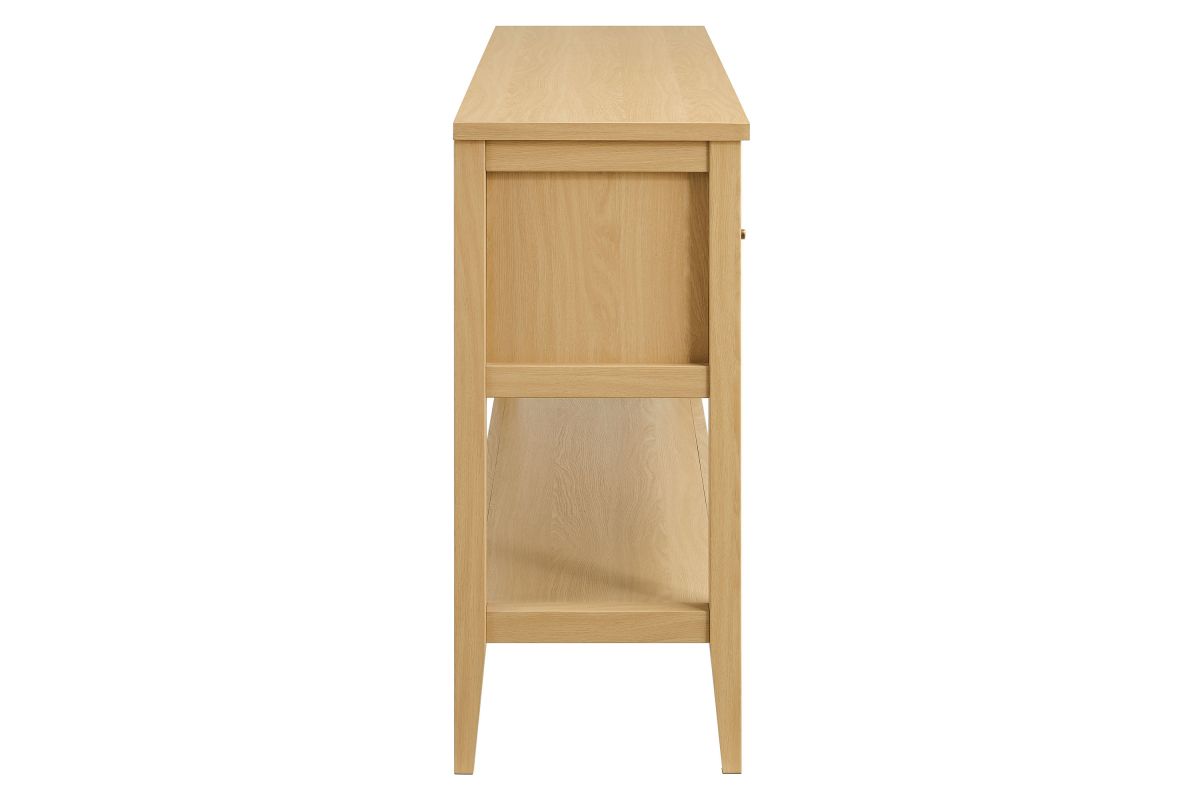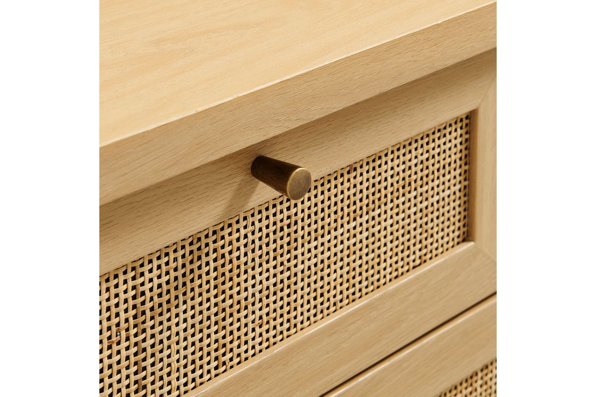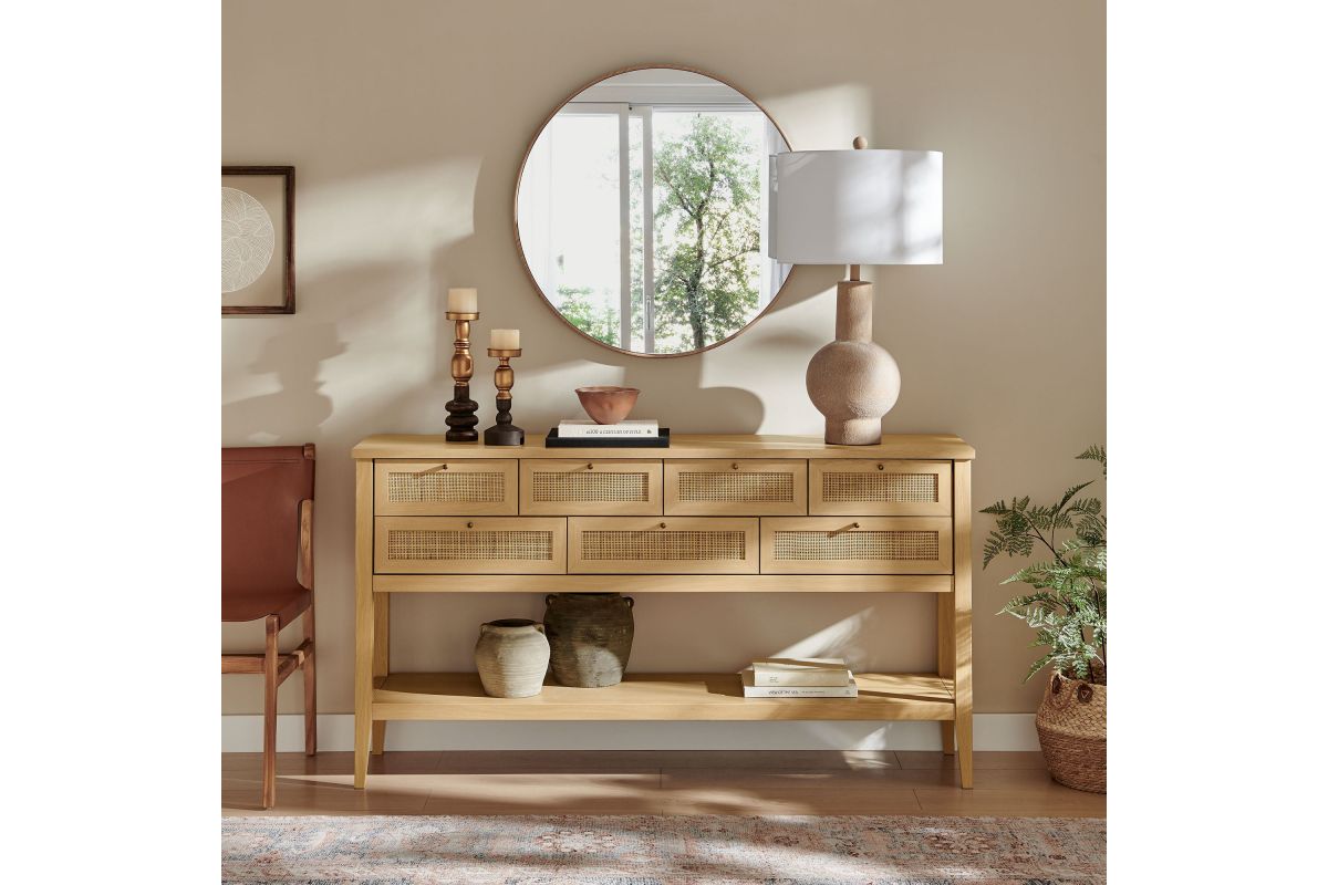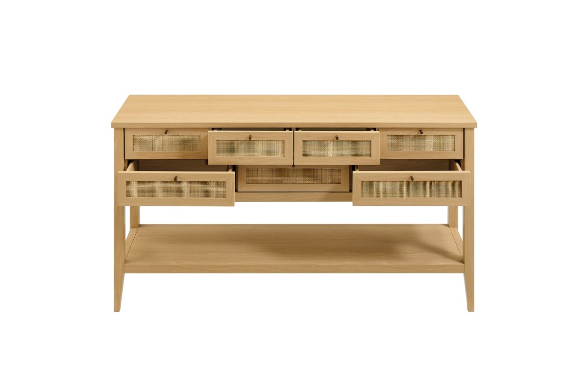 Introduce refreshing style to your living space with the Soma 62 inch Console Table. Showcasing a beautiful synthetic rattan weave on the drawer fronts, this narrow console works well as an entry console table, a console table behind the couch, or a small hallway table. Made from a laminated wood blend with a natural wood grain design, Soma features seven drawers—four across the top row and three across the bottom—great for tucking everyday items away. Meanwhile, the open lower shelf offers a place for baskets, shoes, or a few favorite accents. Includes non-marking foot pads to help protect flooring. Weight Capacity: Distributed: 194lbs, Upper Drawer : 11lbs x 4, Lower Drawer : 11lbs x 3, Bottom : 154lbs.