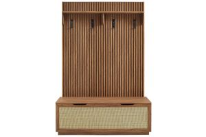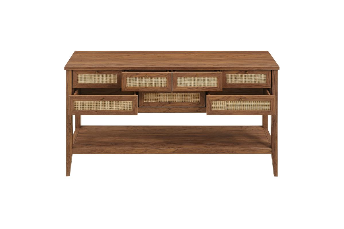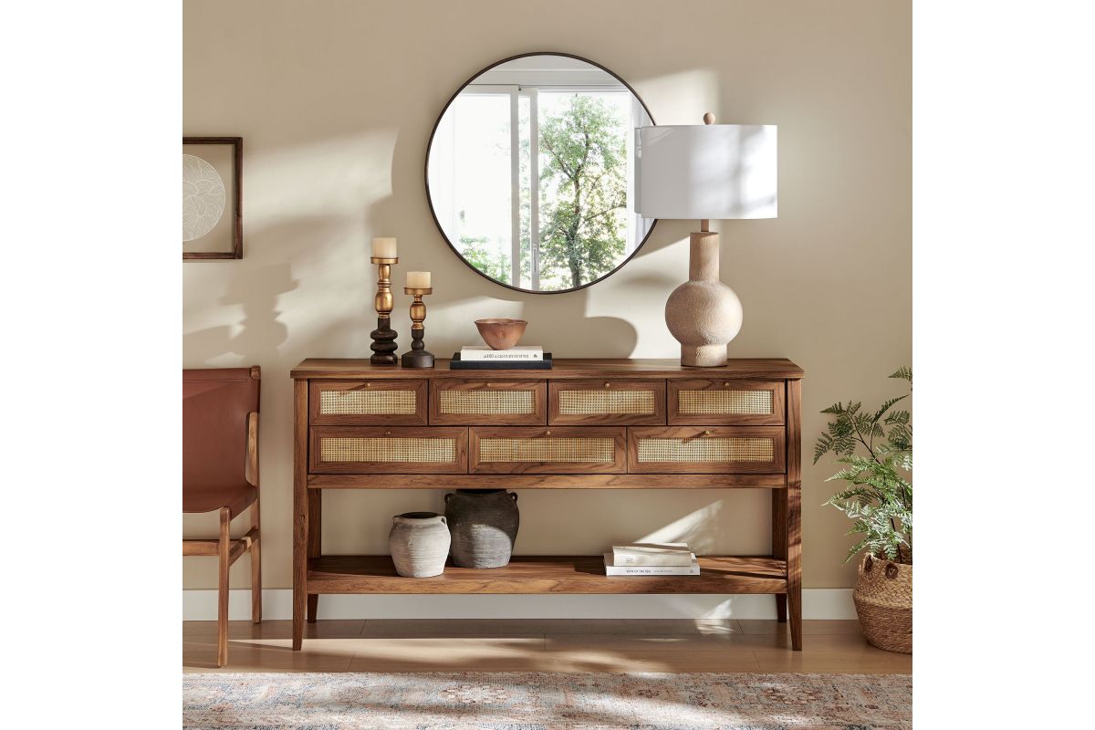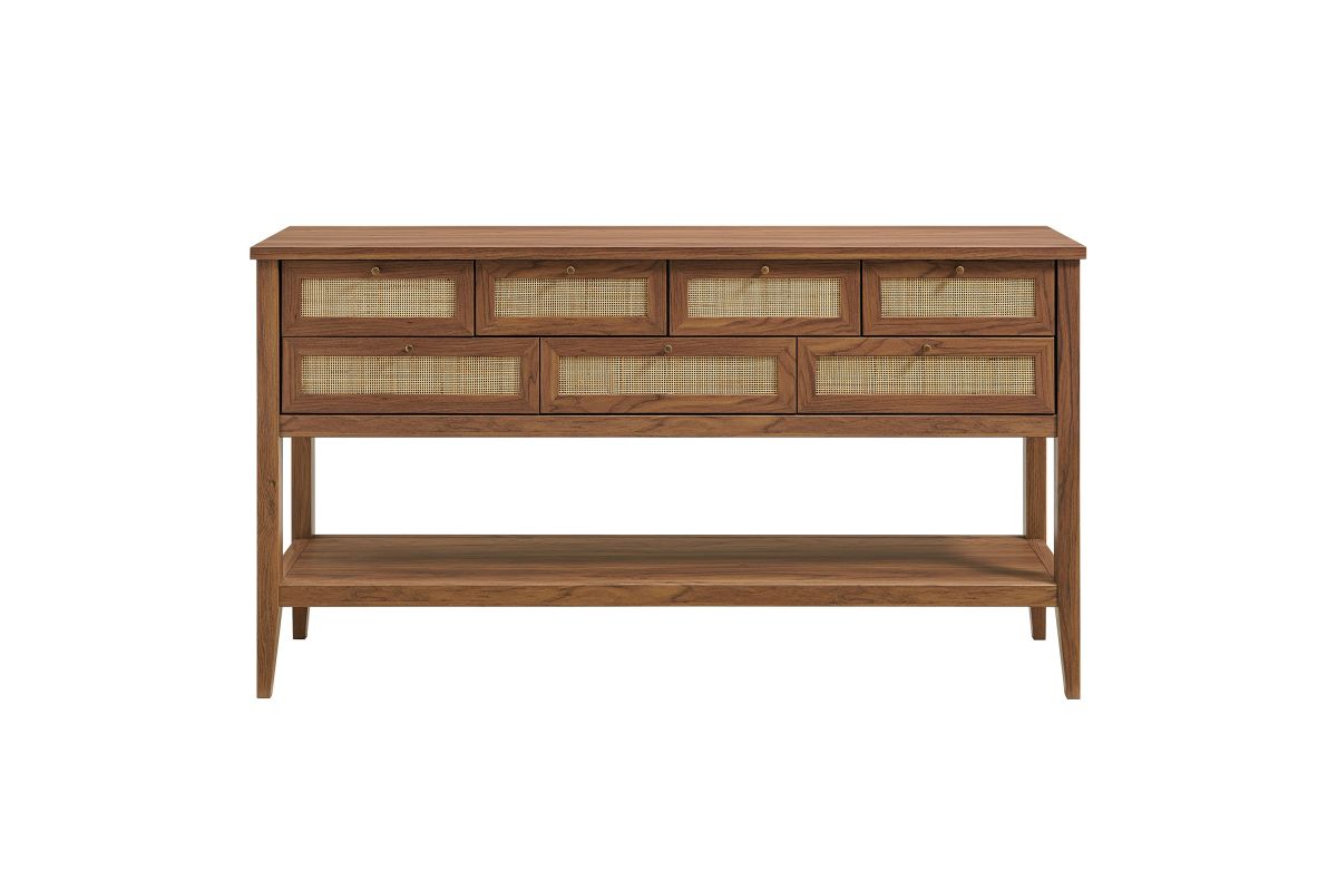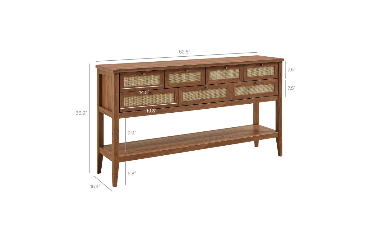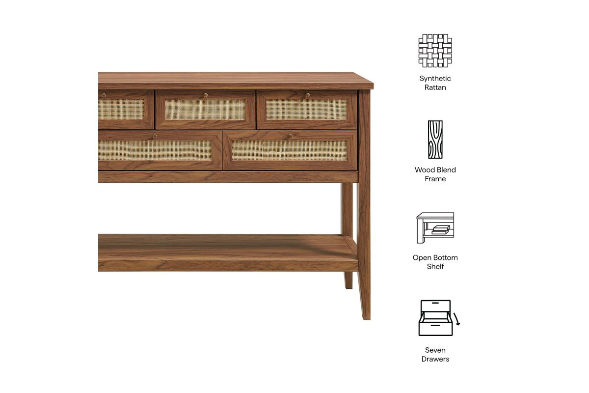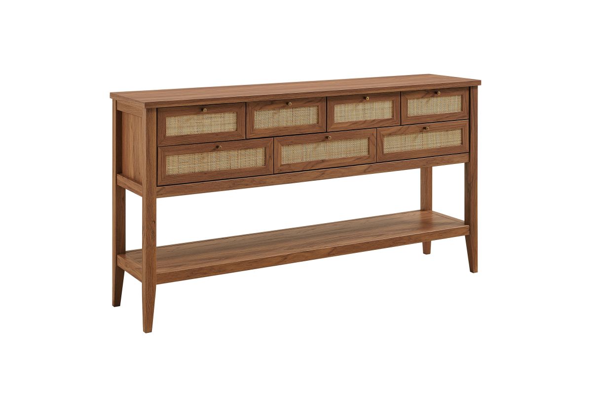 Introduce refreshing style to your living space with the Soma 62 inch Console Table. Showcasing a beautiful synthetic rattan weave on the drawer fronts, this narrow console works well as an entry console table, a console table behind the couch, or a small hallway table. Made from a laminated wood blend with a natural wood grain design, Soma features seven drawers—four across the top row and three across the bottom—great for tucking everyday items away. Meanwhile, the open lower shelf offers a place for baskets, shoes, or a few favorite accents. Includes non-marking foot pads to help protect flooring. Weight Capacity: Distributed: 194lbs, Upper Drawer : 11lbs x 4, Lower Drawer : 11lbs x 3, Bottom : 154lbs.