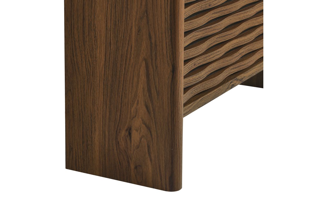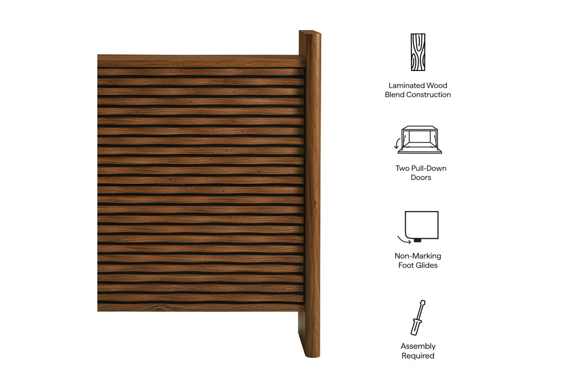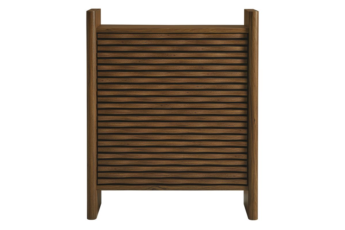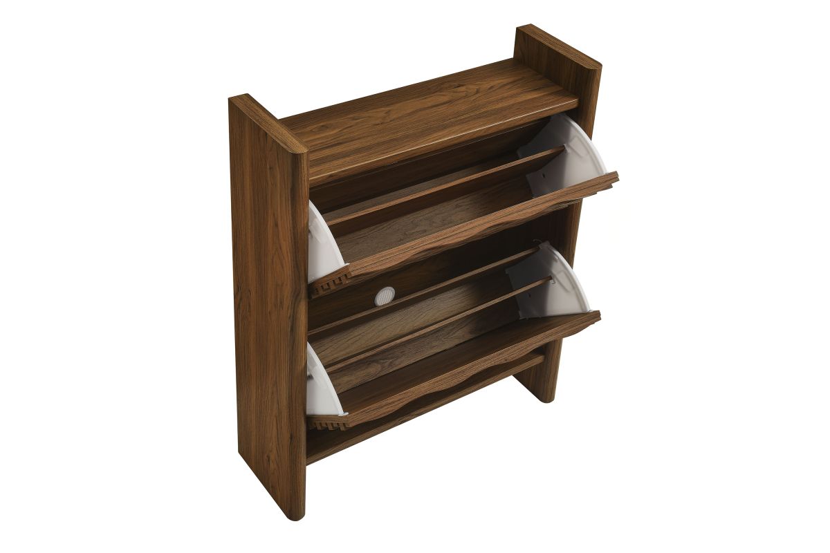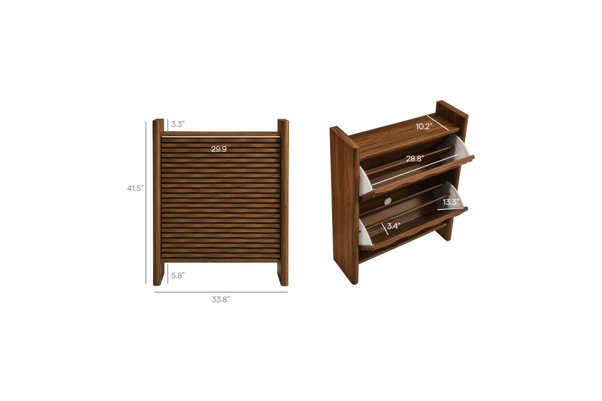 Simple in purpose, the Emric Wave Shoe Cabinet brings a soft, sculpted feel to functional storage. Made from a wood blend with a beautiful wood grain finish, this shoe storage cabinet features slatted fronts with a subtle wave design resting on a black backdrop that adds depth and movement. Two pull-down drawers swivel open to reveal hidden compartments, ideal for neatly storing shoes and keeping entryways or hallways clutter-free. With thick side panels that extend to the floor, this narrow shoe storage cabinet rests on a solid base that feels grounded from every angle. Whether styled as a shoe cabinet with flip-down storage for the entryway, or a compact vertical shoe organizer in a hallway, this contemporary shoe rack cabinet brings character and convenience to any space. Includes non-marking foot glides for floor protection. Assembly required.