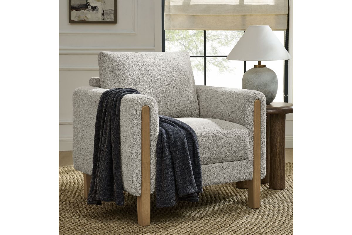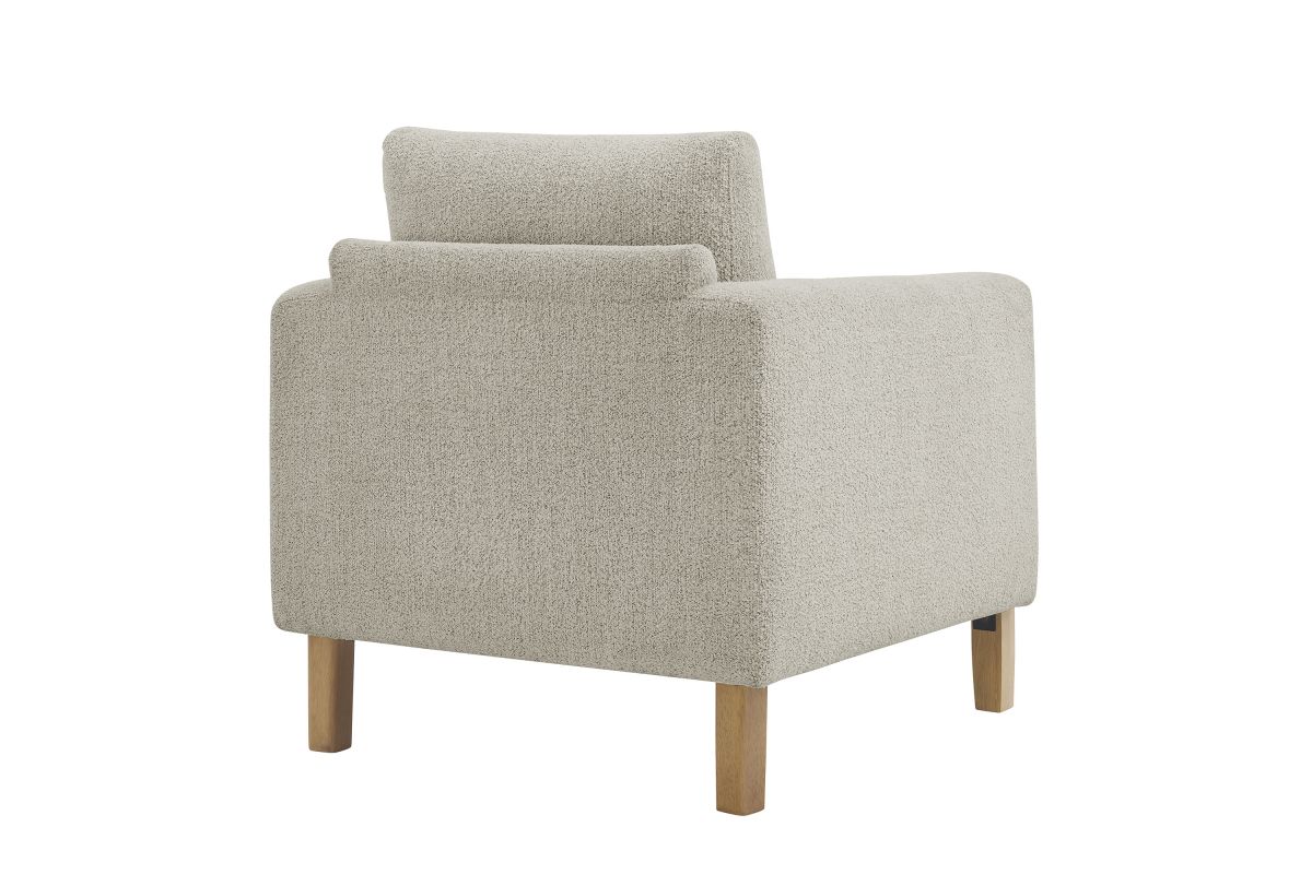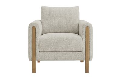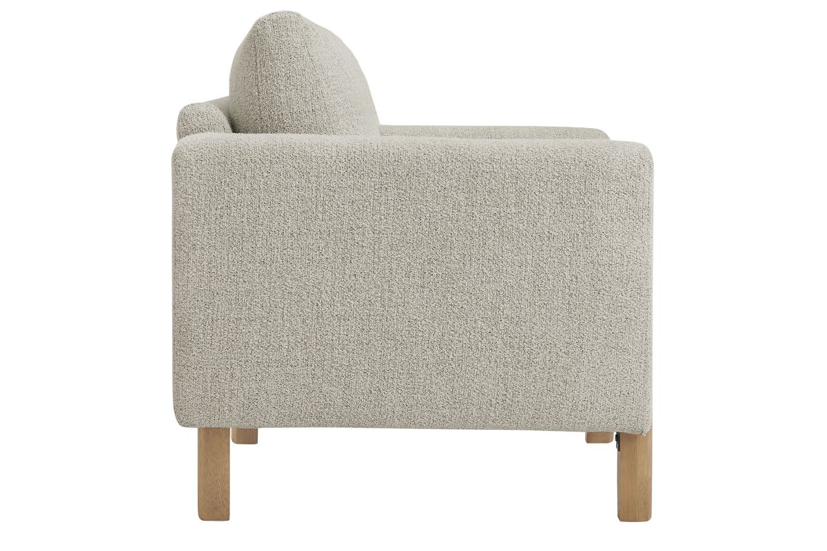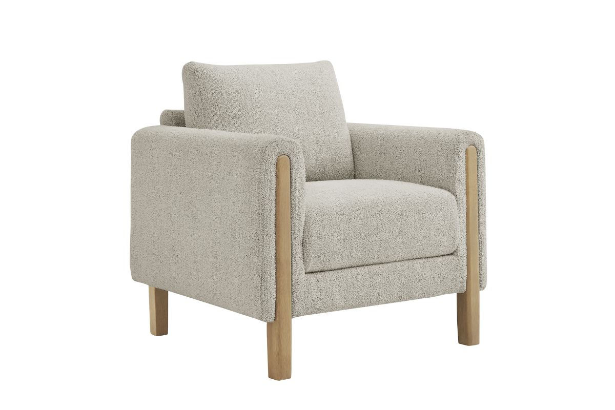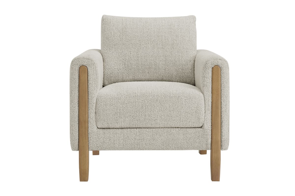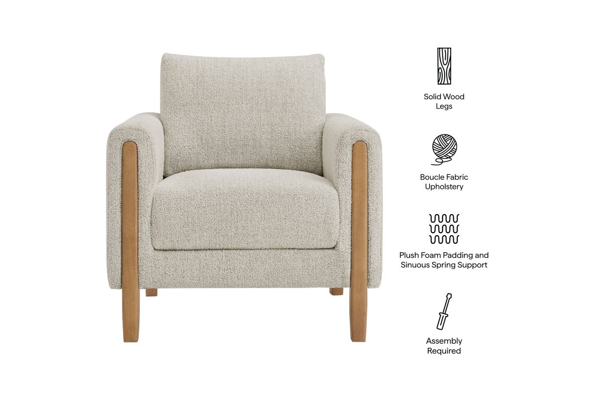 Settle into sculptural comfort with the Hawken Accent Armchair. Designed with bold curves and oversized proportions, this lounge chair offers a wide, inviting seat and rounded armrests for a cozy reading or relaxation experience. Upholstered in soft brushed boucle fabric, Hawken adds depth and visual warmth to any space—from living room to bedroom to lounge area. The sturdy solid wood legs complement the textured boucle upholstery with natural warmth and mid-century charm. With a supportive foam-padded seat, plush back cushion, and zigzag spring suspension, this upholstered accent chair delivers everyday comfort with timeless modern style. Assembly required. Weight Capacity: 500 lbs.