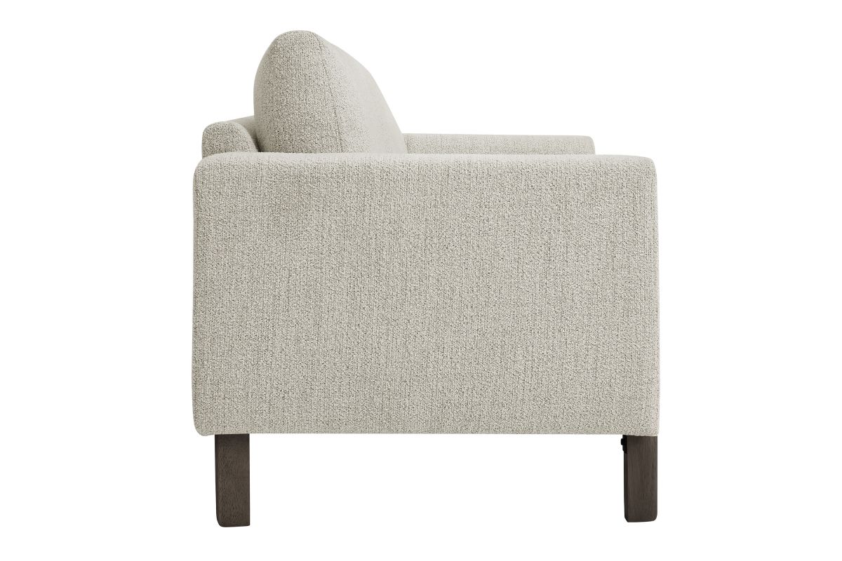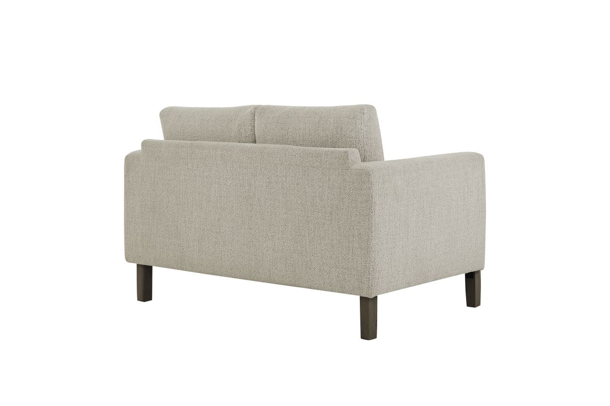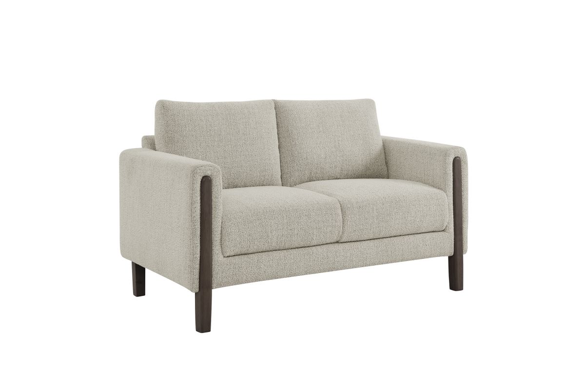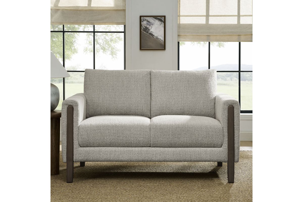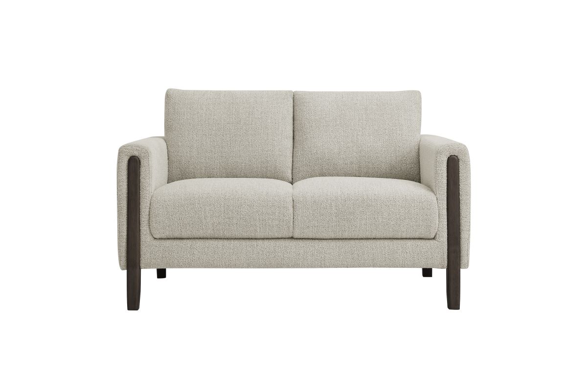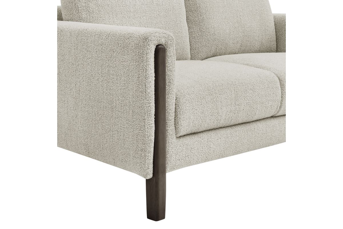 Settle into sculptural comfort with the Hawken Boucle Fabric Upholstered Loveseat. Designed with bold curves and oversized proportions, this two-seater sofa offers a wide, inviting seat and gently sloped armrests for a cozy reading or relaxation experience. Upholstered in soft brushed boucle fabric, Hawken adds depth and visual warmth to any space—from living room to bedroom to office lounge. The sturdy solid wood legs complement the textured boucle upholstery with natural warmth and mid-century charm. With a supportive foam-padded seat, plush back cushions, and zigzag spring suspension, this modern loveseat delivers everyday comfort with timeless style. Assembly required. Weight Capacity: 500 lbs.