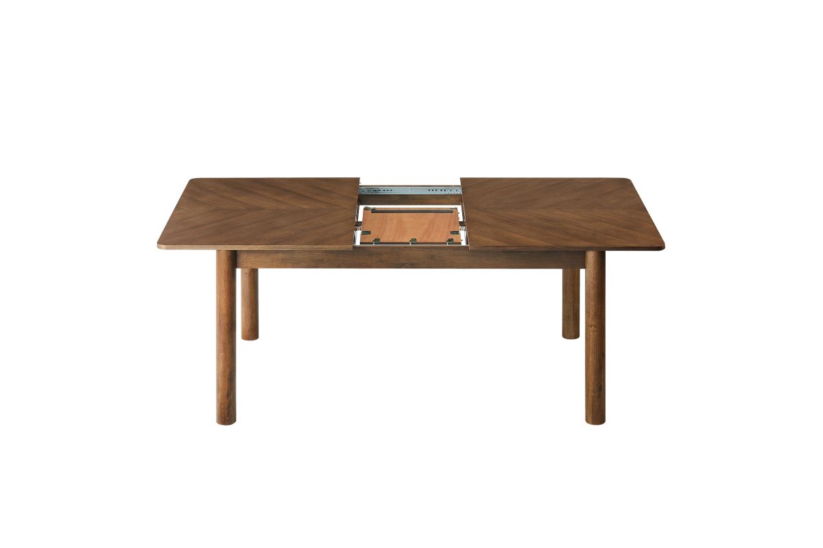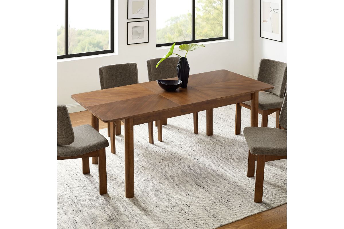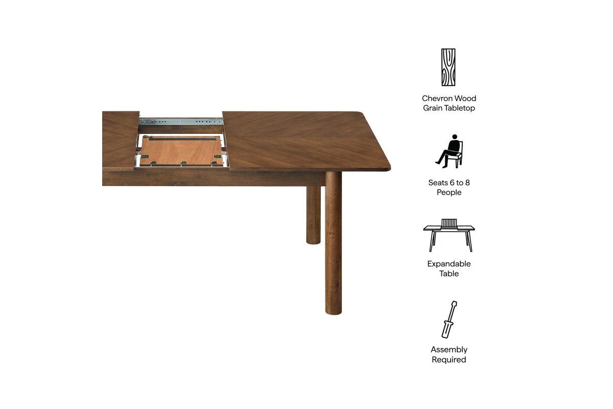 Designed with both everyday ease and special occasions in mind, the Alba Extendable Dining Room Table brings flexible function and clean-lined style to your dining area. A chevron-patterned wood veneer top offers a subtle geometric accent, while softly rounded legs provide a modern yet relaxed presence that fits beautifully in contemporary or farmhouse dining room settings. Measuring 59 inches closed and extending to 75 inches with the built-in leaf, this rectangle dining table easily transforms into a stunning wood dining table for 6–8 people—ideal for holiday dinners, work sessions, or as a sleek conference table for creative teams. Non-marking foot caps protect your floors, and simple assembly makes setup smooth from the start. Weight Capacity: 400 lbs.