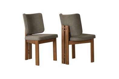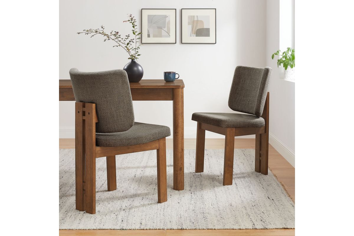 Designed to bring comfort and style to everyday meals or special gatherings, the Alba Set of 2 Dining Chairs blends clean lines with sculptural details. The armless silhouette is paired with soft fabric upholstery, while the back legs are crafted from solid rubberwood and connected by a center stretcher, creating the subtle illusion of a three-leg base. The design feels sturdy and streamlined, with a warm wood tone that complements modern and classic spaces alike. Gently curved backrests and padded seats create a comfortable perch whether you’re hosting dinner or working from your dining table. Each curved dining chair is equipped with non-marking foot pins to help protect your floors and arrives ready for easy assembly. Weight Capacity per chair: 500 lbs