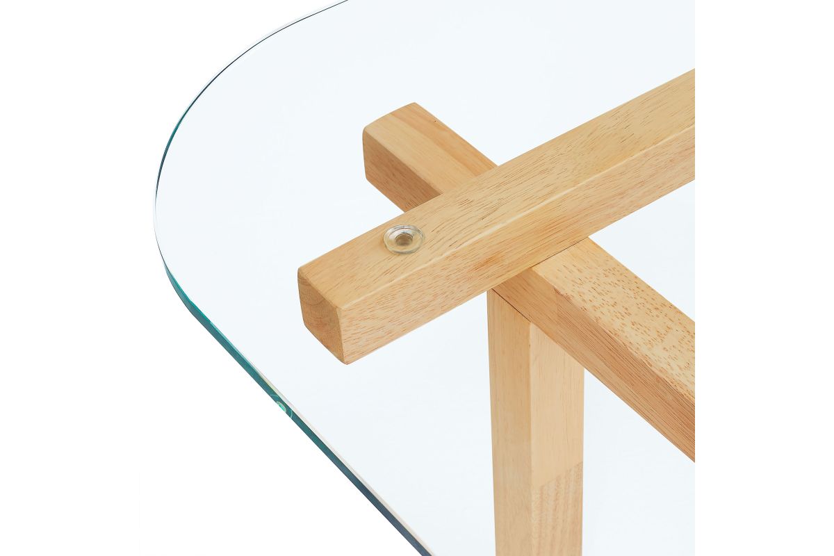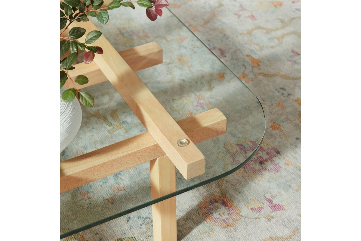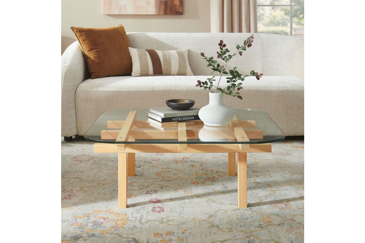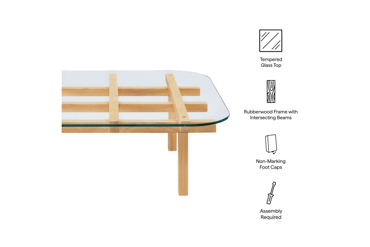 A bold mix of structure and simplicity, the Isby 35 Inch Glass Coffee Table features a clear tempered glass top with rounded corners, set over a grid-like frame made from solid rubberwood. The intersecting beams create a bold, sculptural look that blends easily with mid-century, minimalist, vintage, or retro-inspired interiors. Tempered glass offers added durability and safety, making it a practical wood glass centrepiece for everyday use. Non-marking foot caps help protect your floors, while the compact size makes it easy to style in a variety of spaces. Assembly required. Weight Capacity: 400 lbs