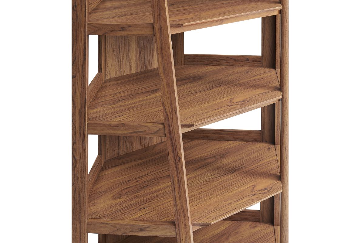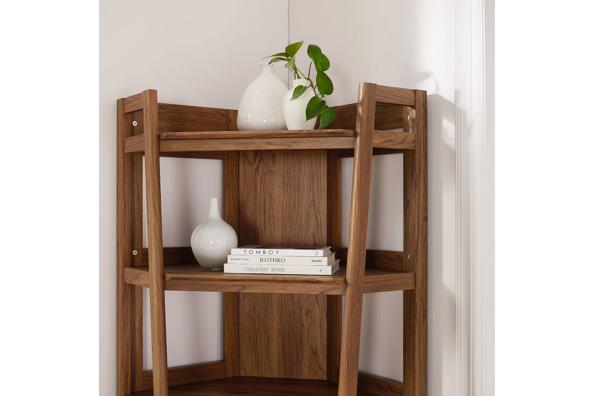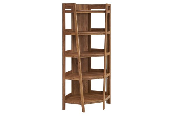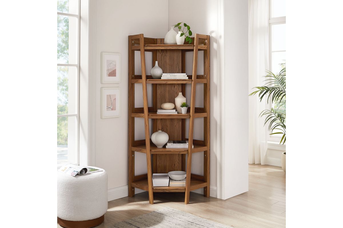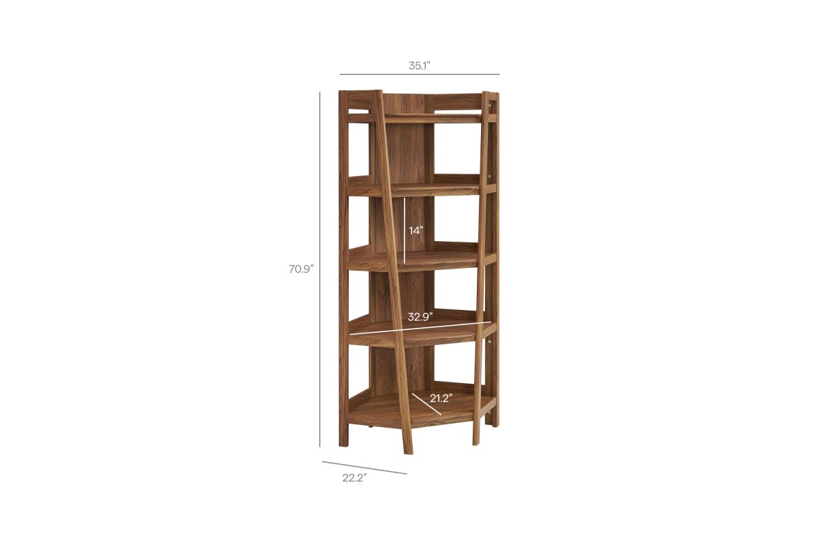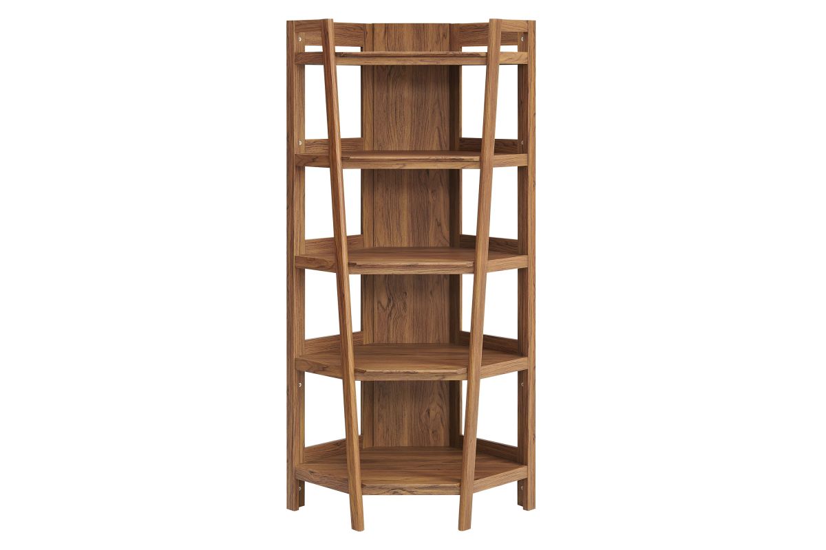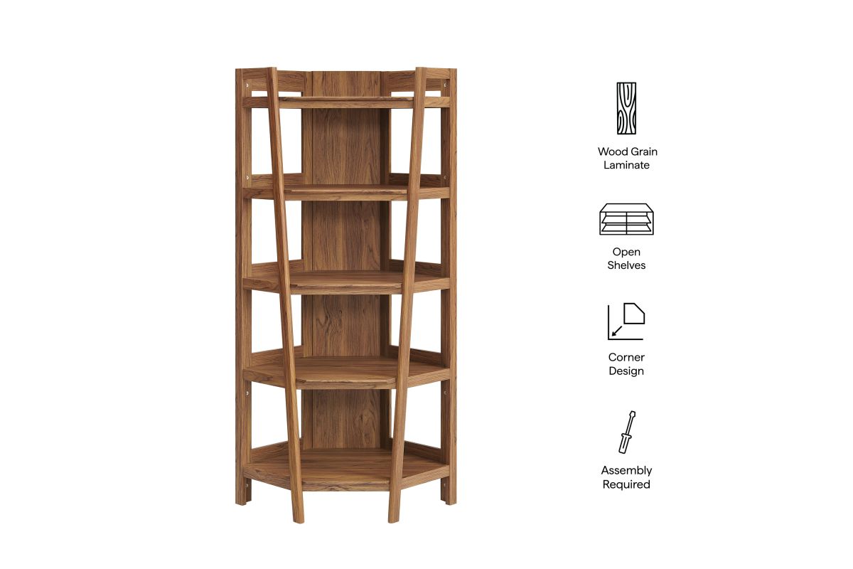 Stack your favorite reads and display home accessories with the Bixby 71" Corner Bookshelf. Featuring a slim, tiered silhouette that tucks neatly into a corner, this modern bookcase pairs laminated wood grain with clean, open shelving for a balanced look. It offers five roomy shelves from top to bottom—perfect for books, plants, and décor. Angled side supports and window-style panels keep the profile light while adding stability. Built from a durable wood blend for long-lasting use, this tall bookshelf pairs with other Bixby pieces for larger setups or stands beautifully on its own. Weight Capacity: 141lbs per shelf