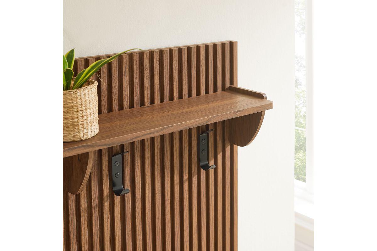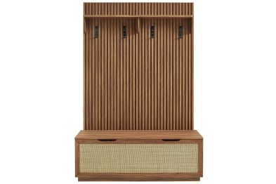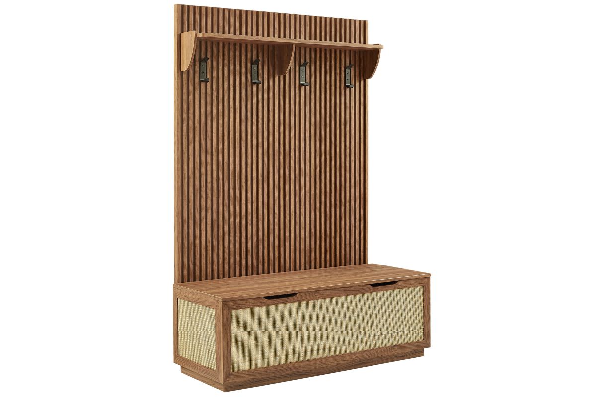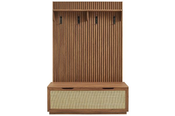 A complete entryway solution, the Soma Fluted Hall Tree with Rattan Storage Bench combines natural texture, functional design, and a streamlined silhouette. This two-piece entryway storage set features a vertical slatted coat rack with four sturdy hooks and a top display shelf, anchored by a coordinating storage bench. Crafted with a warm wood grain finish and faux rattan panels, the Soma entryway bench with storage adds an organic touch to modern, transitional, or Scandinavian-inspired interiors. This rattan bench opens with two cut-out handles and a flip-top hinge, revealing a divided interior with deep compartments for shoes, blankets, or everyday items. Soft-close hinges provide ease of use, while a flat base offers a solid, grounded profile. On top, the fluted hall tree panel provides ample space to hang coats, bags, and accessories, with wall-mount brackets granting secure installation. Together, this hall tree with rattan bench and shoe storage offers a stylish 3-in-1 entryway storage solution—perfect for mudrooms, hallways, or foyers. Assembly required. Bench Weight Capacity: 209 lbs.