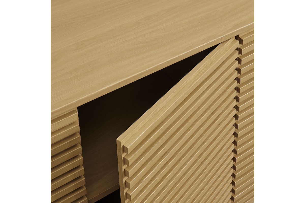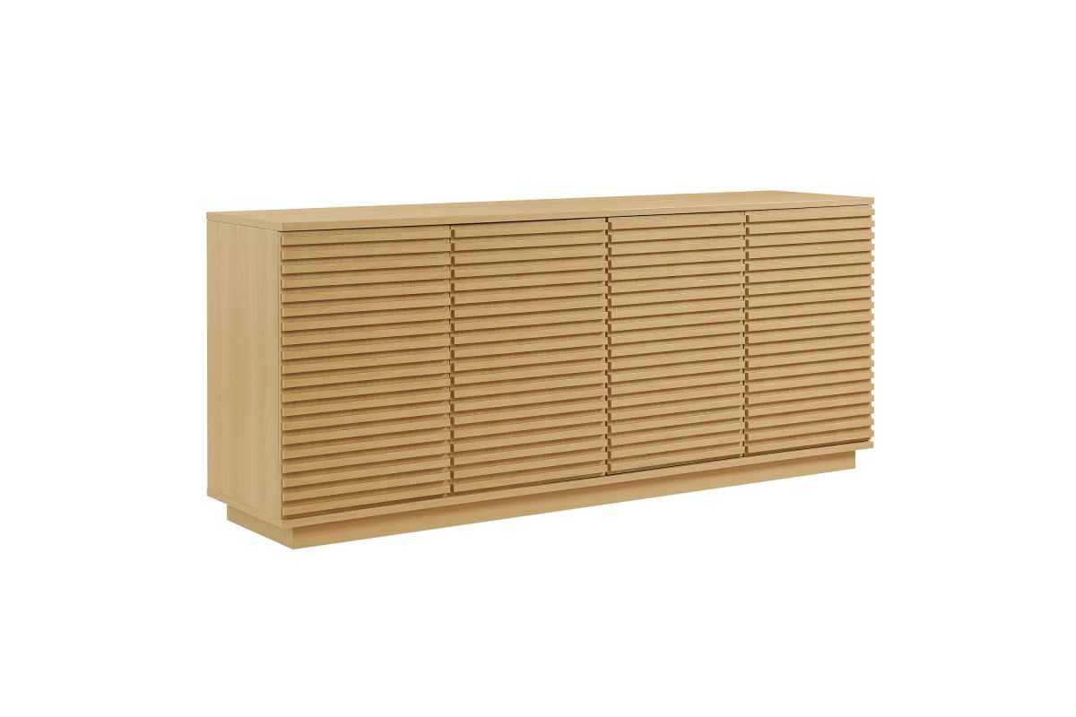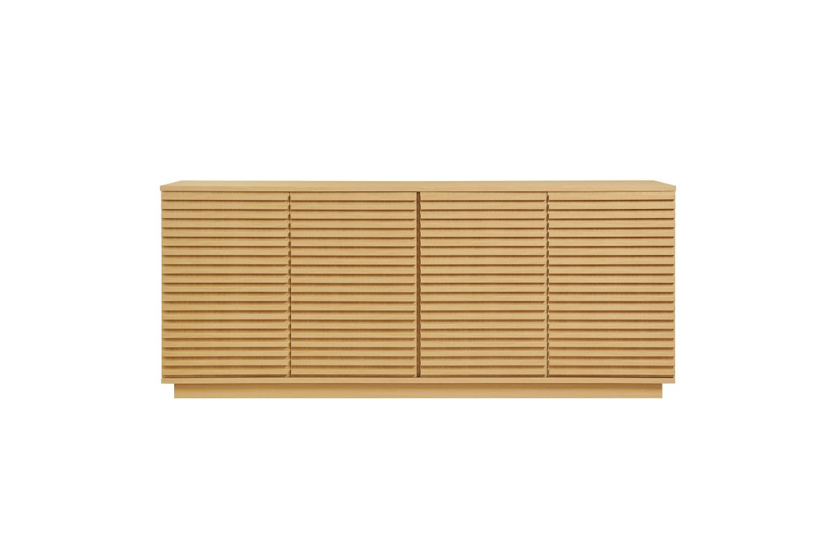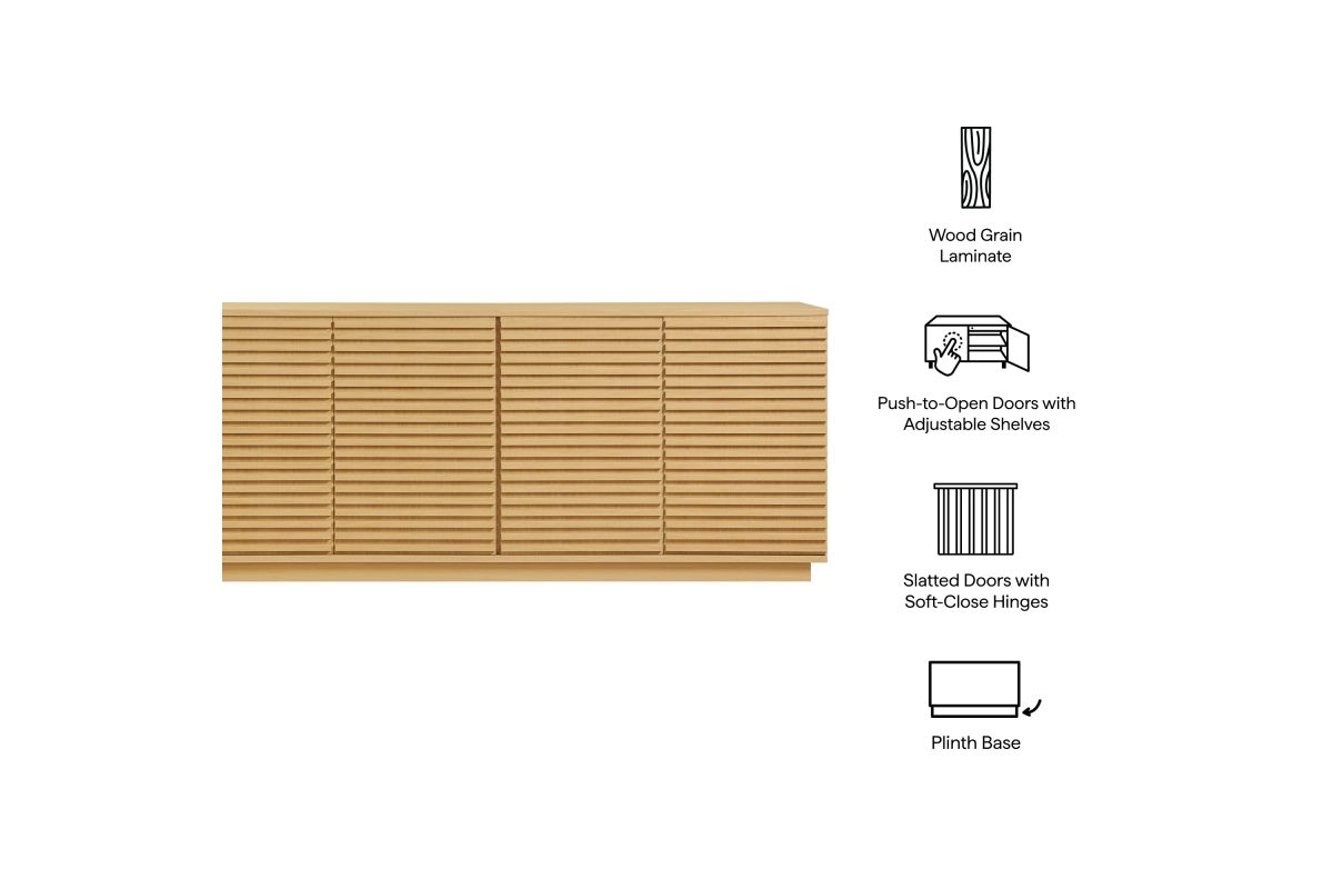 Tap into mid-century aesthetics with the Render Sideboard Cabinet Display Stand. Resting on a plinth base, this dining room buffet table features a laminated wood blend frame with a smooth wood grain laminate finish and four fluted doors with push-to-open mechanisms and soft-close hinges for effortless access to concealed storage. Inside, adjustable shelves and four cord management holes provide flexible organization for dinnerware, electronics, decor, or office essentials. The Render Cabinet Sideboard delivers an abundance of storage space while maintaining a streamlined, modern look. Boasting a mid-century modern style, this slatted storage cabinet features a solid construction with a pleasing look and practical functionality. Perfect as a 4-door slatted sideboard, credenza cabinet, or buffet table with storage, Render also serves as a large TV console or media cabinet with cable management for wall-mounted or anchored TVs. Assembly required.