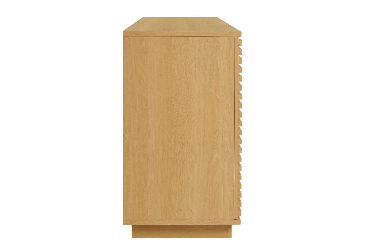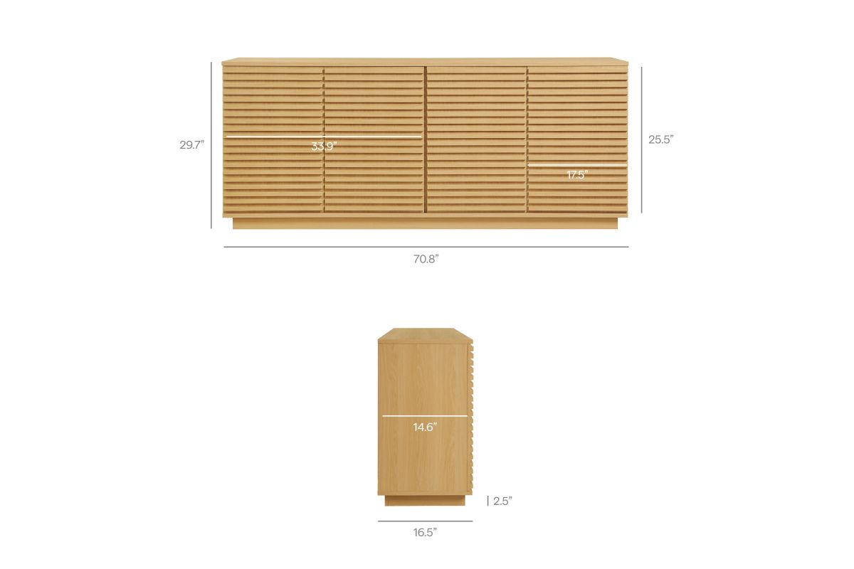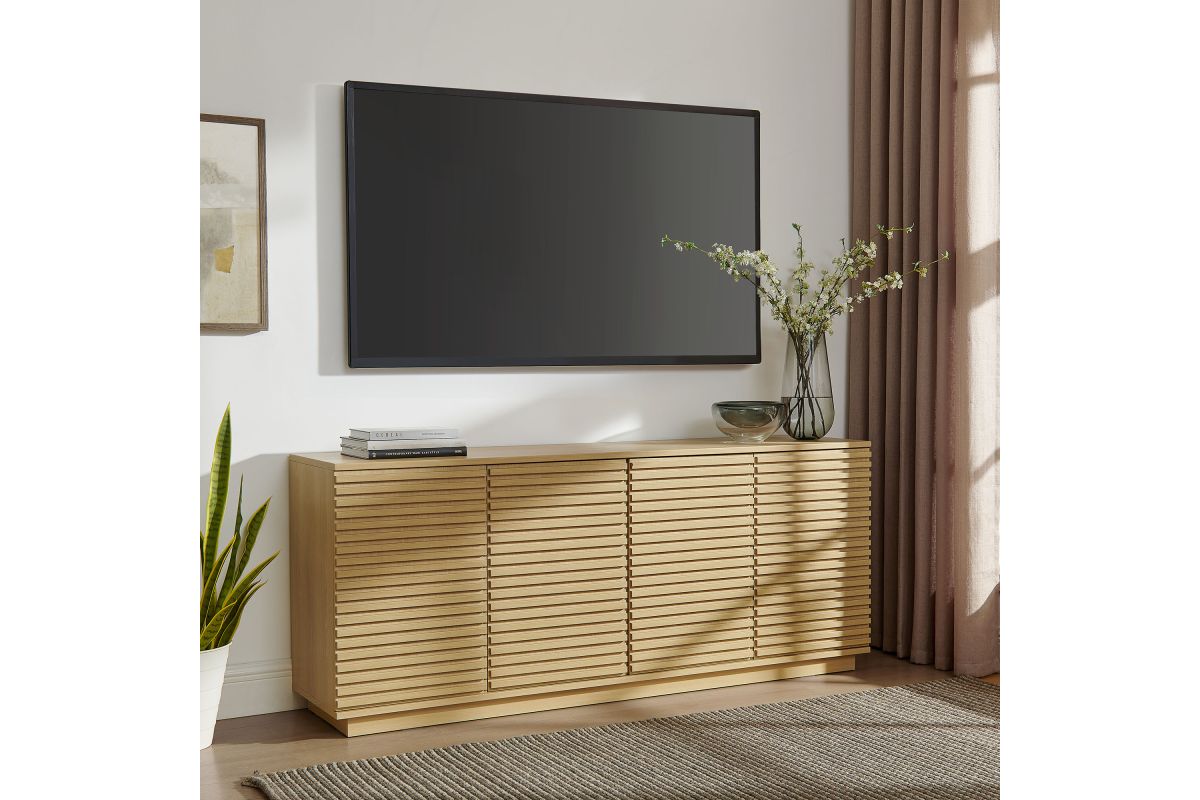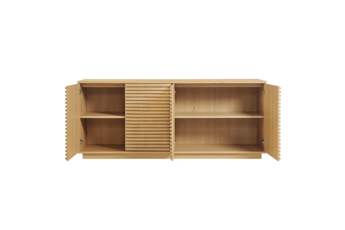 Tap into mid-century aesthetics with the Render Sideboard Cabinet Display Stand. Resting on a plinth base, this dining room buffet table features a laminated wood blend frame with a smooth wood grain laminate finish and four fluted doors with push-to-open mechanisms and soft-close hinges for effortless access to concealed storage. Inside, adjustable shelves and four cord management holes provide flexible organization for dinnerware, electronics, decor, or office essentials. The Render Cabinet Sideboard delivers an abundance of storage space while maintaining a streamlined, modern look. Boasting a mid-century modern style, this slatted storage cabinet features a solid construction with a pleasing look and practical functionality. Perfect as a 4-door slatted sideboard, credenza cabinet, or buffet table with storage, Render also serves as a large TV console or media cabinet with cable management for wall-mounted or anchored TVs. Assembly required.