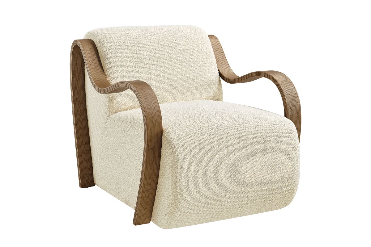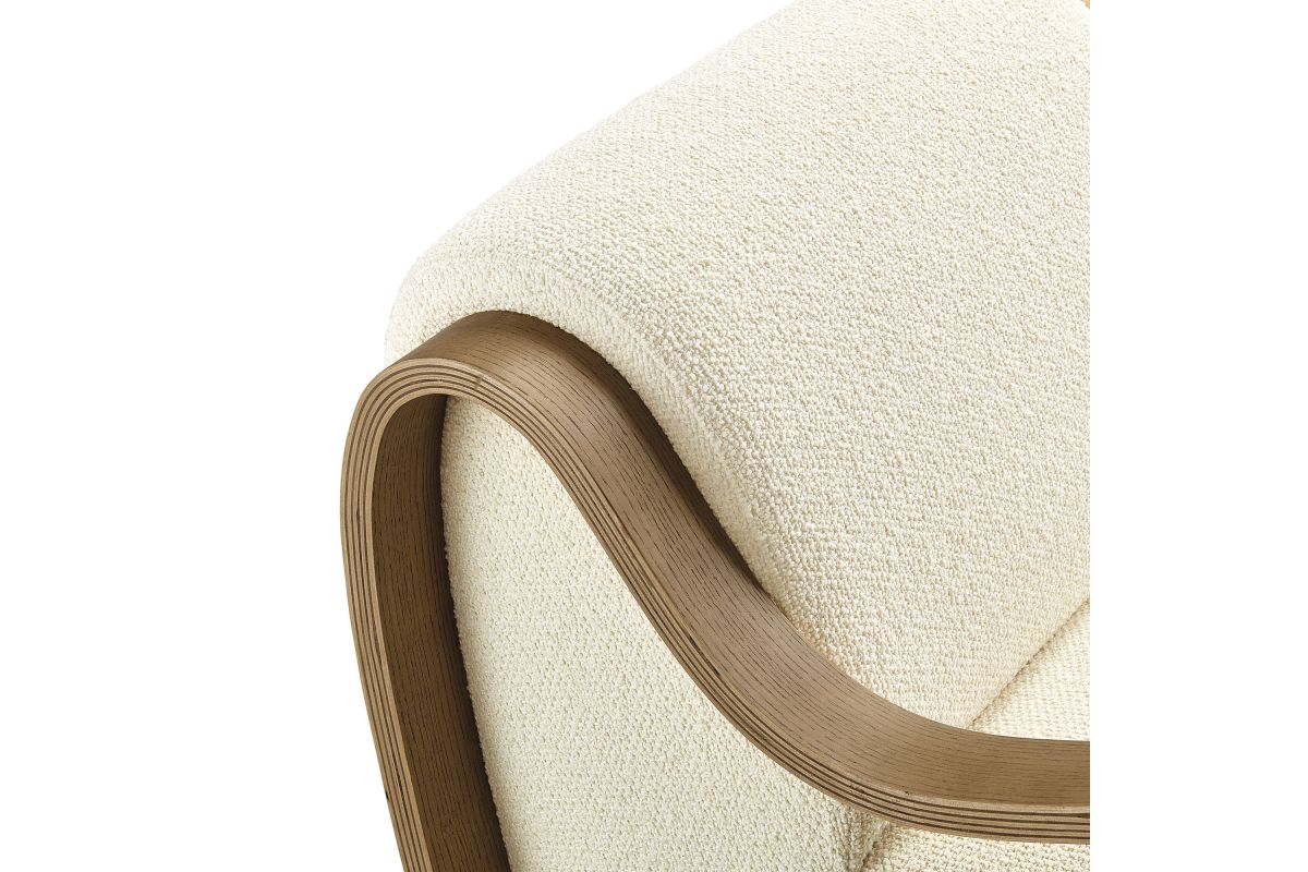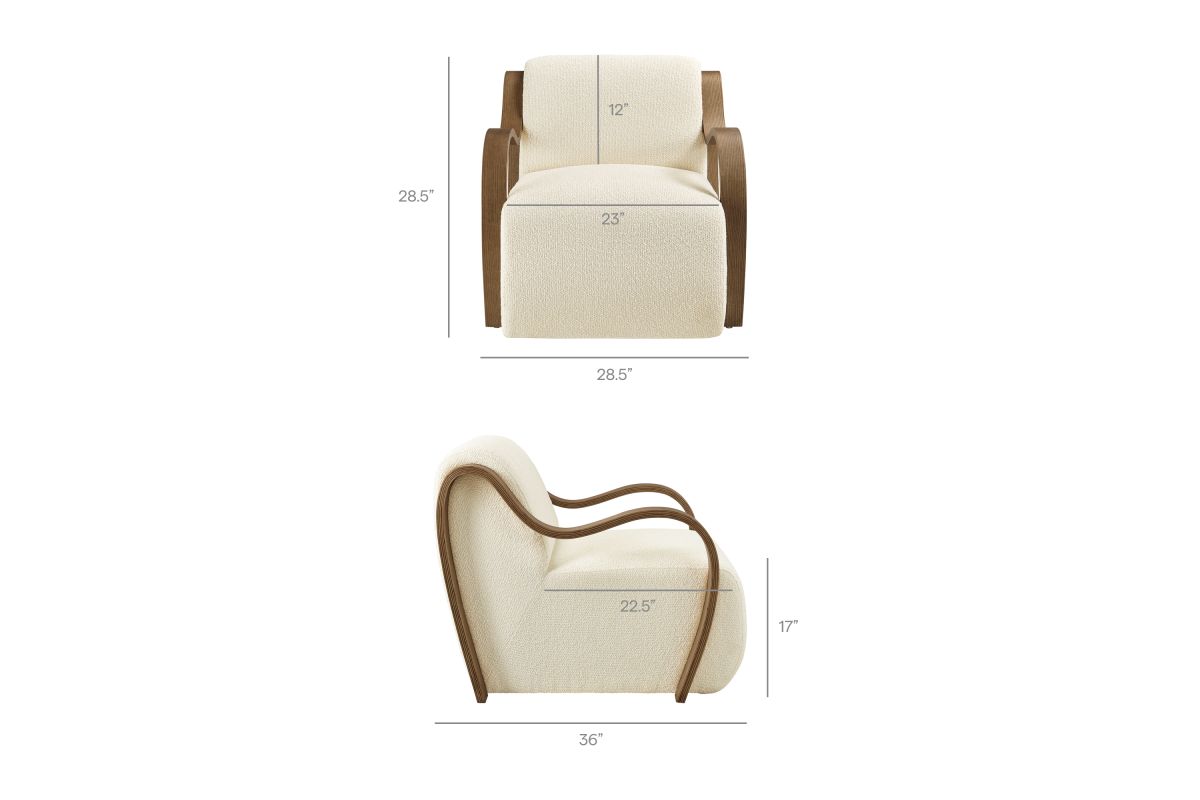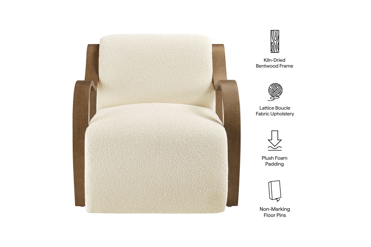The Atrium Accent Chair blends sculptural design with everyday comfort, making it a standout addition to any modern living space. Upholstered in a beautiful lattice boucle fabric, this lounge chair offers a richly textured feel with a cozy, inviting touch. The curved seat cushion extends seamlessly to the floor for a grounded silhouette, while gracefully curved arms crafted from kiln-dried bentwood add a mid-century inspired sculptural element. Perfect for use as a reading chair, bedroom accent chair, or statement lounge chair, Atrium combines plush foam padding with a striking design that elevates any interior. Arrives fully assembled with non-marking floor pins included. Weight Capacity: 300 lbs.