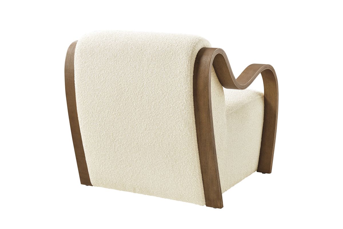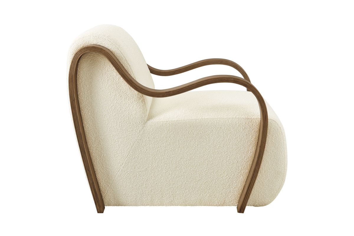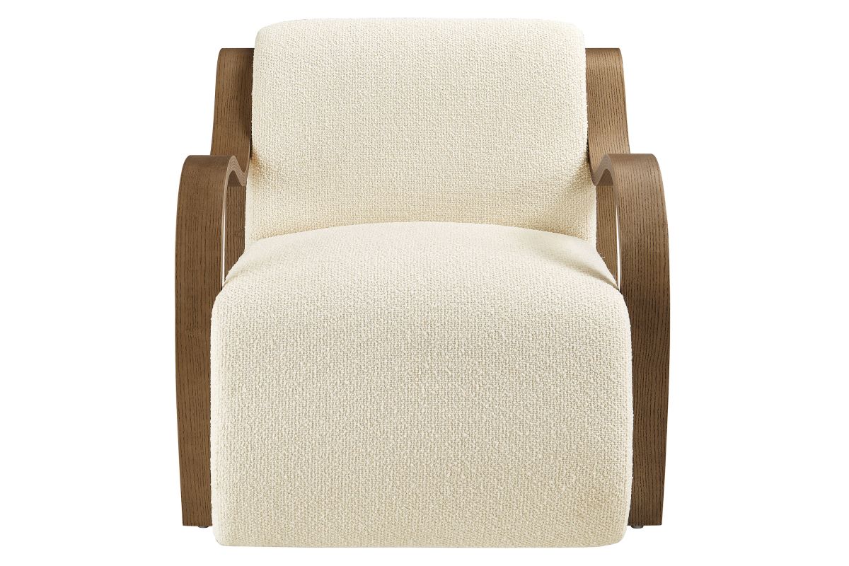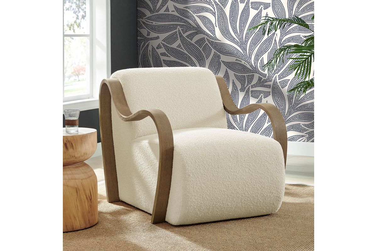 The Atrium Accent Chair blends sculptural design with everyday comfort, making it a standout addition to any modern living space. Upholstered in a beautiful lattice boucle fabric, this lounge chair offers a richly textured feel with a cozy, inviting touch. The curved seat cushion extends seamlessly to the floor for a grounded silhouette, while gracefully curved arms crafted from kiln-dried bentwood add a mid-century inspired sculptural element. Perfect for use as a reading chair, bedroom accent chair, or statement lounge chair, Atrium combines plush foam padding with a striking design that elevates any interior. Arrives fully assembled with non-marking floor pins included. Weight Capacity: 300 lbs.