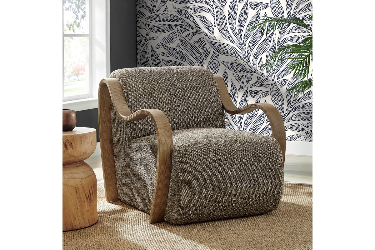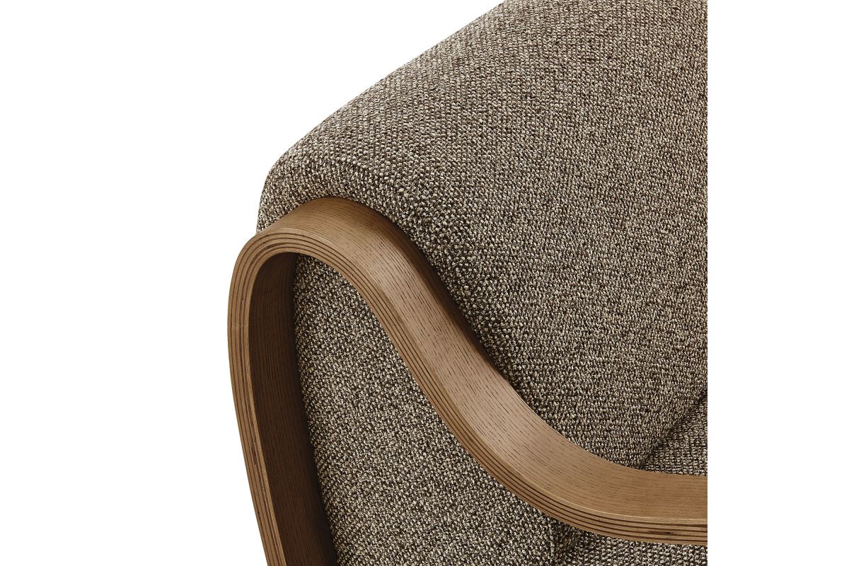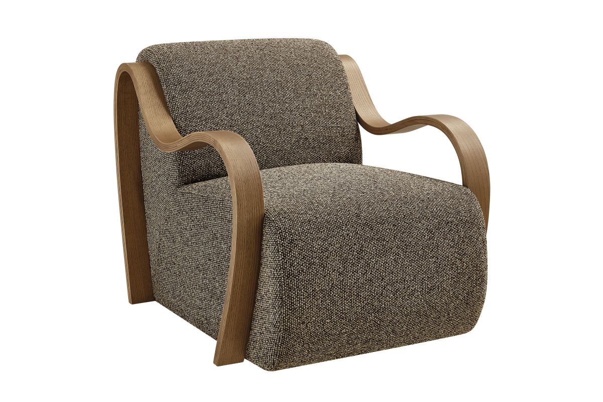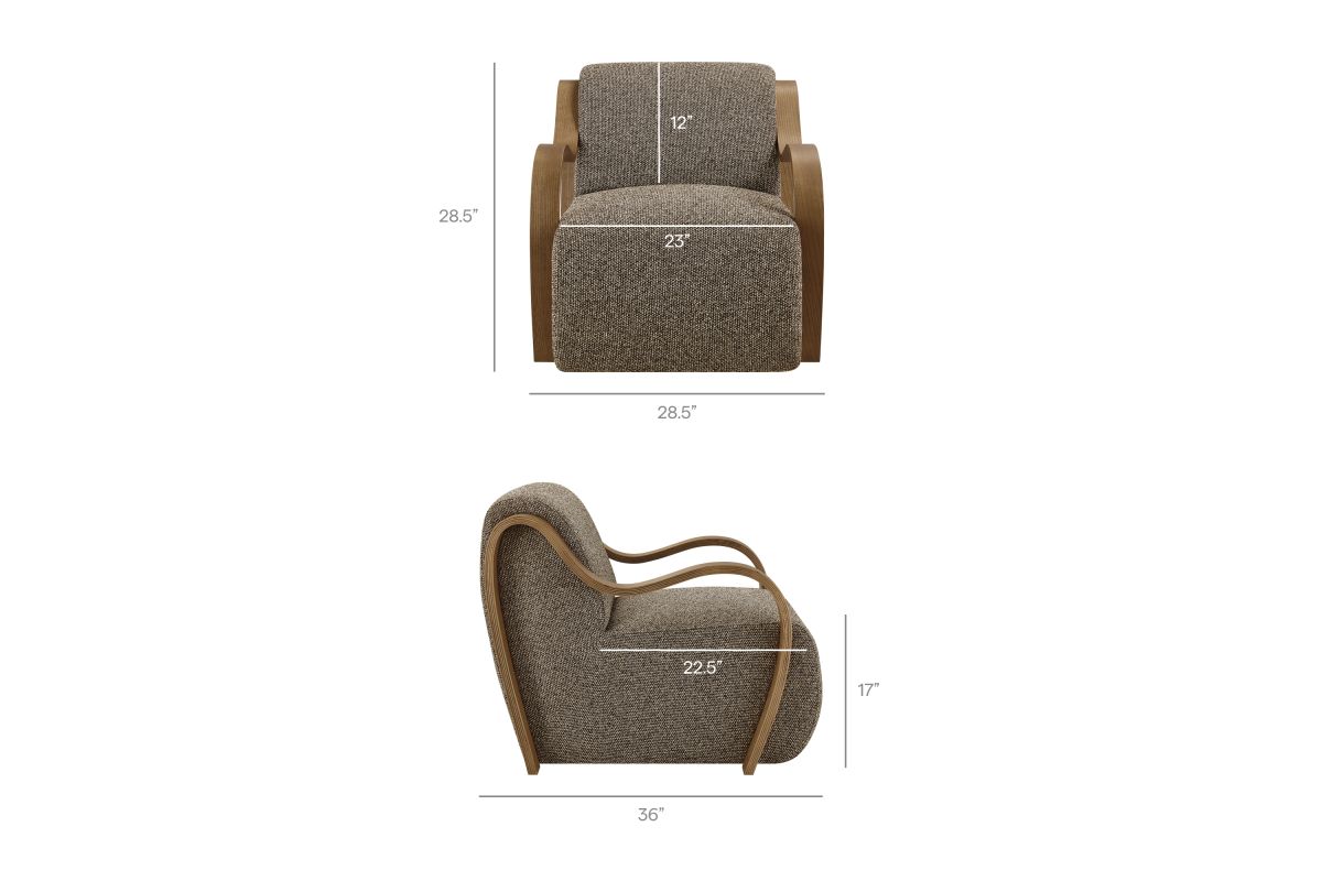 The Atrium Accent Chair blends sculptural design with everyday comfort, making it a standout addition to any modern living space. Upholstered in a beautiful lattice boucle fabric, this lounge chair offers a richly textured feel with a cozy, inviting touch. The curved seat cushion extends seamlessly to the floor for a grounded silhouette, while gracefully curved arms crafted from kiln-dried bentwood add a mid-century inspired sculptural element. Perfect for use as a reading chair, bedroom accent chair, or statement lounge chair, Atrium combines plush foam padding with a striking design that elevates any interior. Arrives fully assembled with non-marking floor pins included. Weight Capacity: 300 lbs.