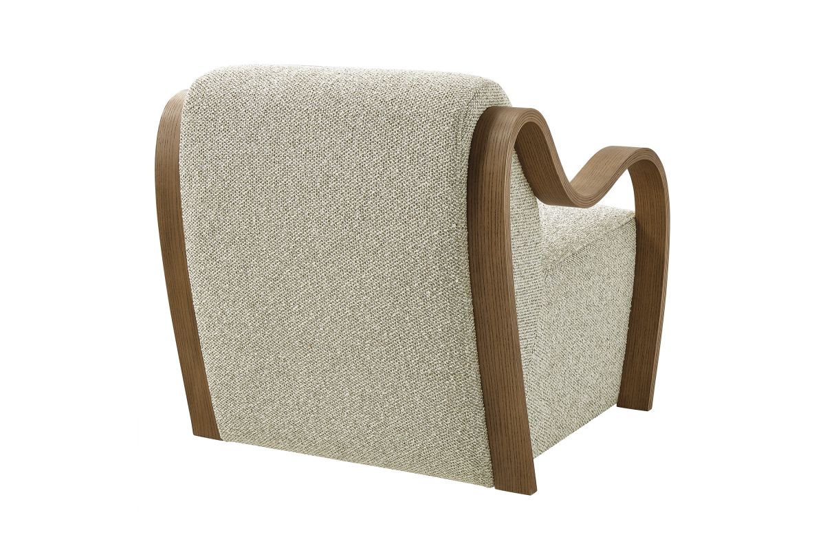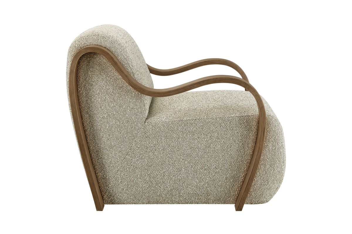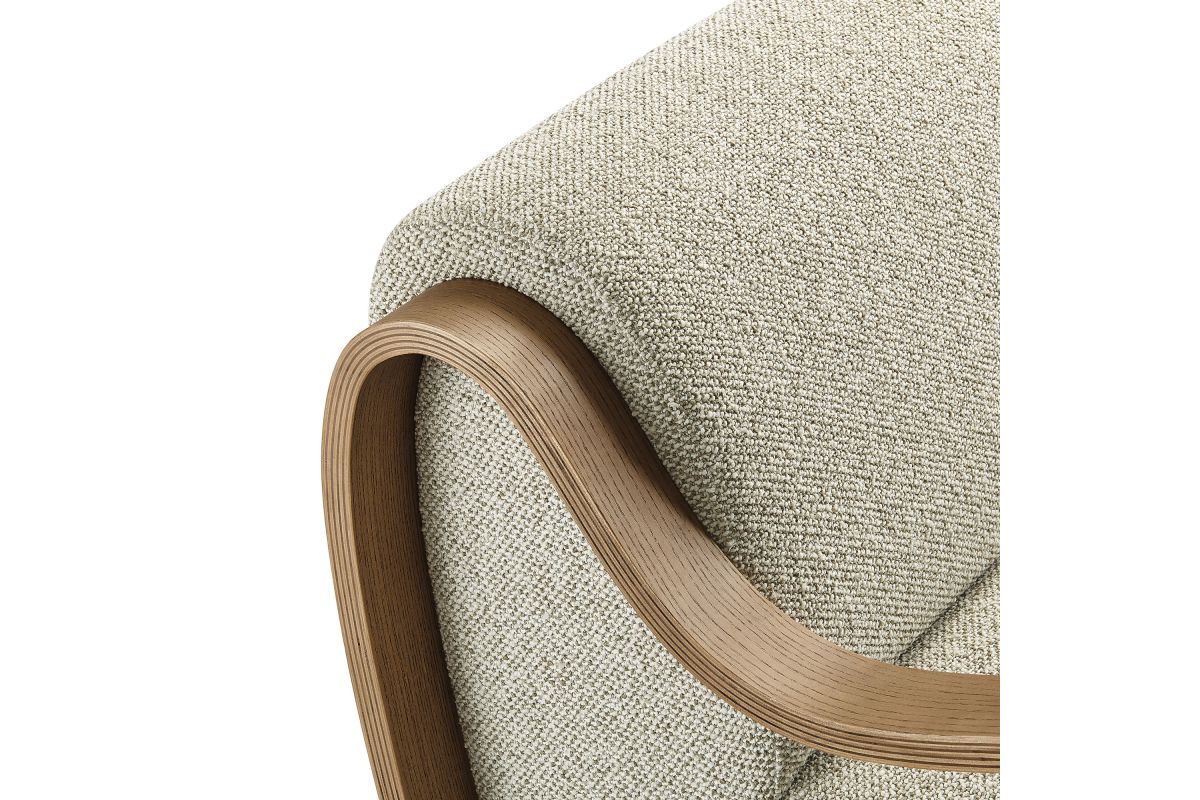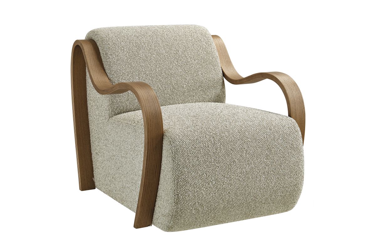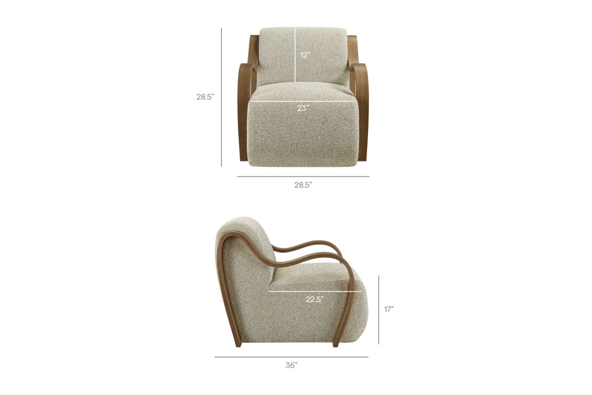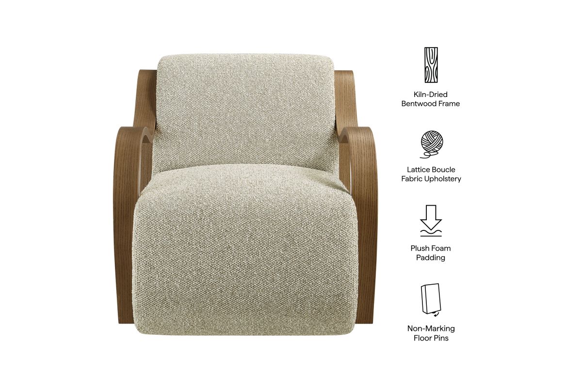 The Atrium Accent Chair blends sculptural design with everyday comfort, making it a standout addition to any modern living space. Upholstered in a beautiful lattice boucle fabric, this lounge chair offers a richly textured feel with a cozy, inviting touch. The curved seat cushion extends seamlessly to the floor for a grounded silhouette, while gracefully curved arms crafted from kiln-dried bentwood add a mid-century inspired sculptural element. Perfect for use as a reading chair, bedroom accent chair, or statement lounge chair, Atrium combines plush foam padding with a striking design that elevates any interior. Arrives fully assembled with non-marking floor pins included. Weight Capacity: 300 lbs.