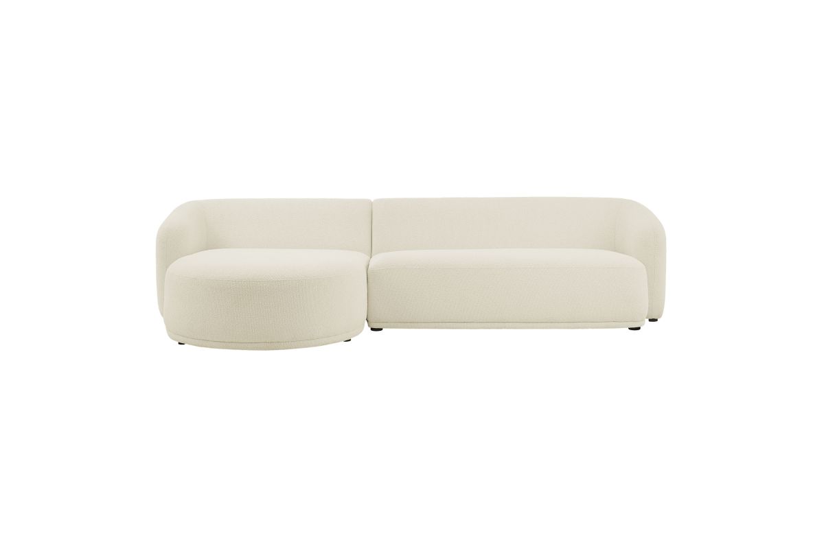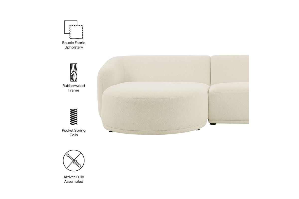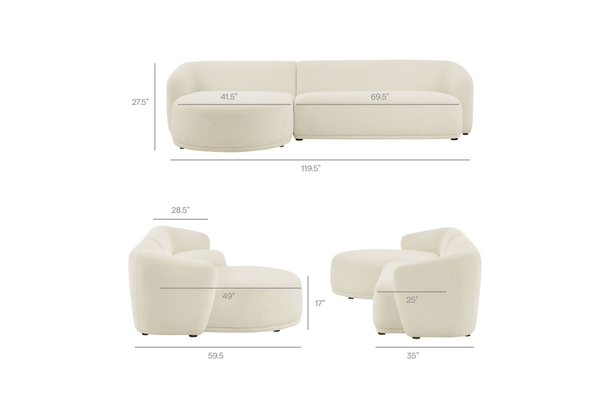 Settle into the inviting curves of the Monica Boucl� Sectional, a two-piece couch that brings a clean, cohesive look to anchor any room. Wrapped in soft boucl� fabric, this left-arm design pairs a chaise with a one-arm loveseat to form a left facing sectional with a low, rounded silhouette that fits neatly in modern spaces. Built on an internal wood frame with a supportive spring pocket coil system, it seats 3�4 comfortably and arrives fully assembled. Loveseat Weight Capacity: 600lbs; Chaise Weight Capacity: 300 lbs.