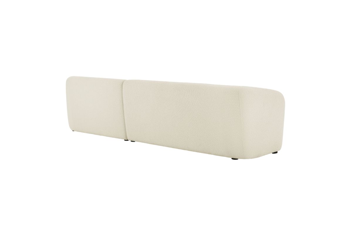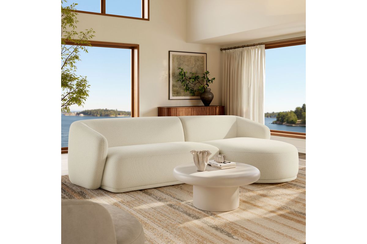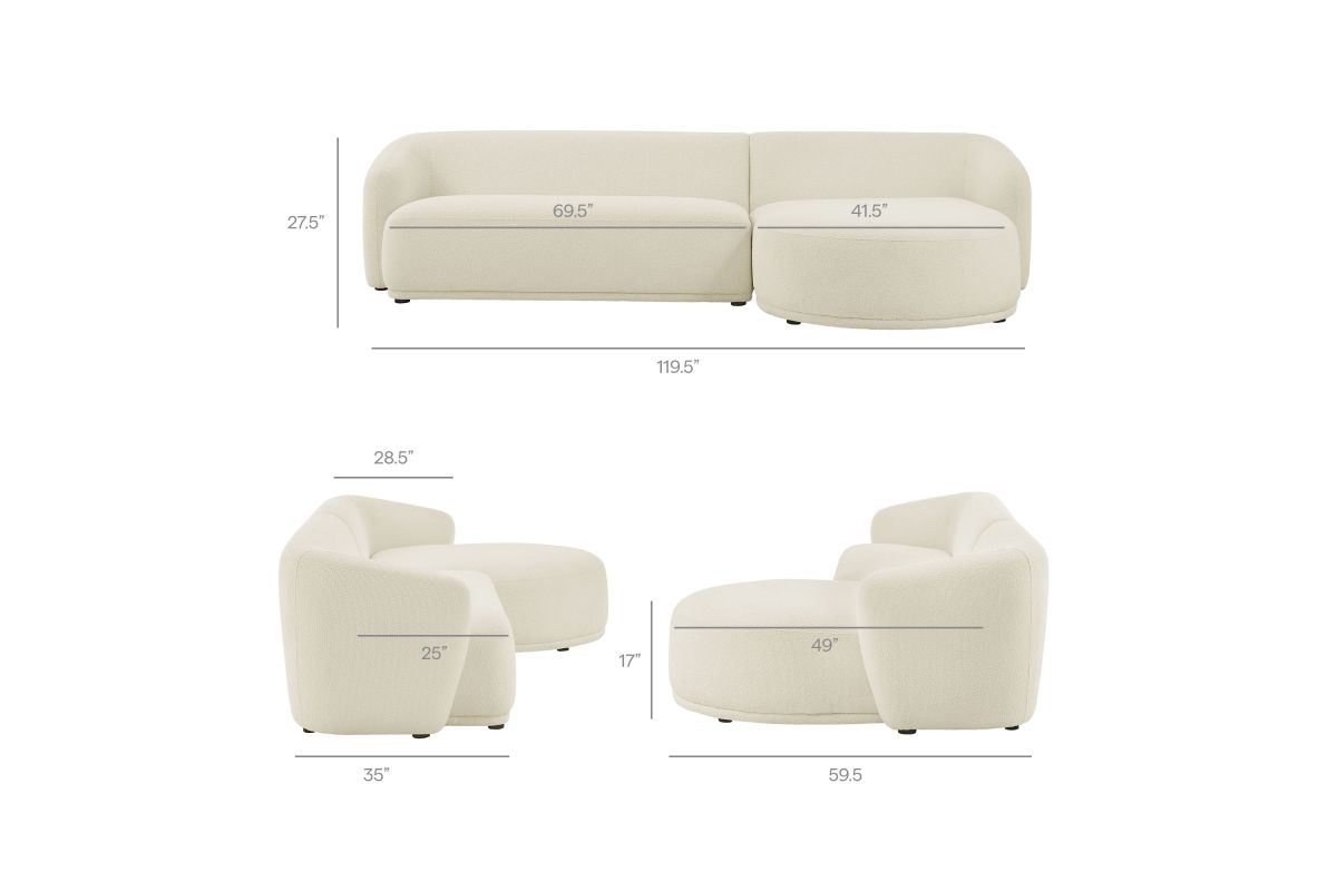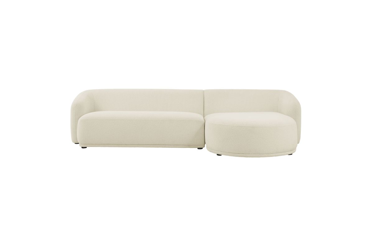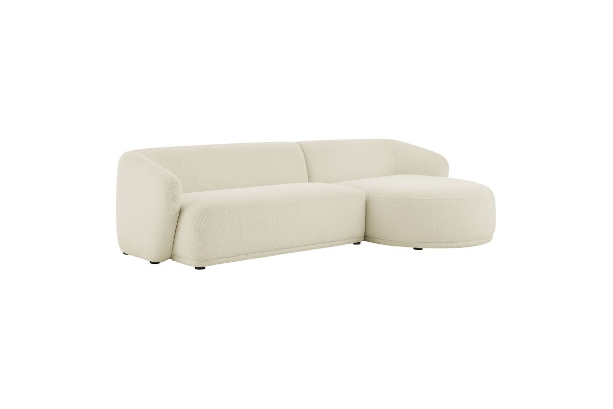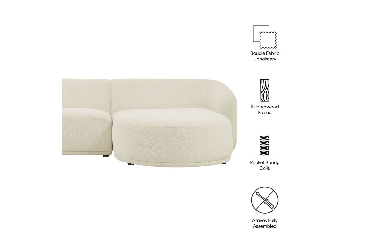 Settle into the inviting curves of the Monica Boucl� Sectional, a two-piece couch that brings a clean, cohesive look to anchor any room. Wrapped in soft boucl� fabric, this right-arm design pairs a chaise with a one-arm loveseat to form a right facing sectional with a low, rounded silhouette that fits neatly in modern spaces. Built on an internal wood frame with a supportive spring pocket coil system, it seats 3�4 comfortably and arrives fully assembled. Loveseat Weight Capacity: 600lbs; Chaise Weight Capacity: 300 lbs.