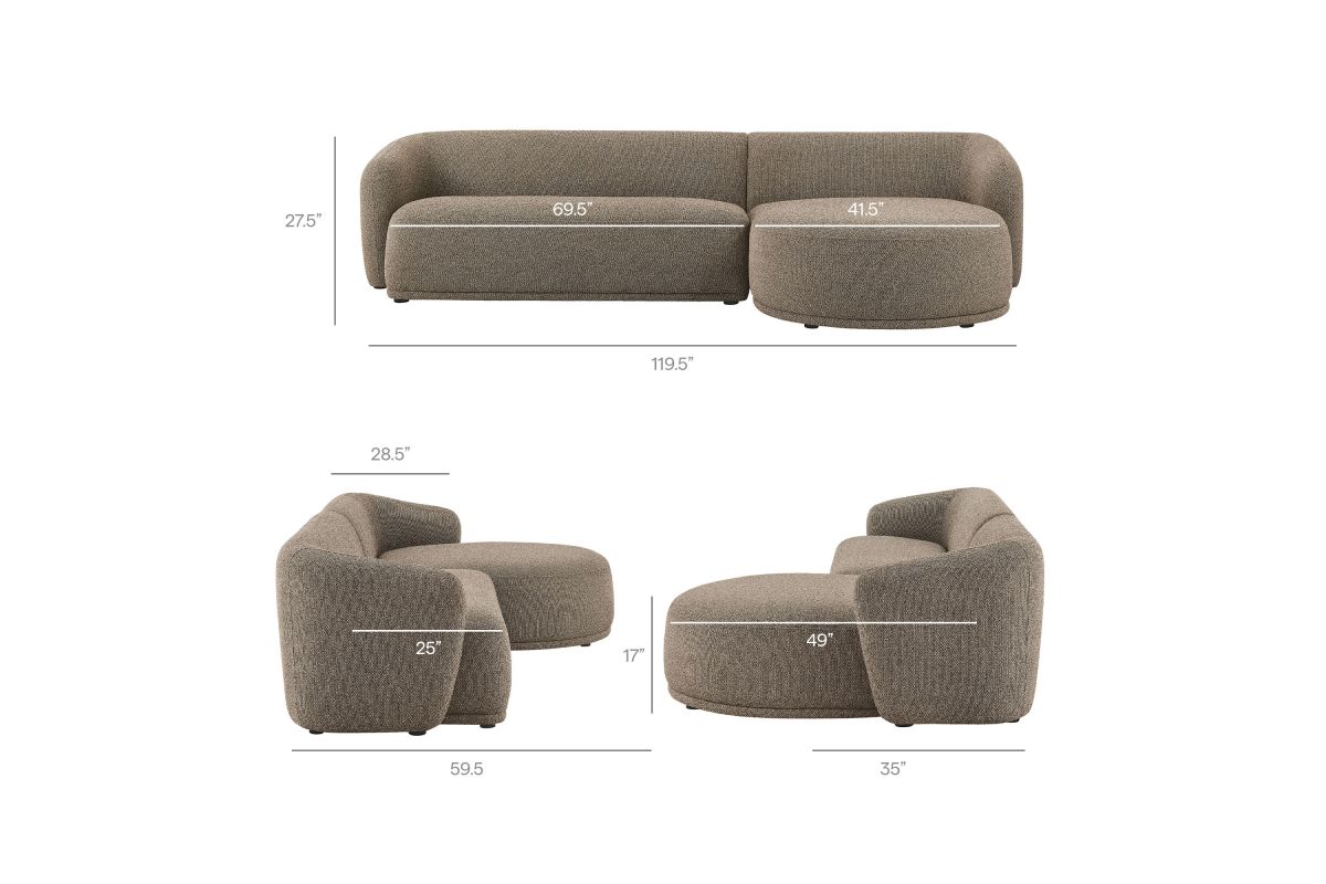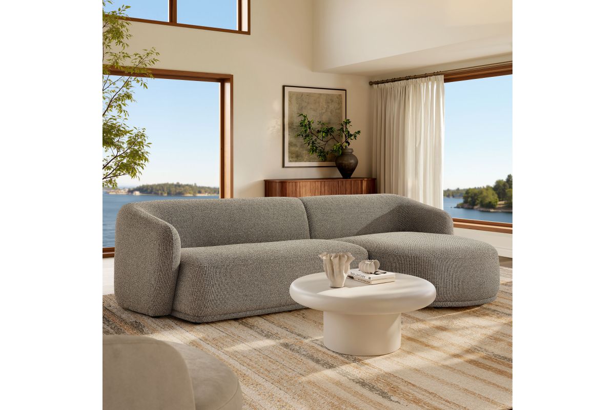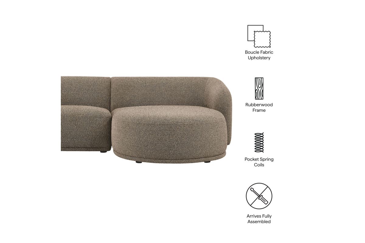 Settle into the inviting curves of the Monica Bouclé Sectional, a two-piece couch that brings a clean, cohesive look to anchor any room. Wrapped in soft bouclé fabric, this left-arm design pairs a chaise with a one-arm loveseat to form a left facing sectional with a low, rounded silhouette that fits neatly in modern spaces. Built on an internal wood frame with a supportive spring pocket coil system, it seats 3–4 comfortably and arrives fully assembled. Loveseat Weight Capacity: 600lbs; Chaise Weight Capacity: 300 lbs.