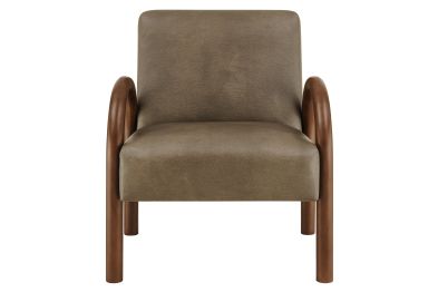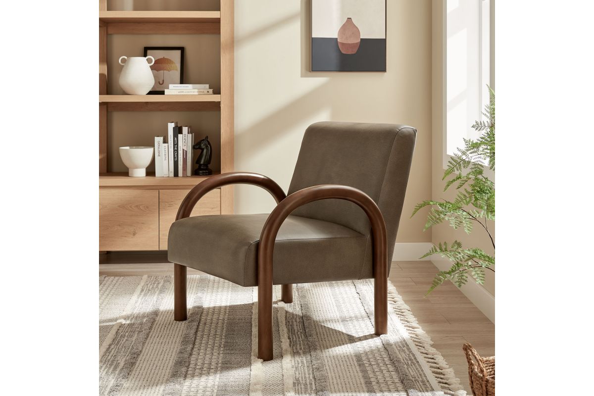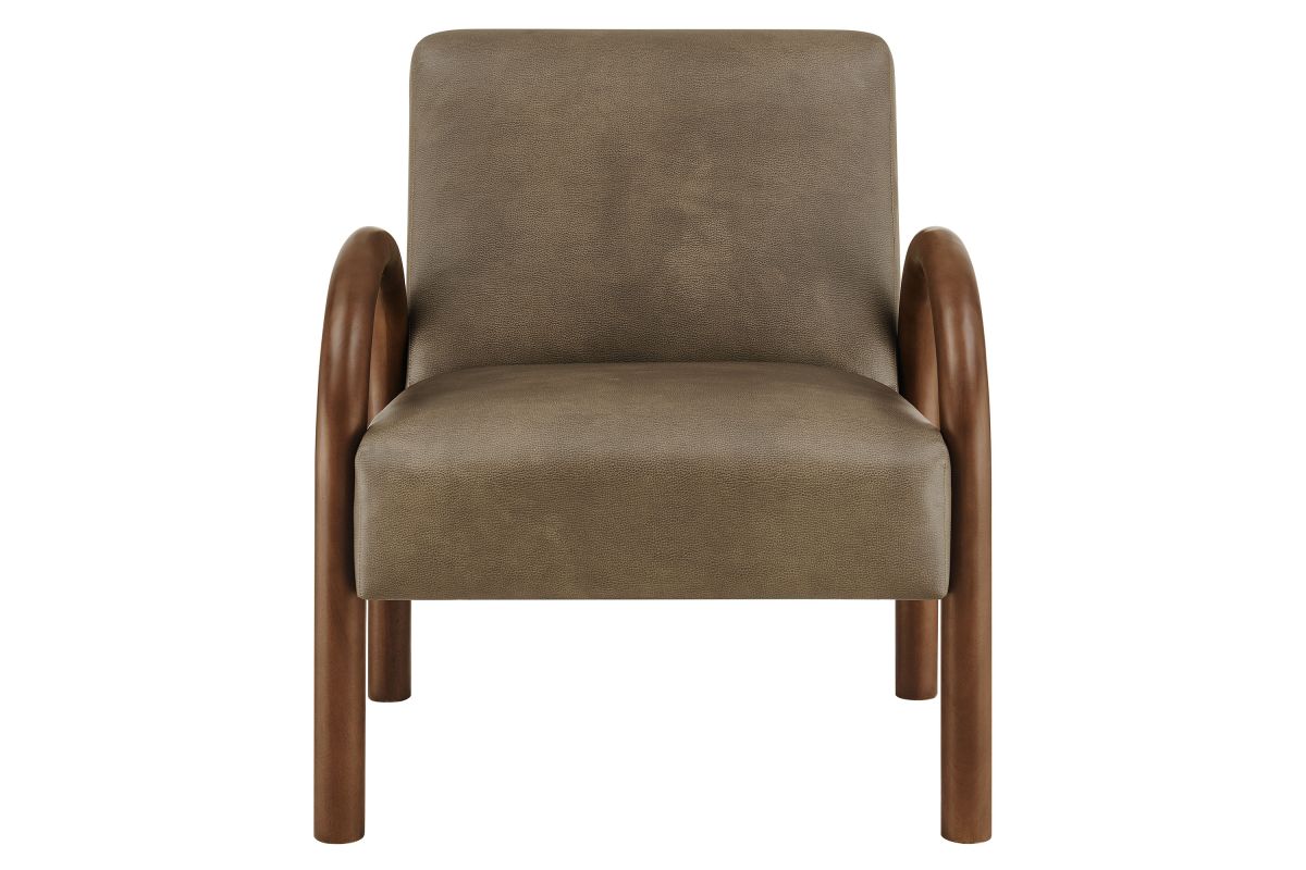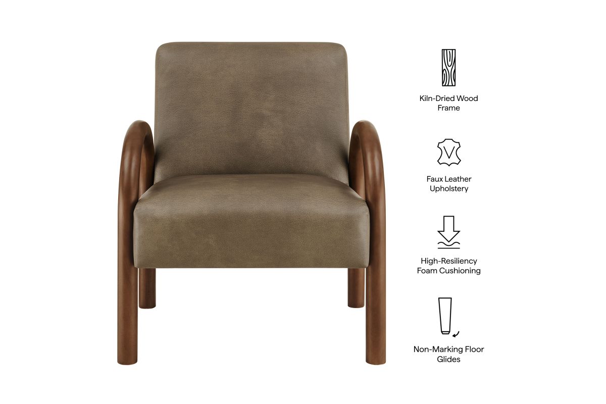 Elevate your space with the sculptural charm of the Lunet Accent Chair. Wrapped in smooth faux leather, this upholstered armchair pairs cozy texture with a bold wood frame for a look that’s both modern and timeless. The distinctive arched armrests curve seamlessly into solid wood legs, creating a statement silhouette that feels warm yet refined. High resiliency foam padding and a gently reclined seat make this vegan leather lounge chair as inviting as it is stylish—perfect for curling up with a book, adding flair to a living room corner, or anchoring a bedroom reading nook. Outfitted with non-marking floor glides, Lunet balances comfort, durability, and design in one plush package. Assembly required. Weight Capacity: 300 lbs.