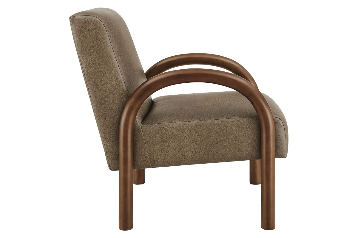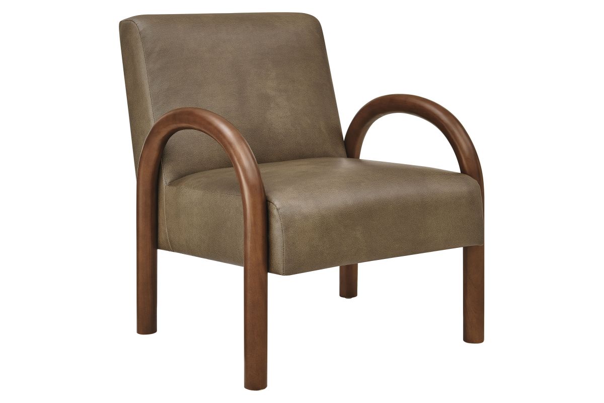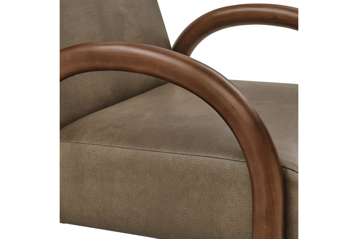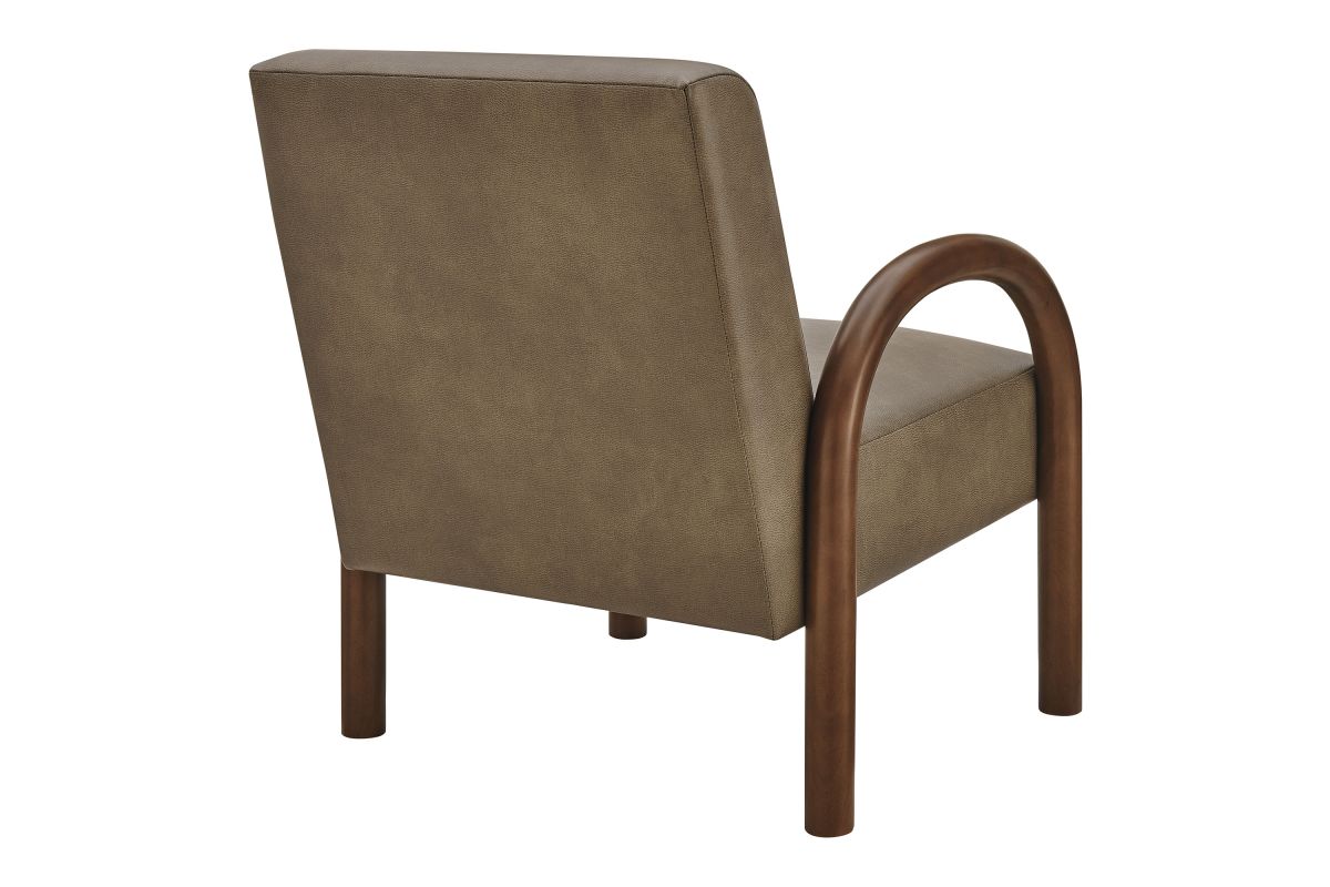 Elevate your space with the sculptural charm of the Lunet Accent Chair. Wrapped in smooth faux leather, this upholstered armchair pairs cozy texture with a bold wood frame for a look that’s both modern and timeless. The distinctive arched armrests curve seamlessly into solid wood legs, creating a statement silhouette that feels warm yet refined. High resiliency foam padding and a gently reclined seat make this vegan leather lounge chair as inviting as it is stylish—perfect for curling up with a book, adding flair to a living room corner, or anchoring a bedroom reading nook. Outfitted with non-marking floor glides, Lunet balances comfort, durability, and design in one plush package. Assembly required. Weight Capacity: 300 lbs.