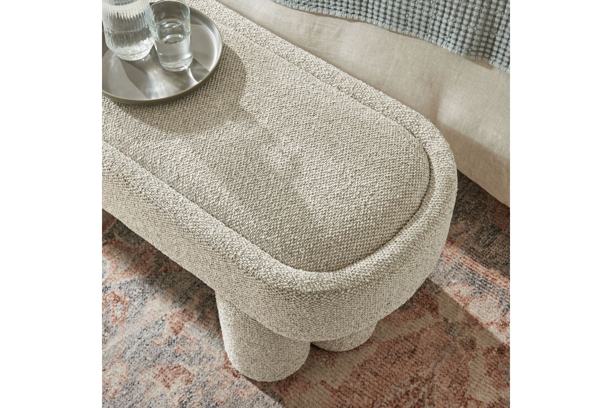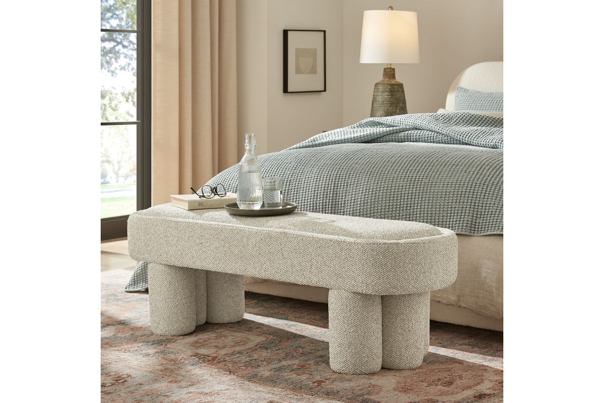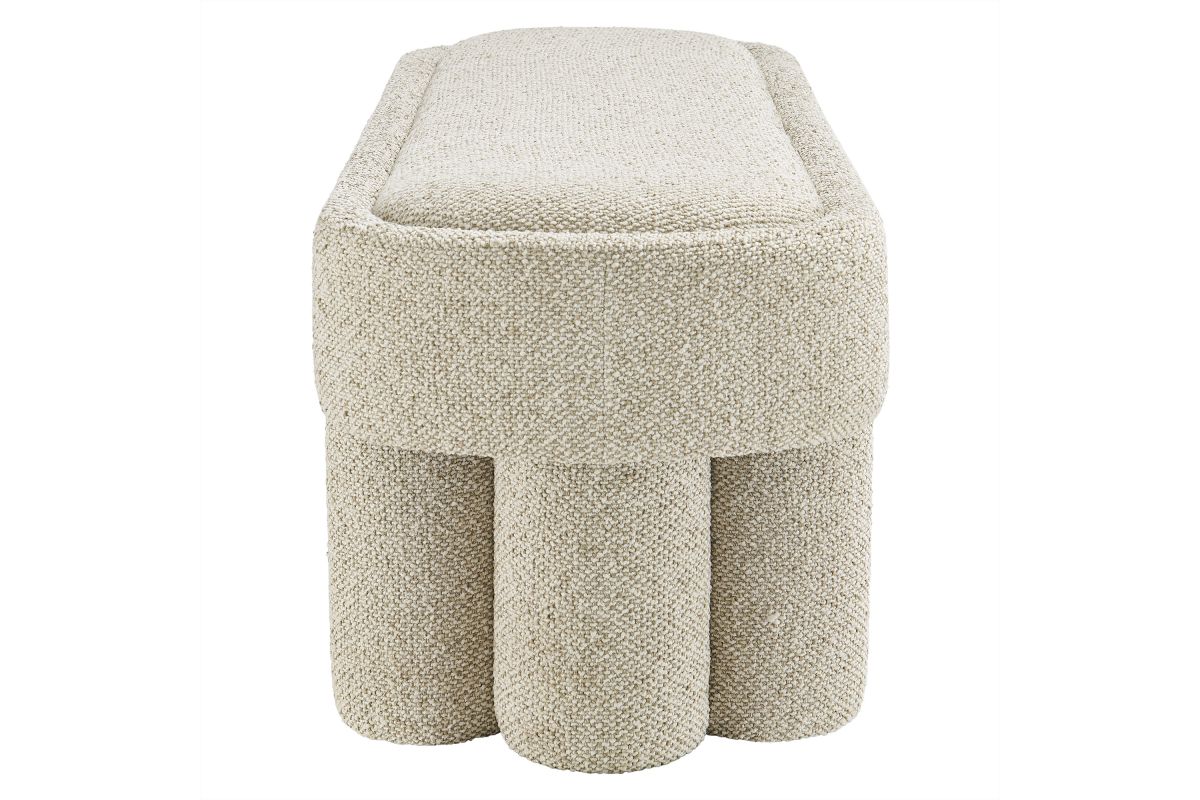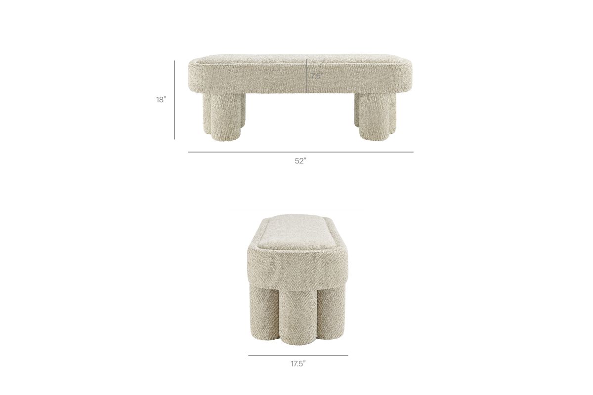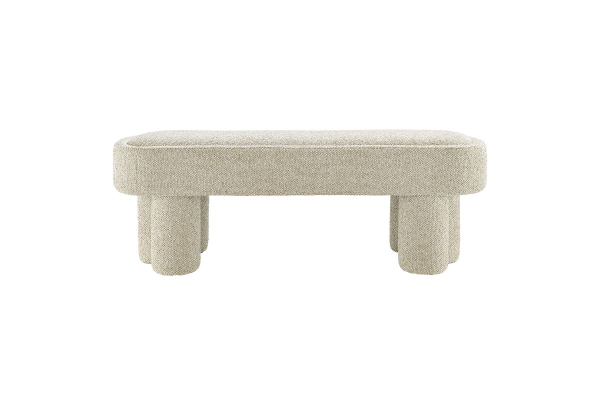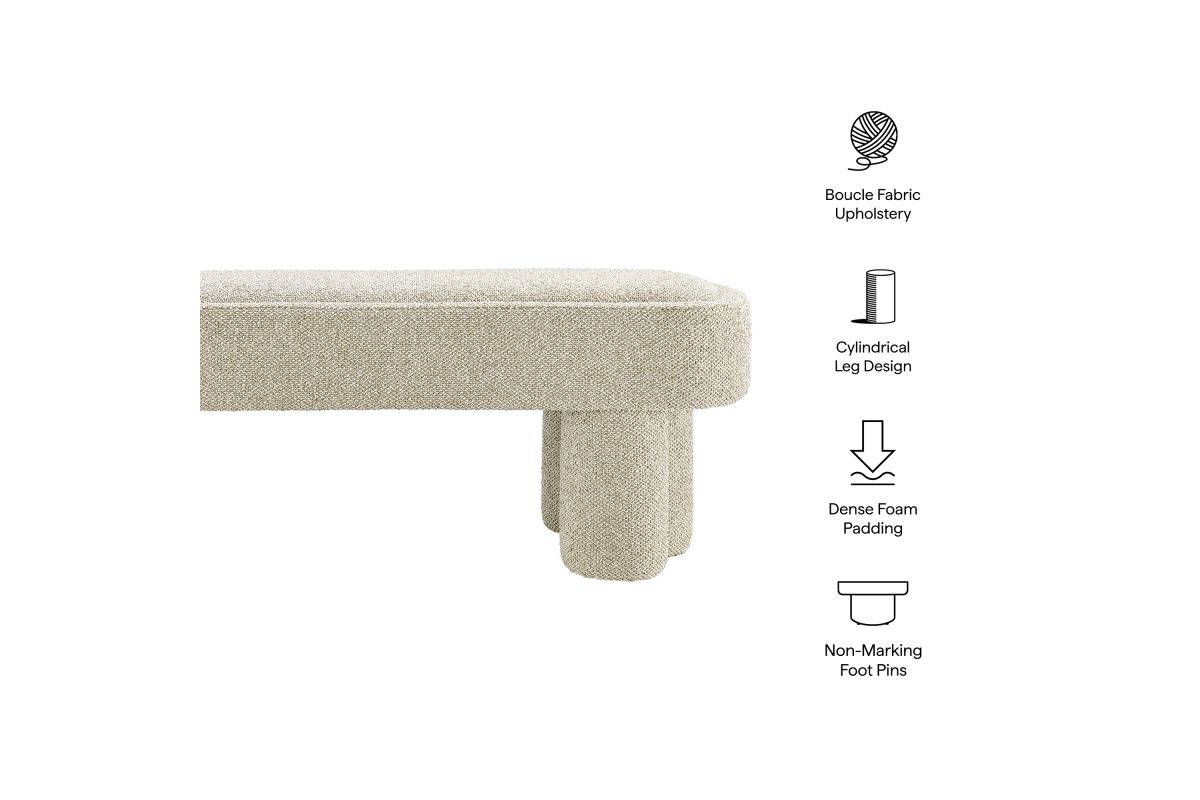 Soft curves and bold geometry define the Mossi Fabric Bench, a modern accent piece with sculptural appeal. Upholstered in boucle fabric, this 52-inch oval bench has a nubby, textured look and an inset seat cushion for added comfort. Resting on cylindrical legs resembling a clover-like base, Mossi makes a striking design statement while providing sturdy support. Whether styled at the end of a bed, in an entryway, or as a lounge bench in the living room, this upholstered boucle bench combines practicality with contemporary artistry. Weight Capacity: 300 lbs.