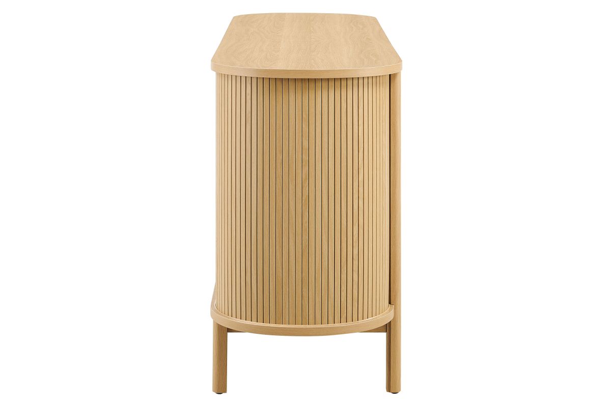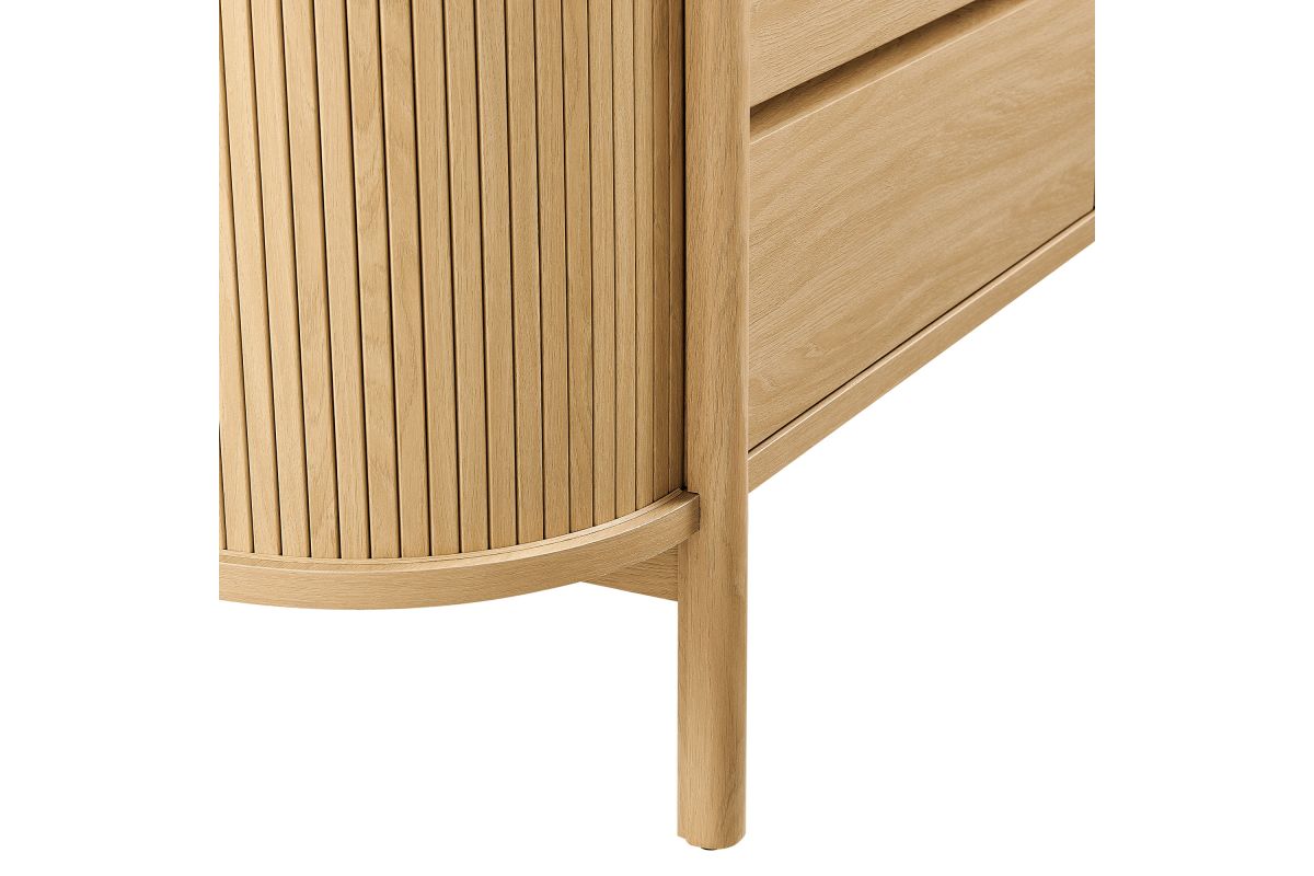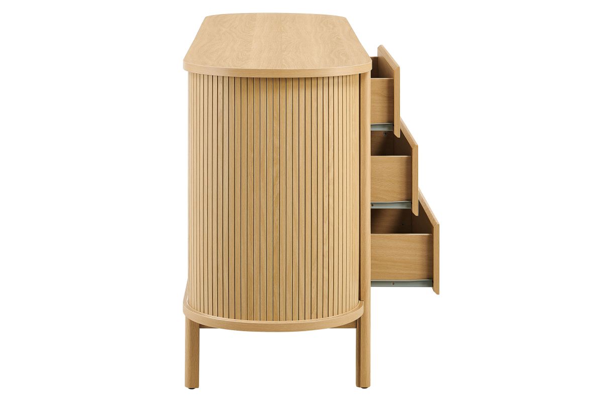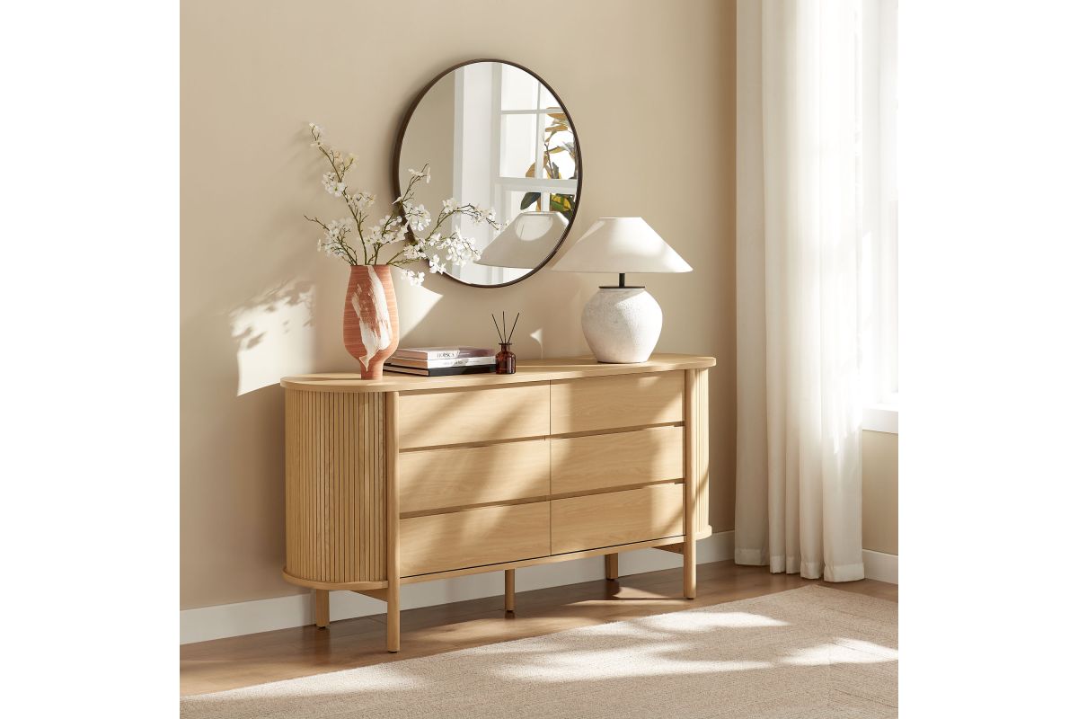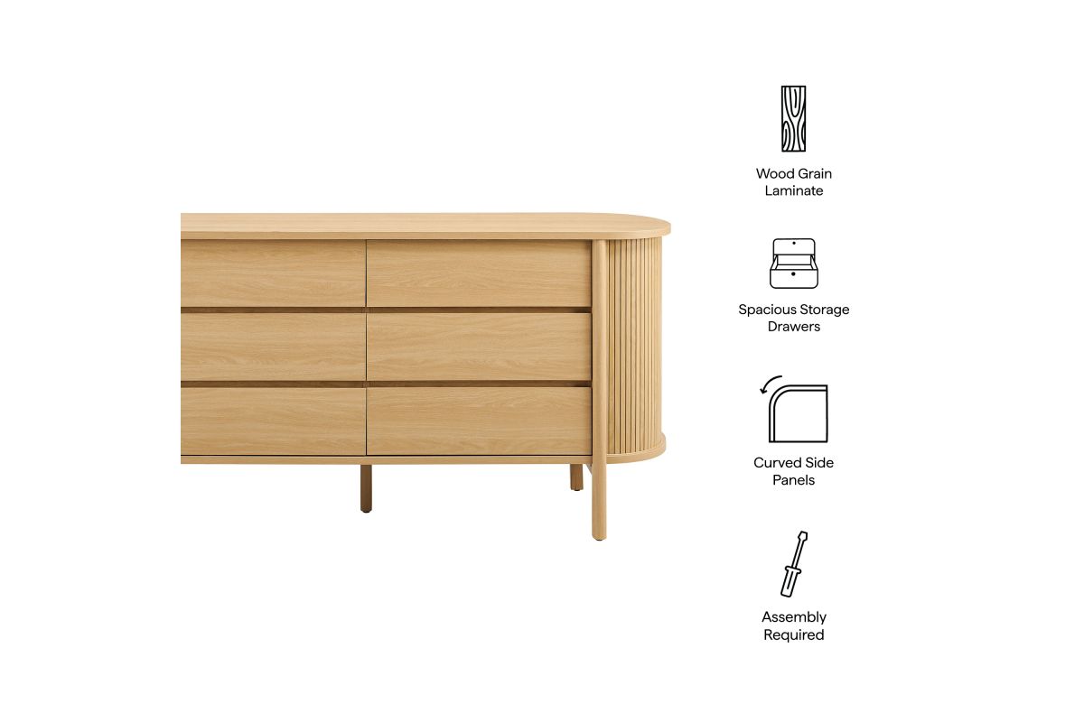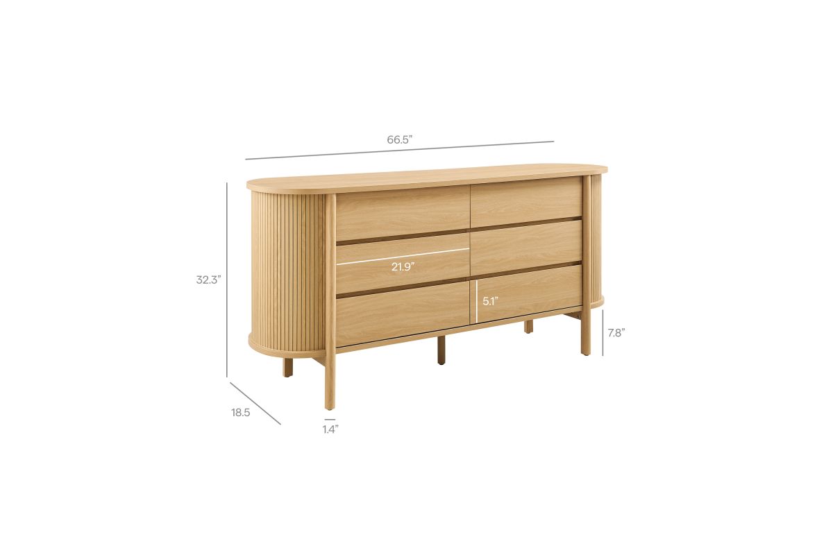 Built with curved side panels and vertical fluted detailing, the Cadence 66 Inch Dresser brings a soft, sculpted look to modern bedroom furniture. Made from a durable wood blend with a smooth finish, the wide chest features six full-size drawers that offer generous storage for clothing, bedding, or accessories, all set on metal glides for easy access. Cylindrical legs and a center support beam provide a sturdy base while keeping the profile light and open. Designed for versatility, Cadence works well as a dresser for closet organization, a dresser TV stand for wall mounted TVs, or as a wide dresser chest for the hallway or living room. It includes non-marking foot pins to help keep floors scuff-free and requires simple assembly. Weight Capacity: Top: 253 lbs; Drawers: 22 lbs each (6 total).