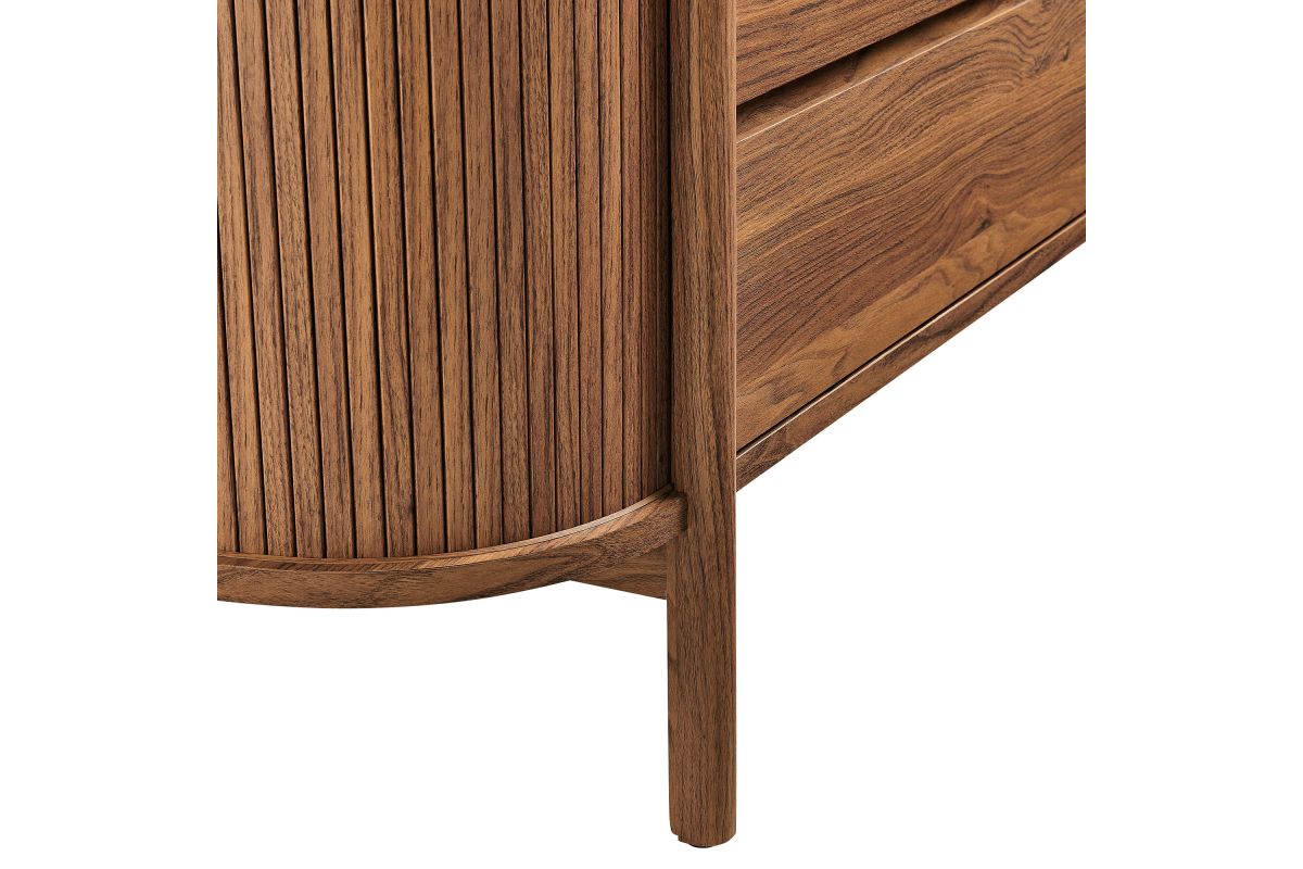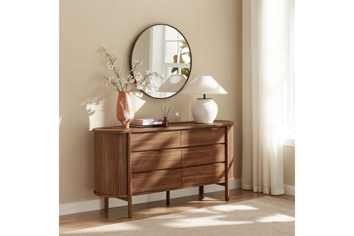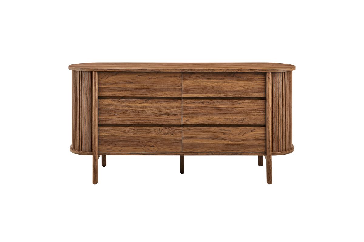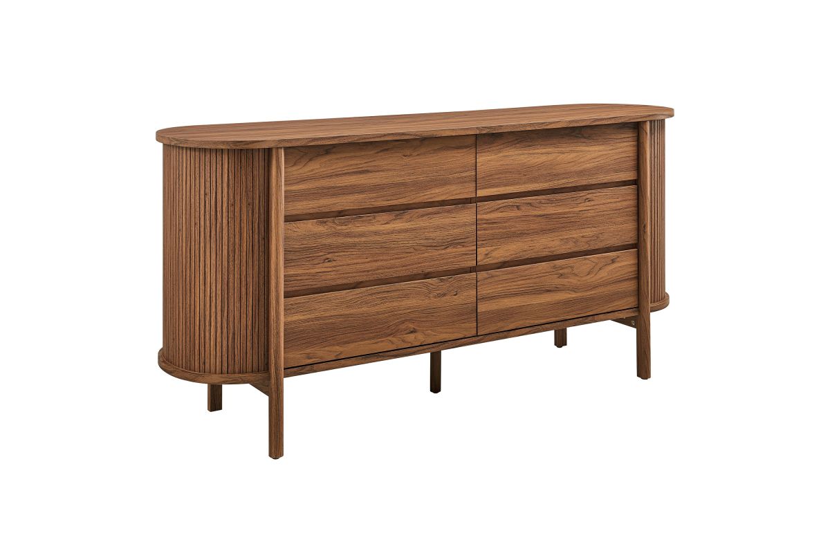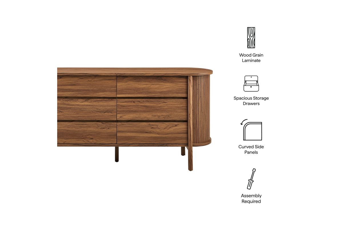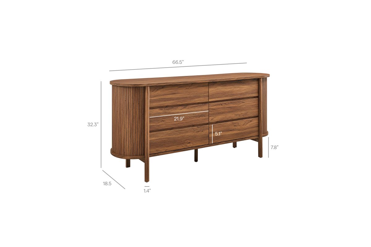 Built with curved side panels and vertical fluted detailing, the Cadence 66 Inch Dresser brings a soft, sculpted look to modern bedroom furniture. Made from a durable wood blend with a smooth finish, the wide chest features six full-size drawers that offer generous storage for clothing, bedding, or accessories, all set on metal glides for easy access. Cylindrical legs and a center support beam provide a sturdy base while keeping the profile light and open. Designed for versatility, Cadence works well as a dresser for closet organization, a dresser TV stand for wall mounted TVs, or as a wide dresser chest for the hallway or living room. It includes non-marking foot pins to help keep floors scuff-free and requires simple assembly. Weight Capacity: Top: 253 lbs; Drawers: 22 lbs each (6 total).