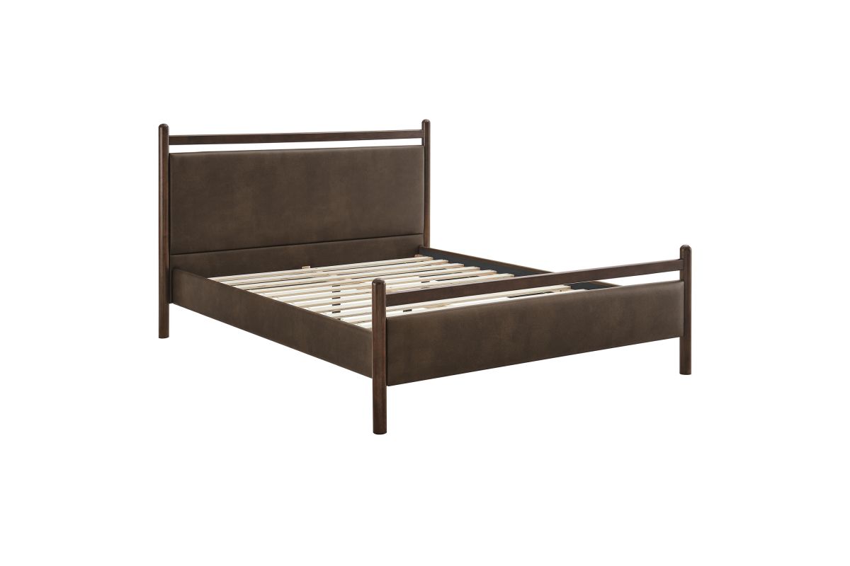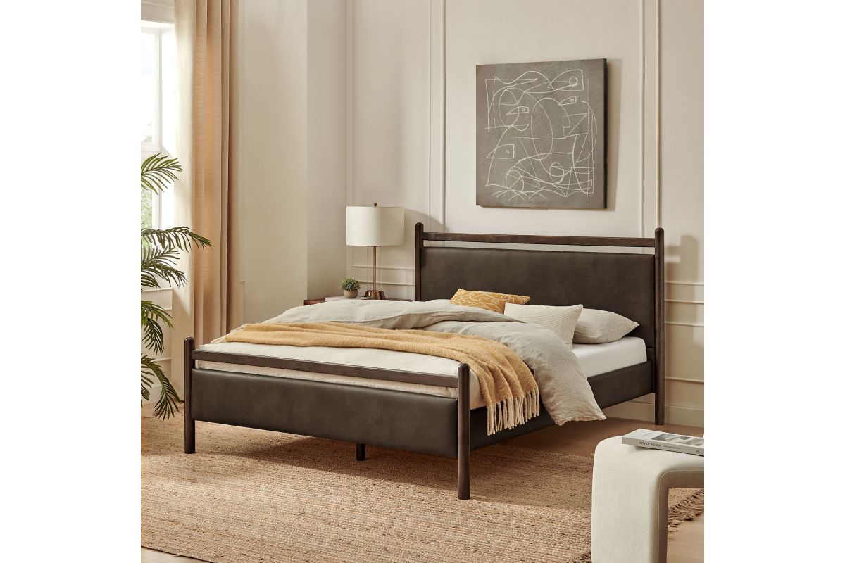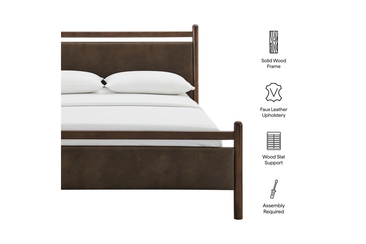 Refresh a primary or guest bedroom with the Ginny Queen Size Vegan Leather Platform Bed, a clean, modern profile built on a solid wood frame with a cushioned faux leather headboard and footboard for a supportive, lounge-comfort feel. Smooth lines keep the look light, while padded touchpoints invite reading, relaxing, and easy wind-downs. A durable wood slat support system provides a sturdy, well-ventilated base for your queen mattress—no box spring needed—making setup simple and the sleep surface comfortable night after night. Designed to mix with a range of bedding and decor, Ginny delivers a tidy, pulled-together look from day one. Assembly required.