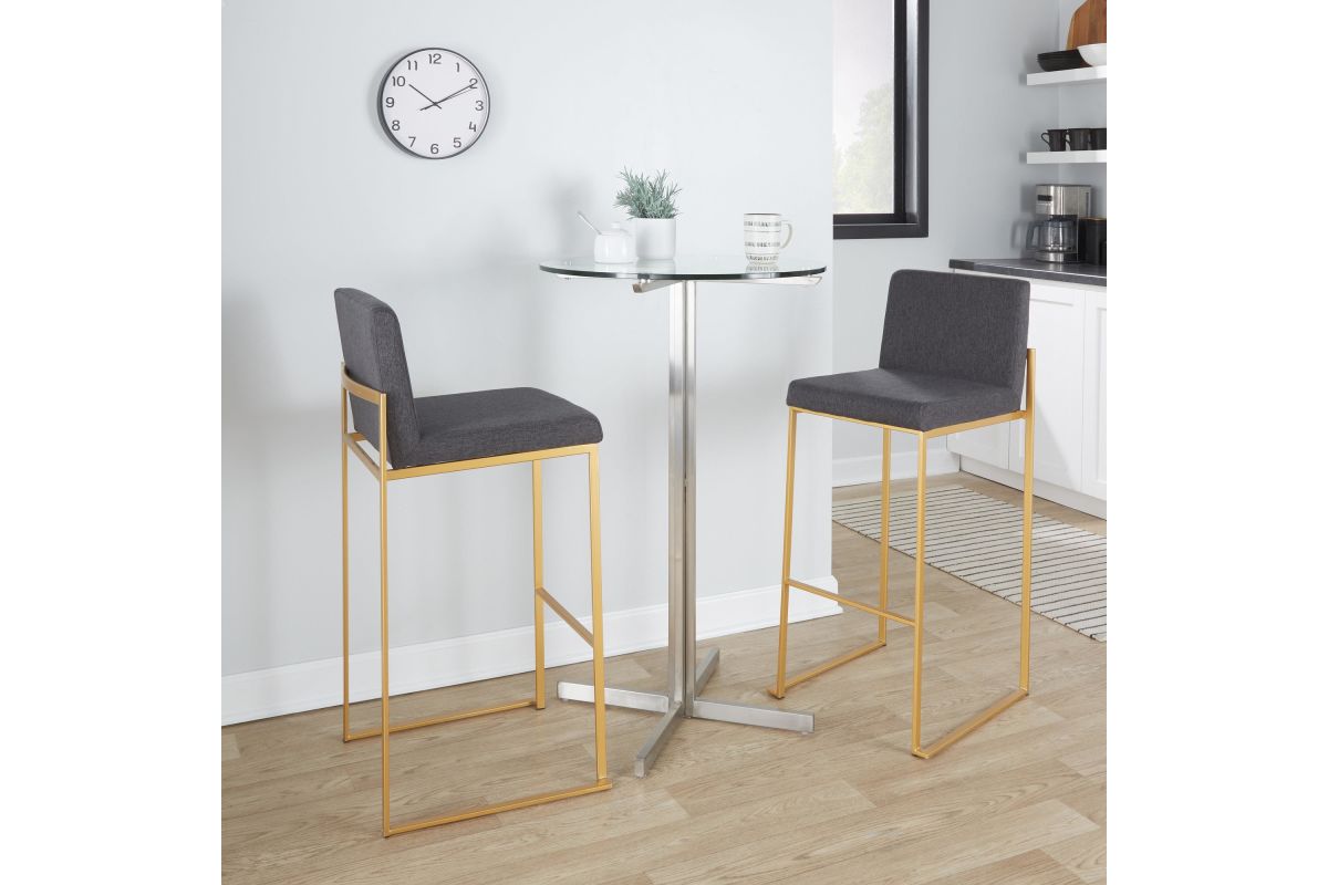 Modern elegance at its finest, the Fuji High Back Bar Stool by LumiSource features an extra-wide (and extra comfortable) upholstered seat, a high padded backrest, and a stylish metal frame. The perfect contemporary bar stool, the Fuji is available in a stainless steel, gold, or black metal frame and comes in a variety of sleek upholstery colors.