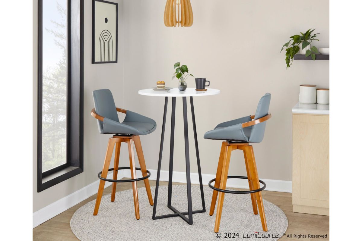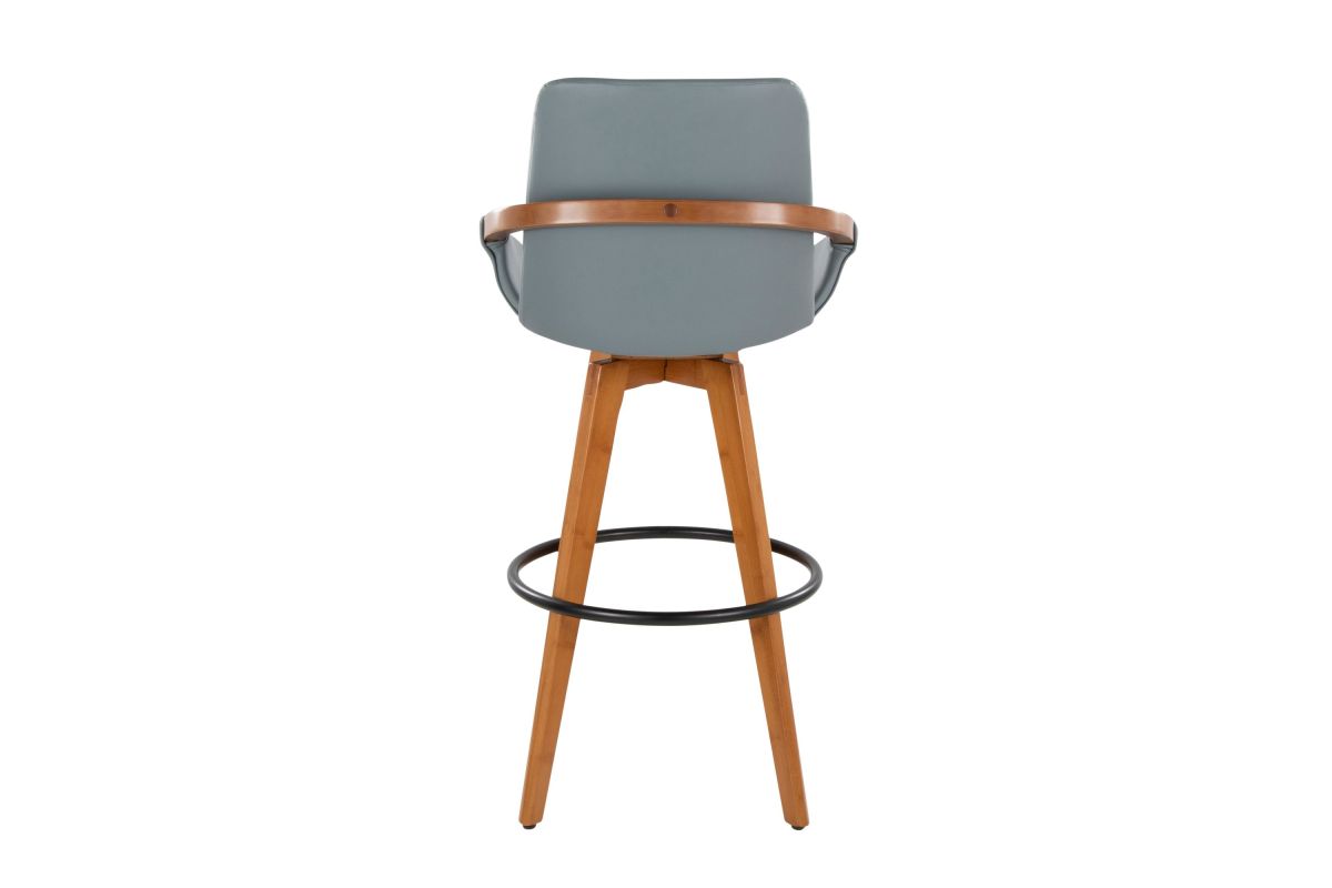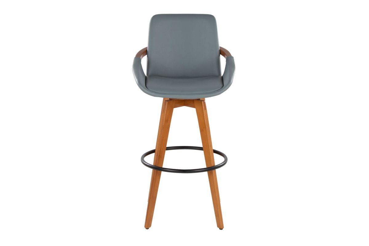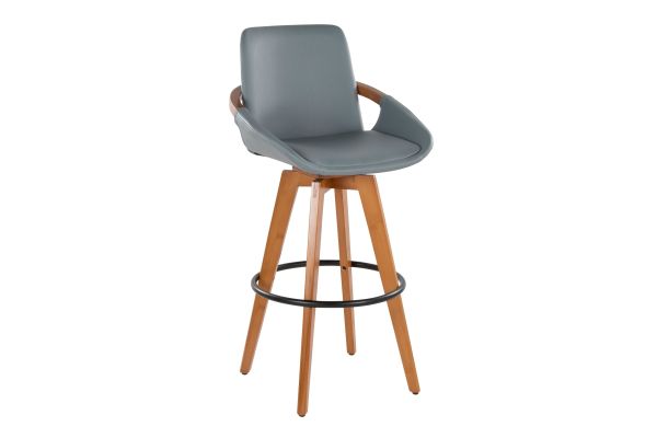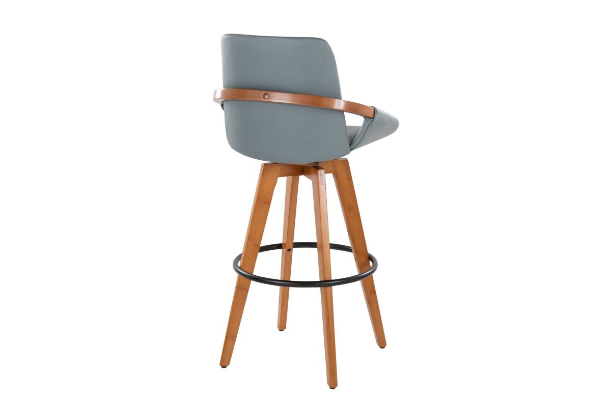 Mid-Century inspired, the Cosmo Fixed-Height Bar Stool by LumiSource combines style and comfort! A faux leather seat is accented by stylish walnut bamboo armrest and legs, with smooth swivel capability. Available in a variety of color combinations, choose the one that fits your space the best.