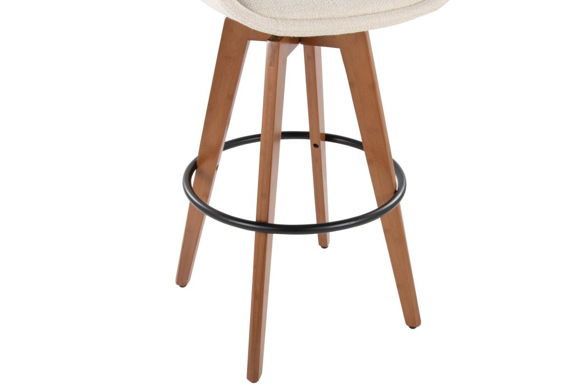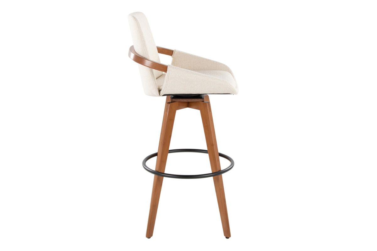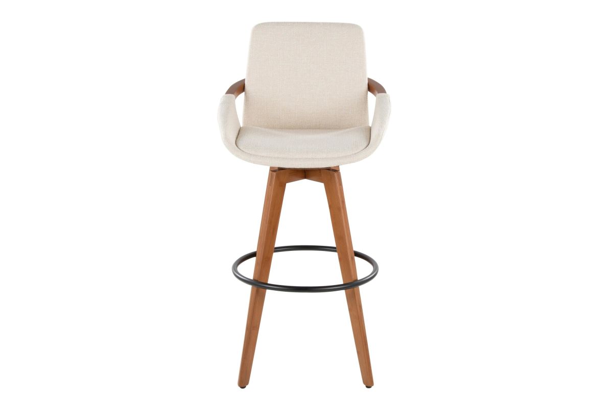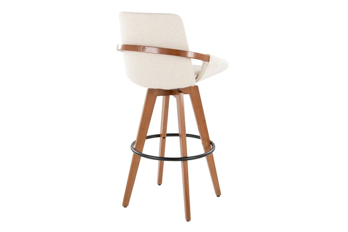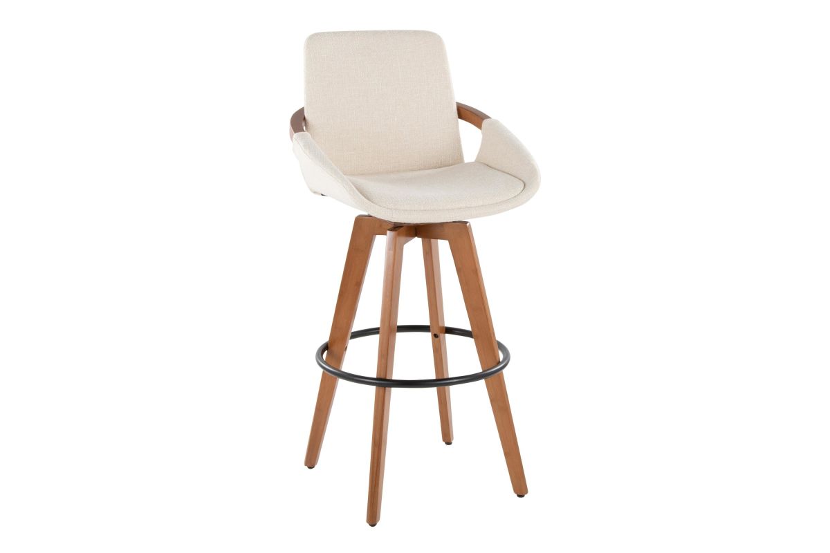 Mid-Century inspired, the Cosmo Fixed-Height Barstool by LumiSource combines style and comfort! An upholstered seat is accented by stylish walnut bamboo armrest and legs, with smooth swivel capability. Available in a variety of color combinations, choose the one that fits your space the best.