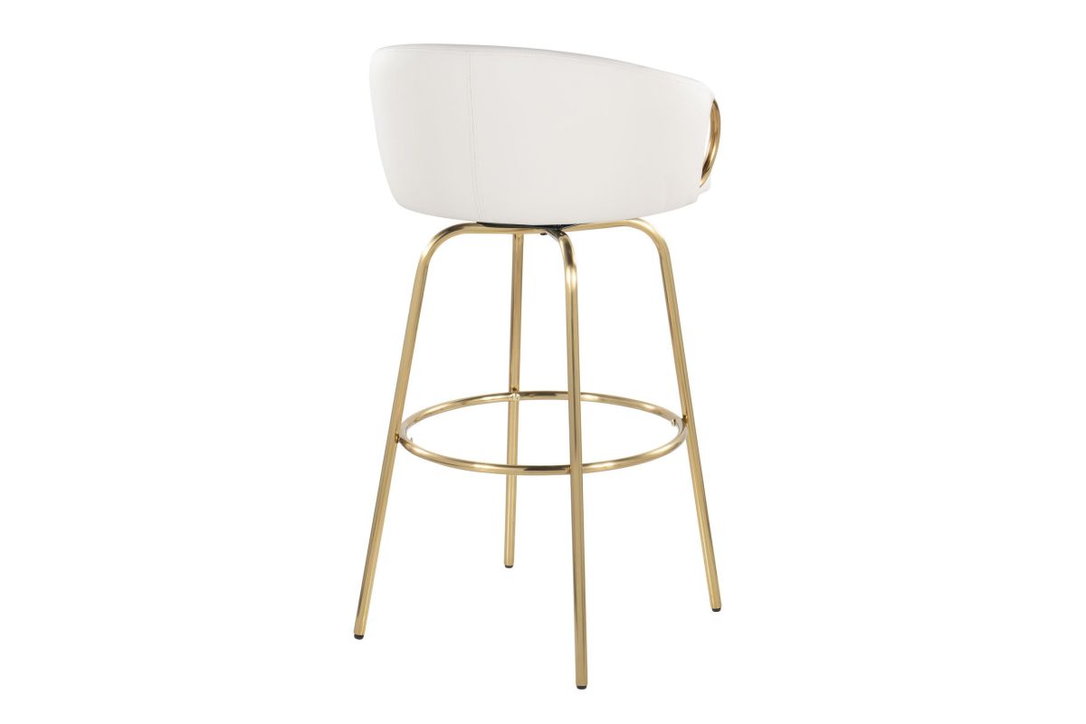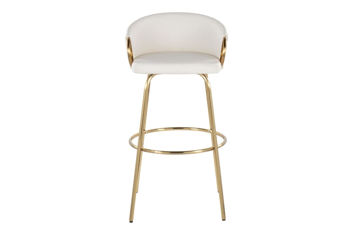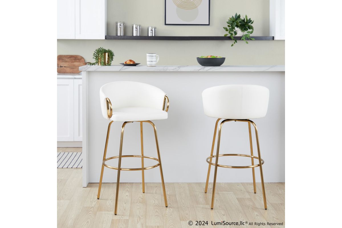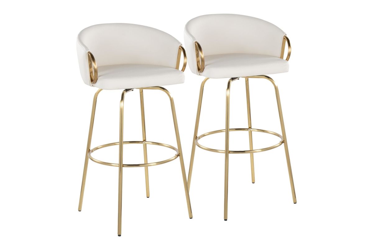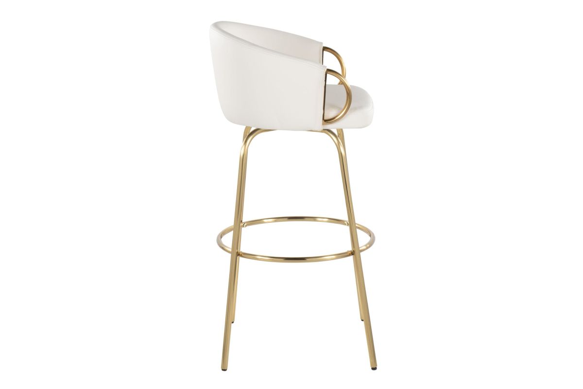 Chic modern style shines bright with the unique design of the Claire Fixed-Height Barstool by LumiSource. With a rounded and low backrest, sleek metal armrests and frame, it's the perfect piece for your contemporary bar area. The Claire Barstool has smooth swivel capability with plush upholstery. Available in various bold colors.