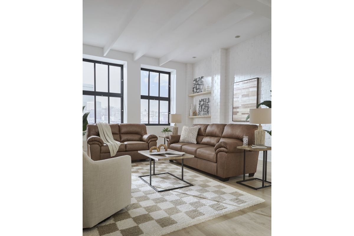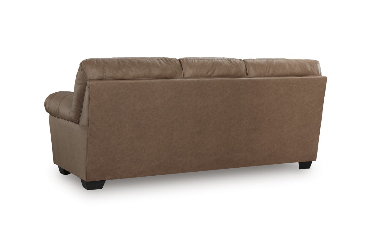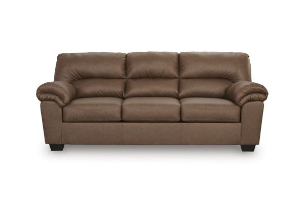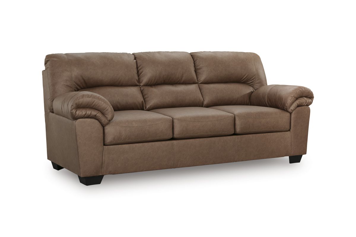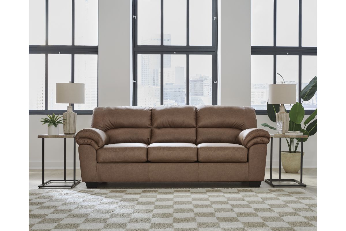 Modern comfort never looked so good. Sporting supremely soft yet durable cushions accented with high-fashion jumbo stitching, this stunning sofa is the ultimate choice in comfortably cool, contemporary style. Its caramel-hued faux leather indulges with an upscale feel and wows like the real thing.