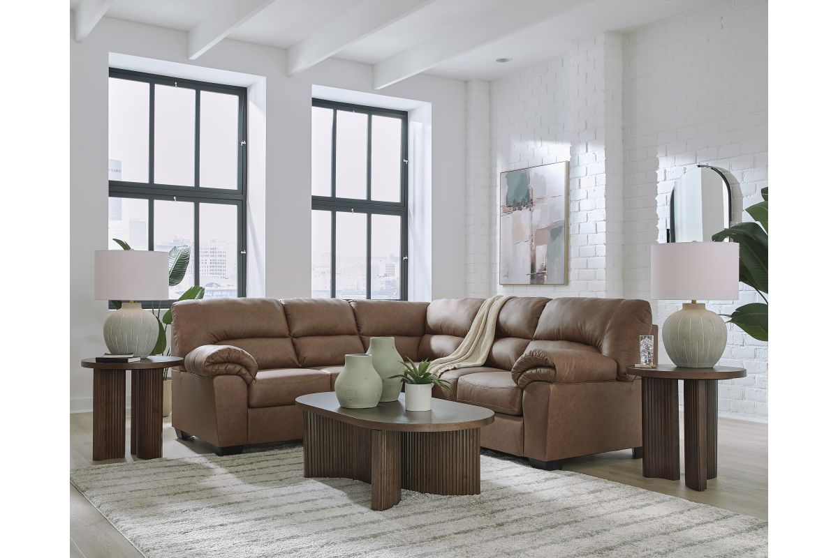 Modern comfort never looked so good. Sporting supremely soft yet durable cushions accented with high-fashion jumbo stitching, this stunning sectional is the ultimate choice in comfortably cool, contemporary style. Its caramel-hued faux leather indulges with an upscale feel and wows like the real thing.