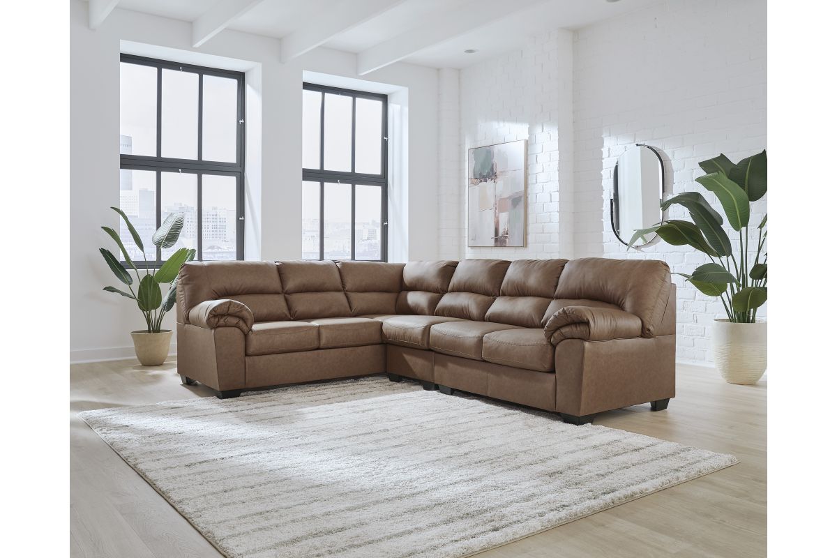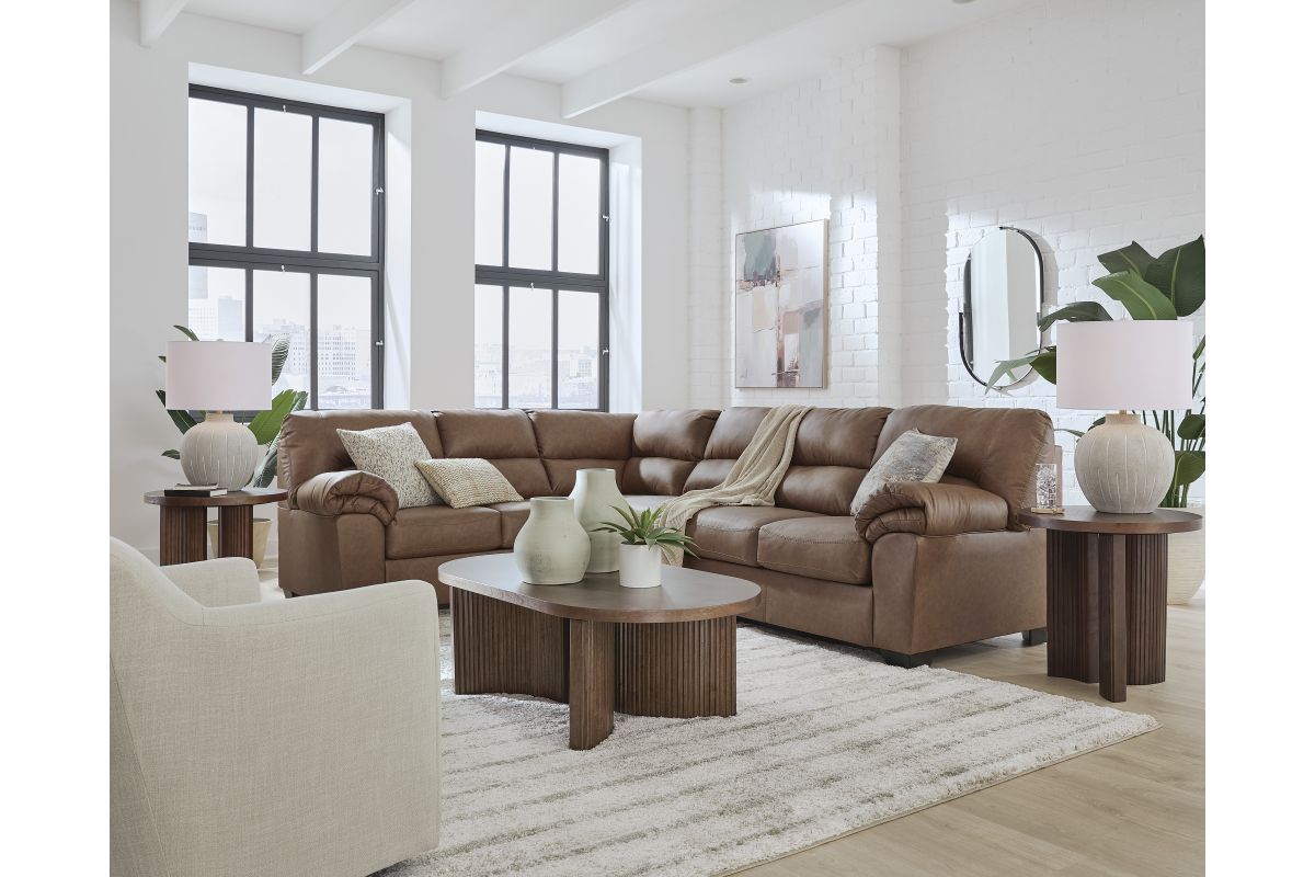 Modern comfort never looked so good. Sporting supremely soft yet durable cushions accented with high-fashion jumbo stitching, this stunning sectional is the ultimate choice in comfortably cool, contemporary style. Its caramel-hued faux leather indulges with an upscale feel and wows like the real thing.
