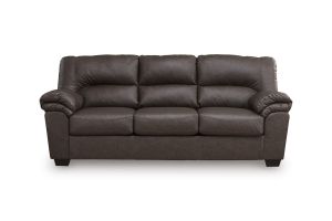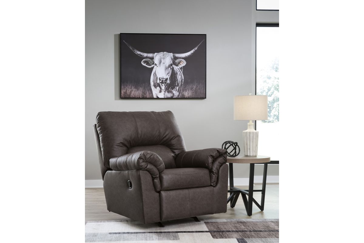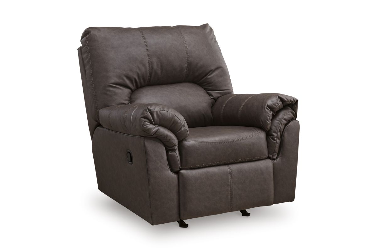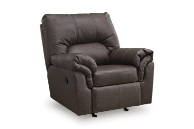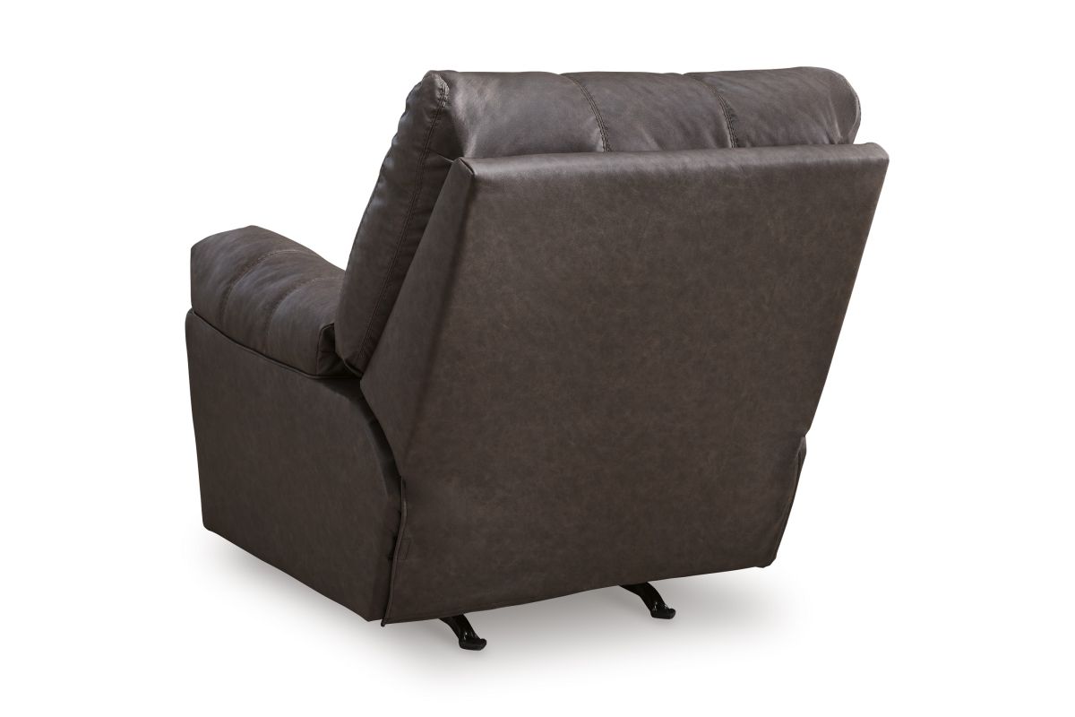 Modern comfort never looked so good. Sporting supremely soft yet durable cushions accented with high-fashion jumbo stitching, this stunning rocker recliner is the ultimate choice in comfortably cool, contemporary style. Its umber-hued faux leather indulges with an upscale feel and wows like the real thing. And the recliner's pull-tab reclining makes it easy to kick back and relax.