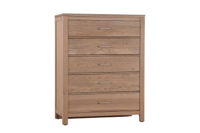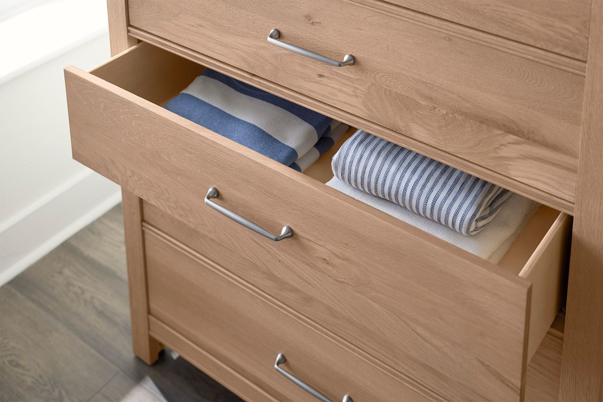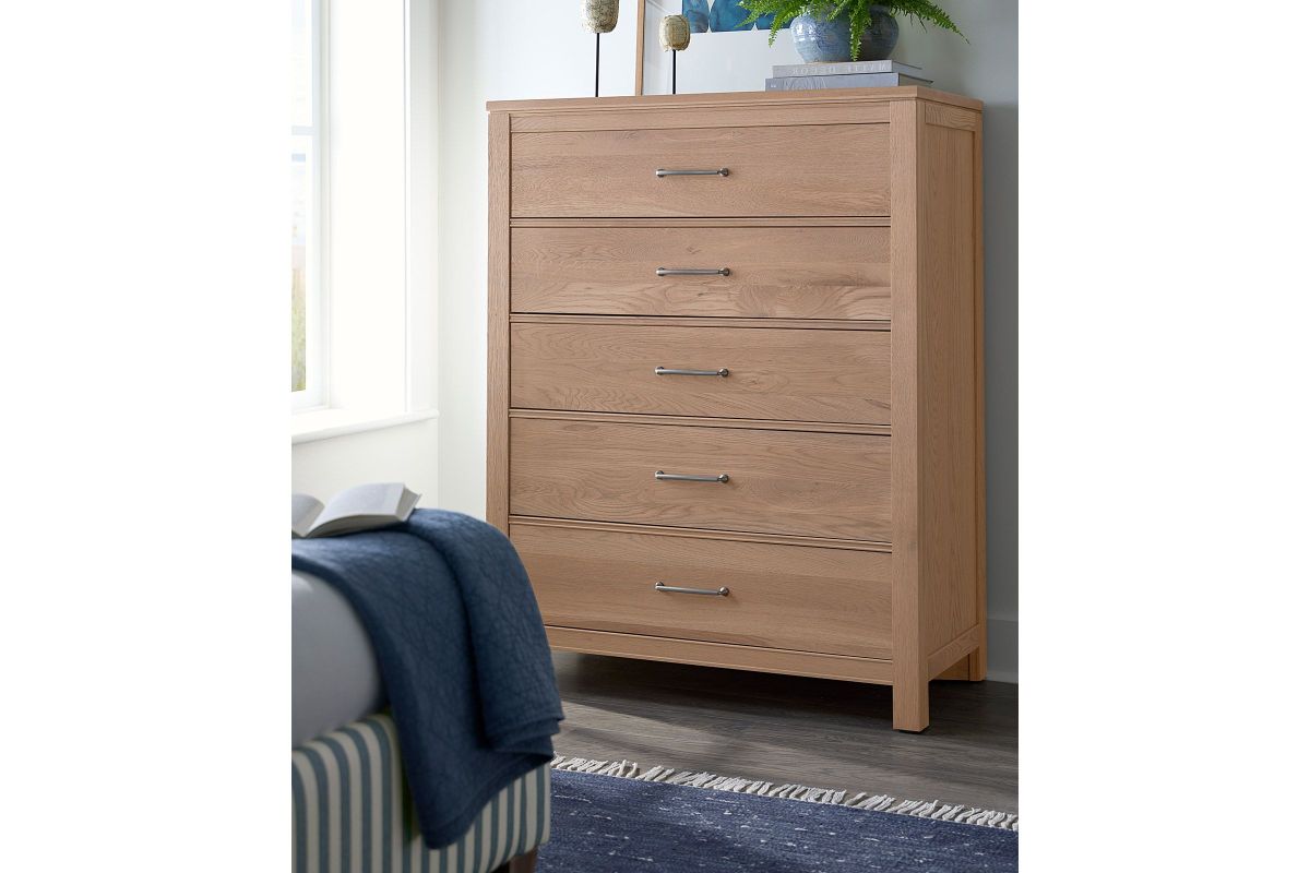 5 drawer chest features a modern reveal beneath the top and classic beaded rails; blending contemporary and traditional design