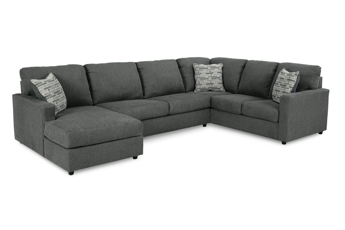 Contemporary fashion, meet superior form. This sectional with chaise is strikingly streamlined with its track arms. Cozy cushions invite superior relaxation, while handsome charcoal upholstery speaks to tried-and-true modern color palettes. Simply kick back, relax and settle into the calm of your curated space.
