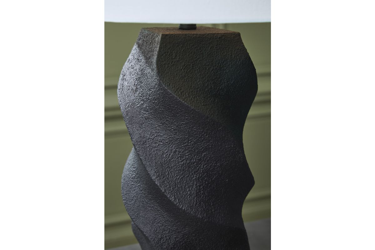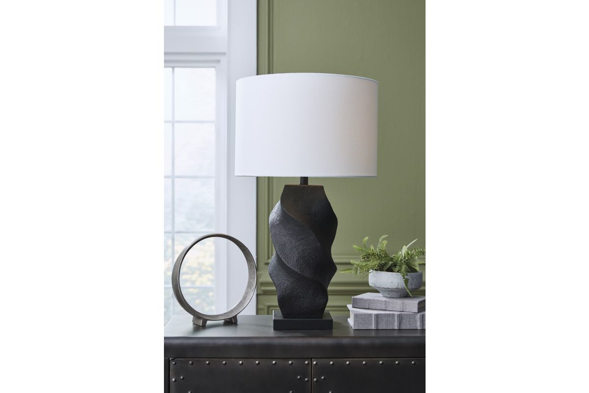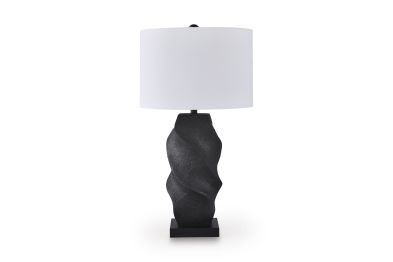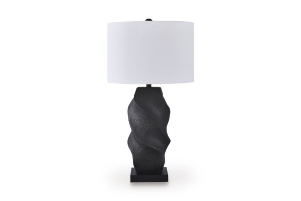 This table lamp puts a chic twist on casual lighting. Its base draws the eye in with a rich sense of movement, while the classic black finish has the versatility to pair with a variety of styles. Place it on a desk or end table for instant functional flair.