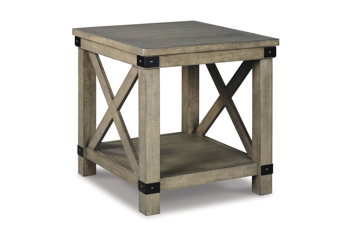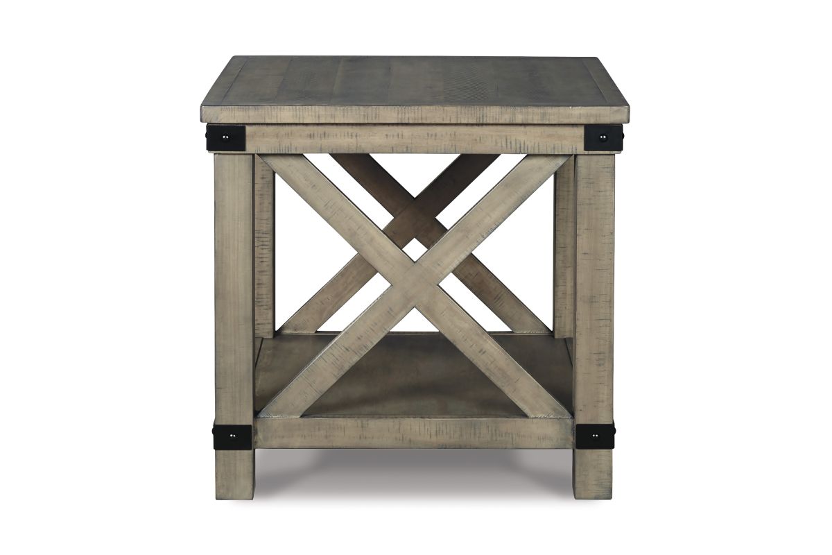 Crafted with solid pine wood treated to a weathered gray finish, this end table is rustic farmhouse living at its best. Crossbuck styling adds striking flair. Metal industrial brackets incorporate an industrial twist.