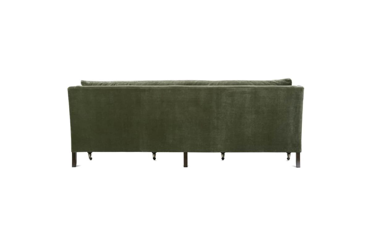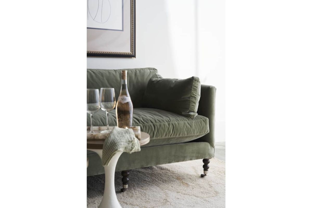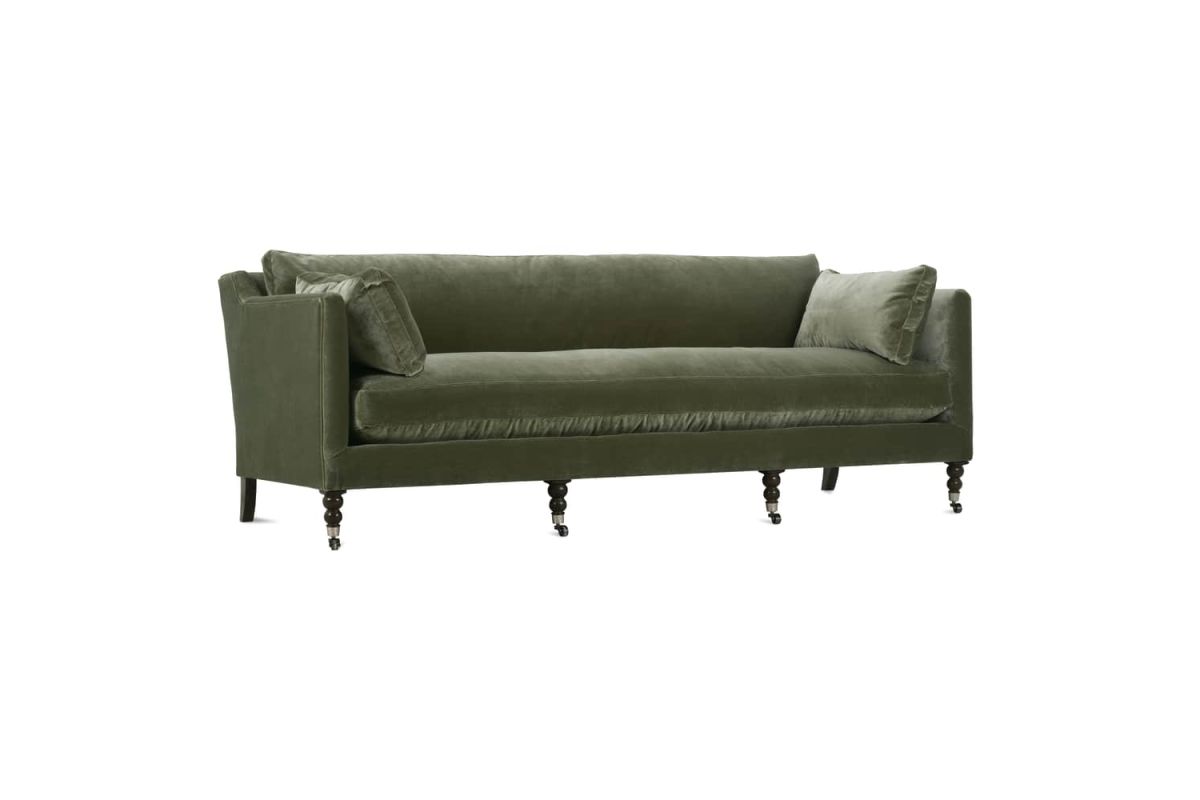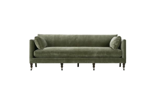 The Madeline Sofa is designed for comfort, with transitional, elegant styling. Features include lush green velvet and stylish spool legs with pewter casters