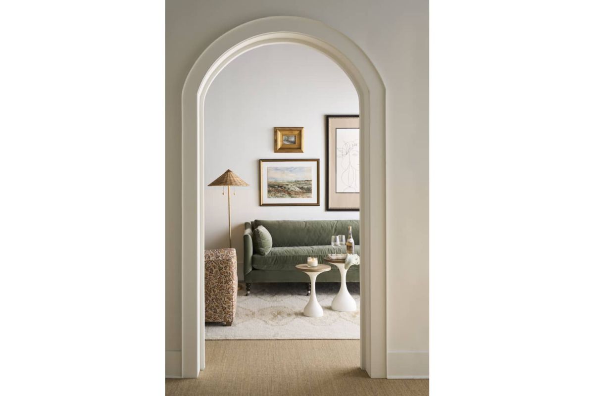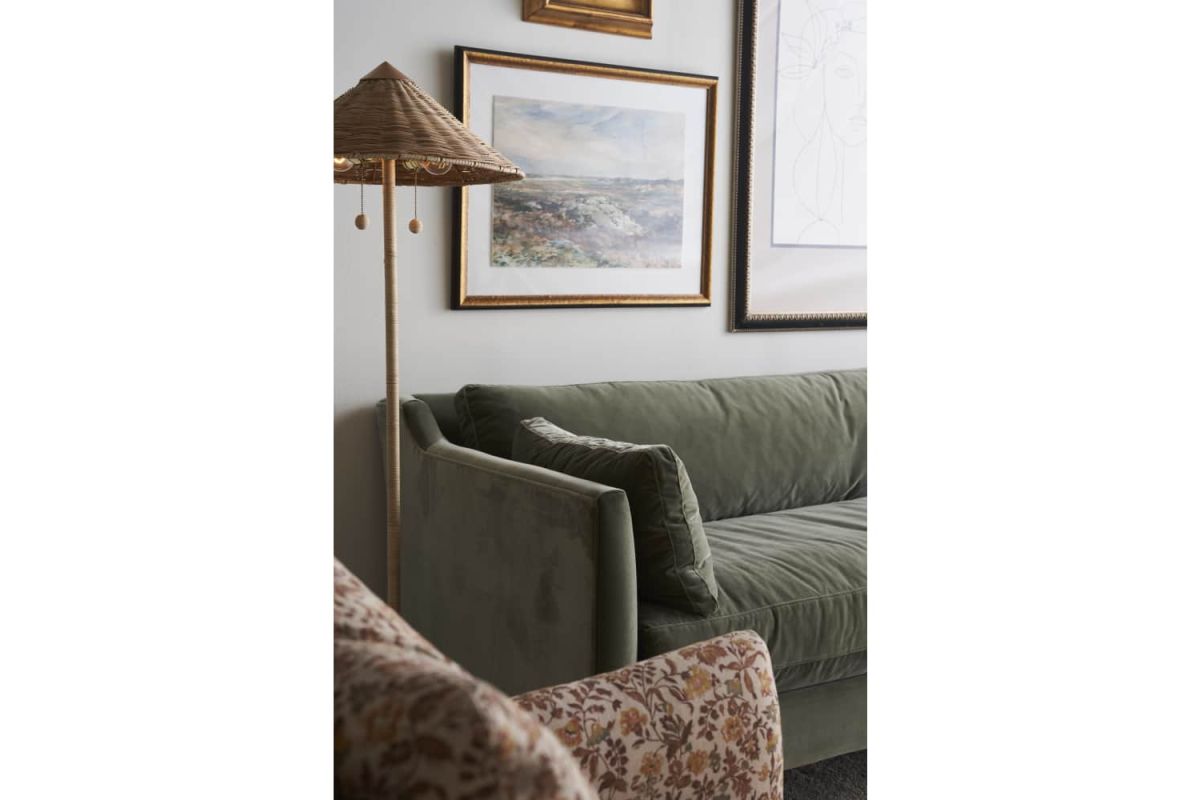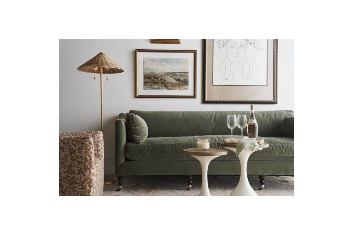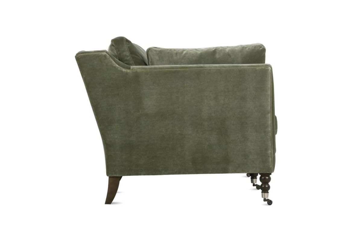 The Madeline Sofa is designed for comfort, with transitional, elegant styling. Features include lush green velvet and stylish spool legs with pewter casters